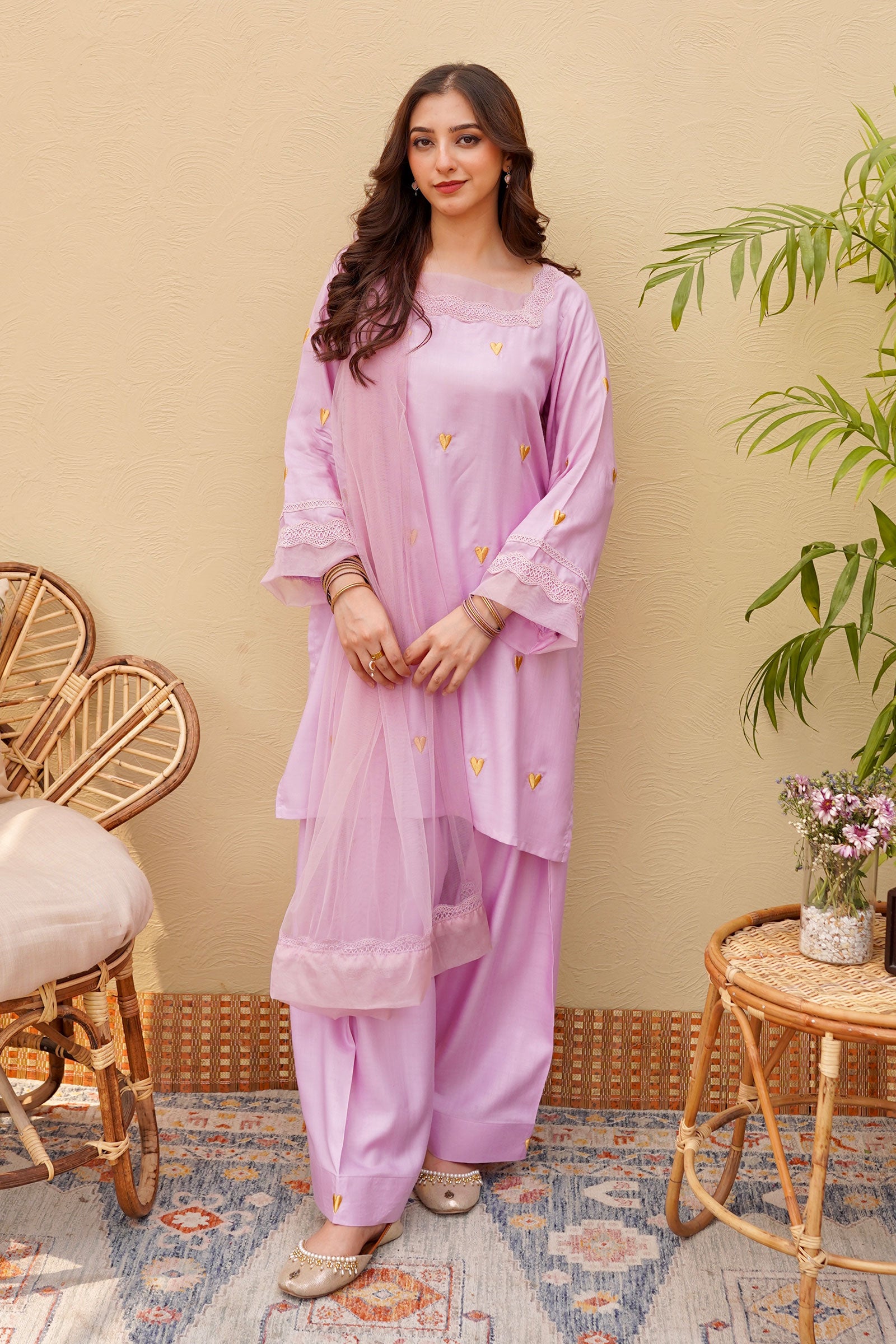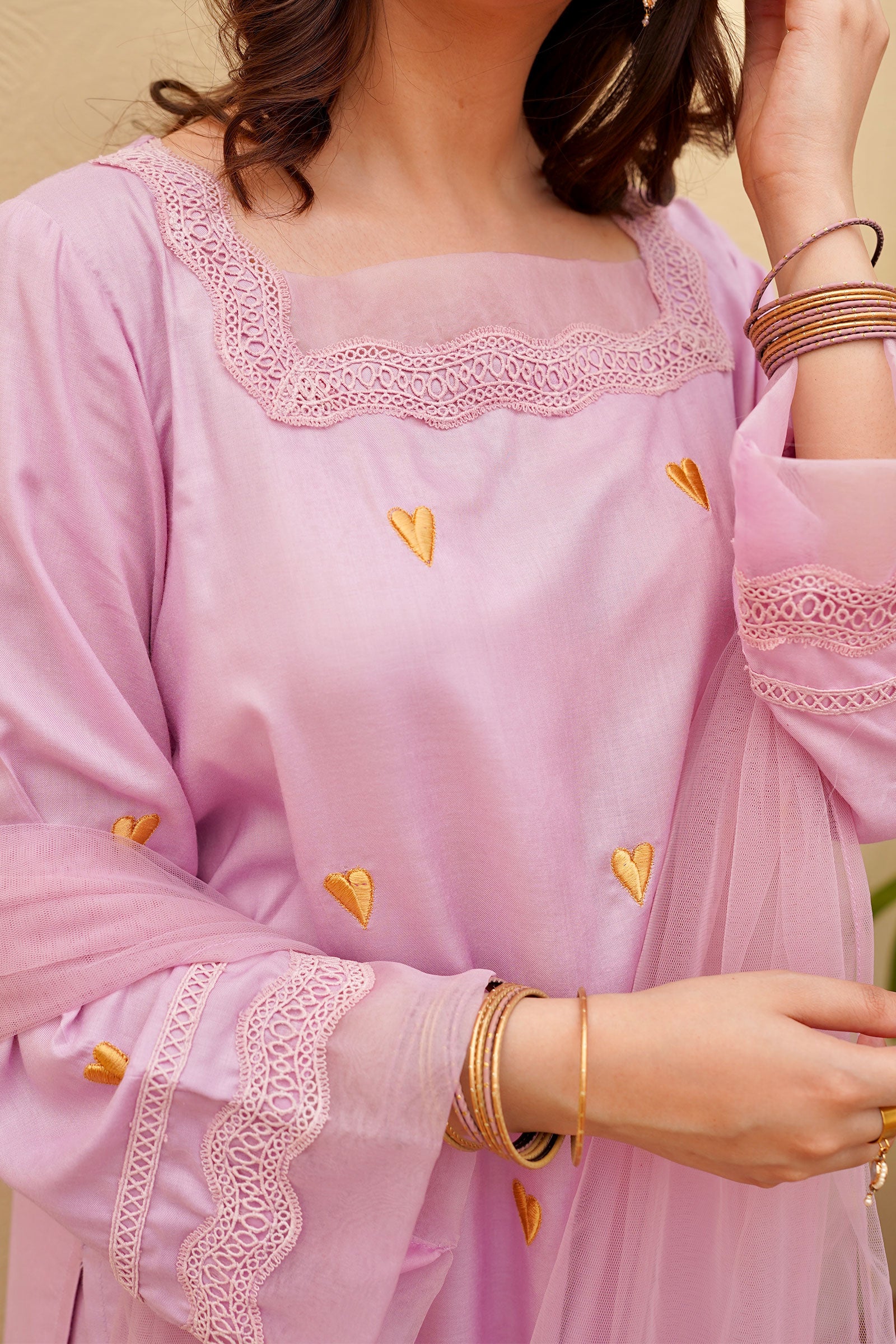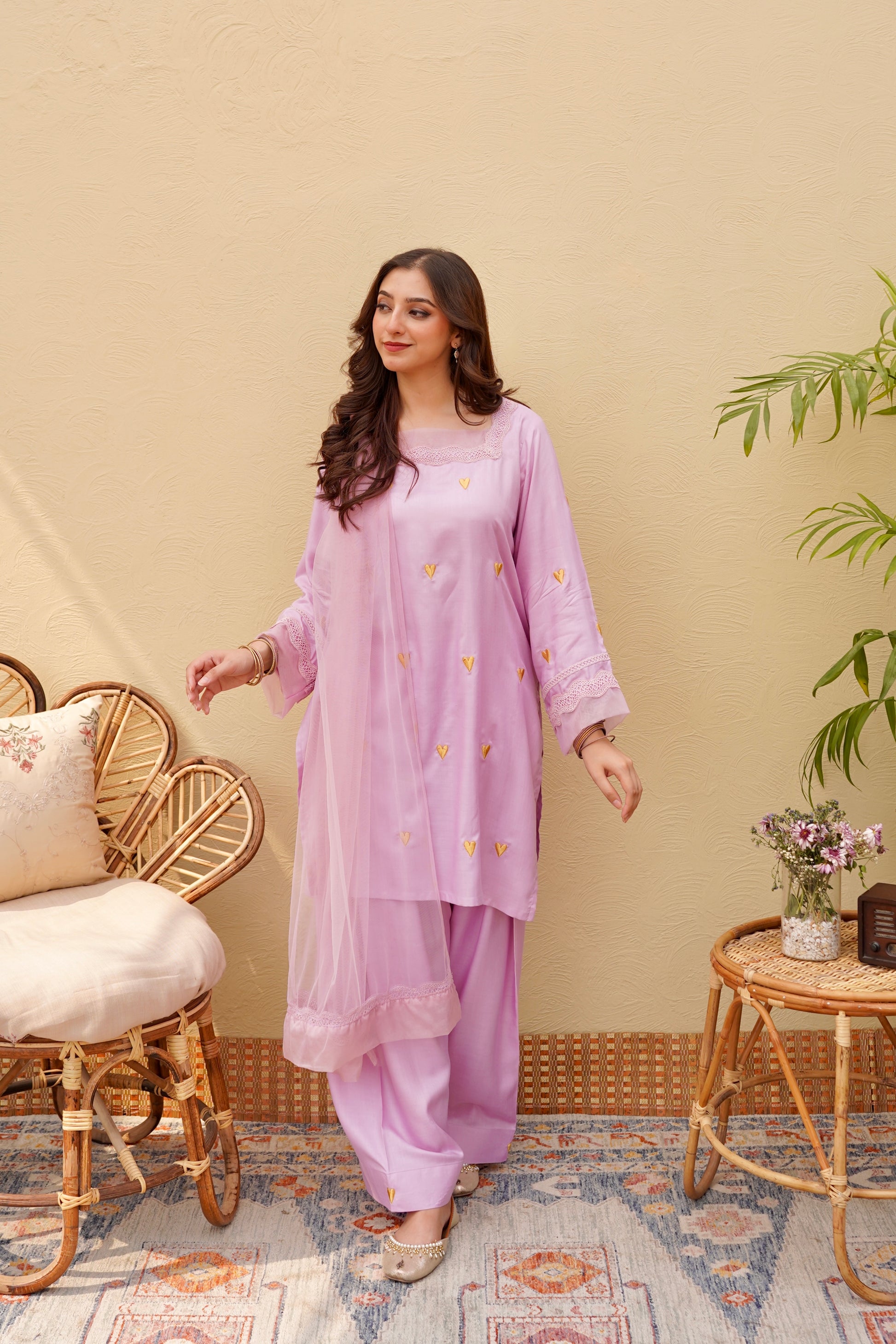 The perfectl lilac girl aesthetic dress, adorned with butter yellow hearts and delicate lace details on the neckline and sleeves. Paired with a khari shalwar featuring intricate heart embroidery and a matching dupatta for a dreamy, feminine look.