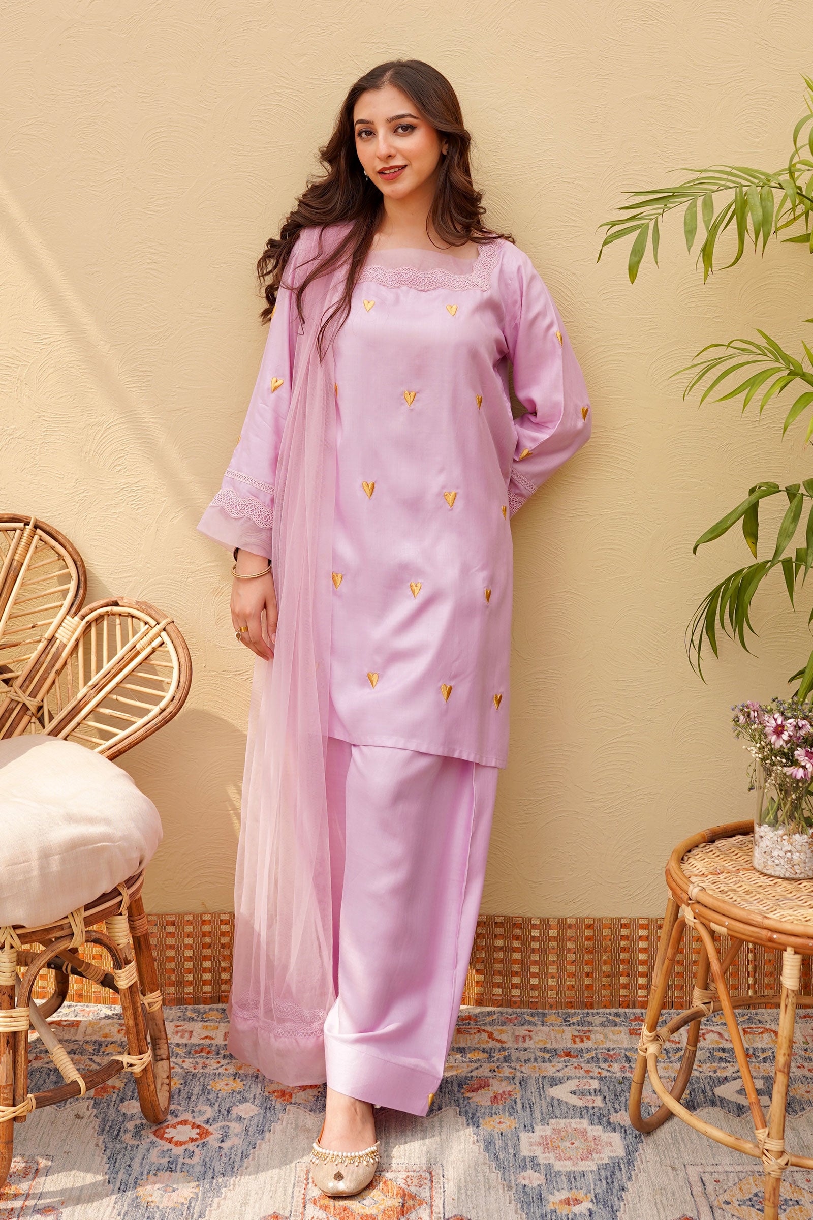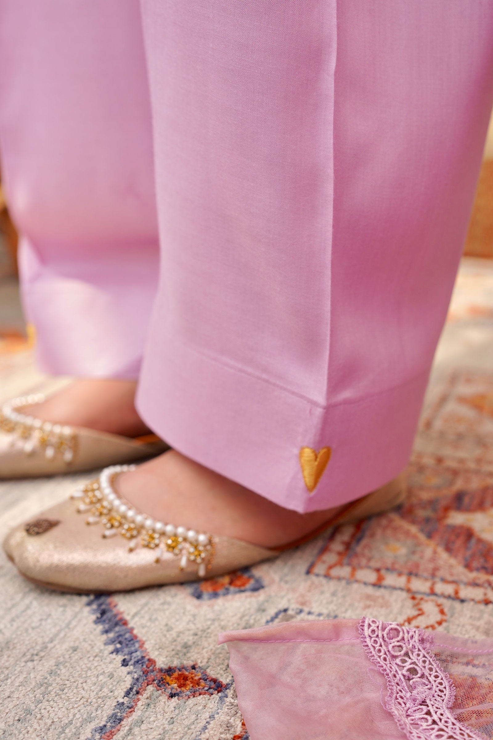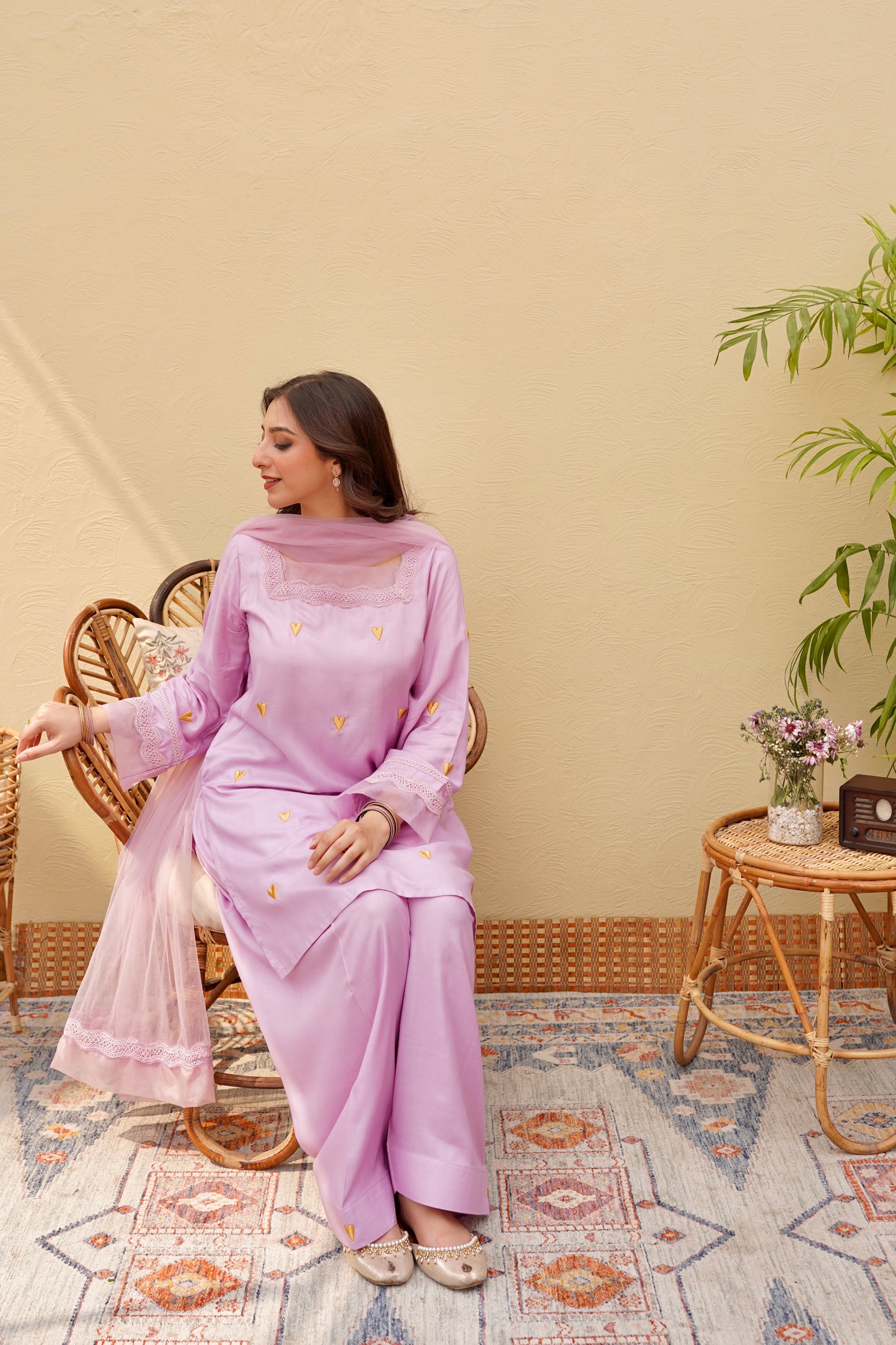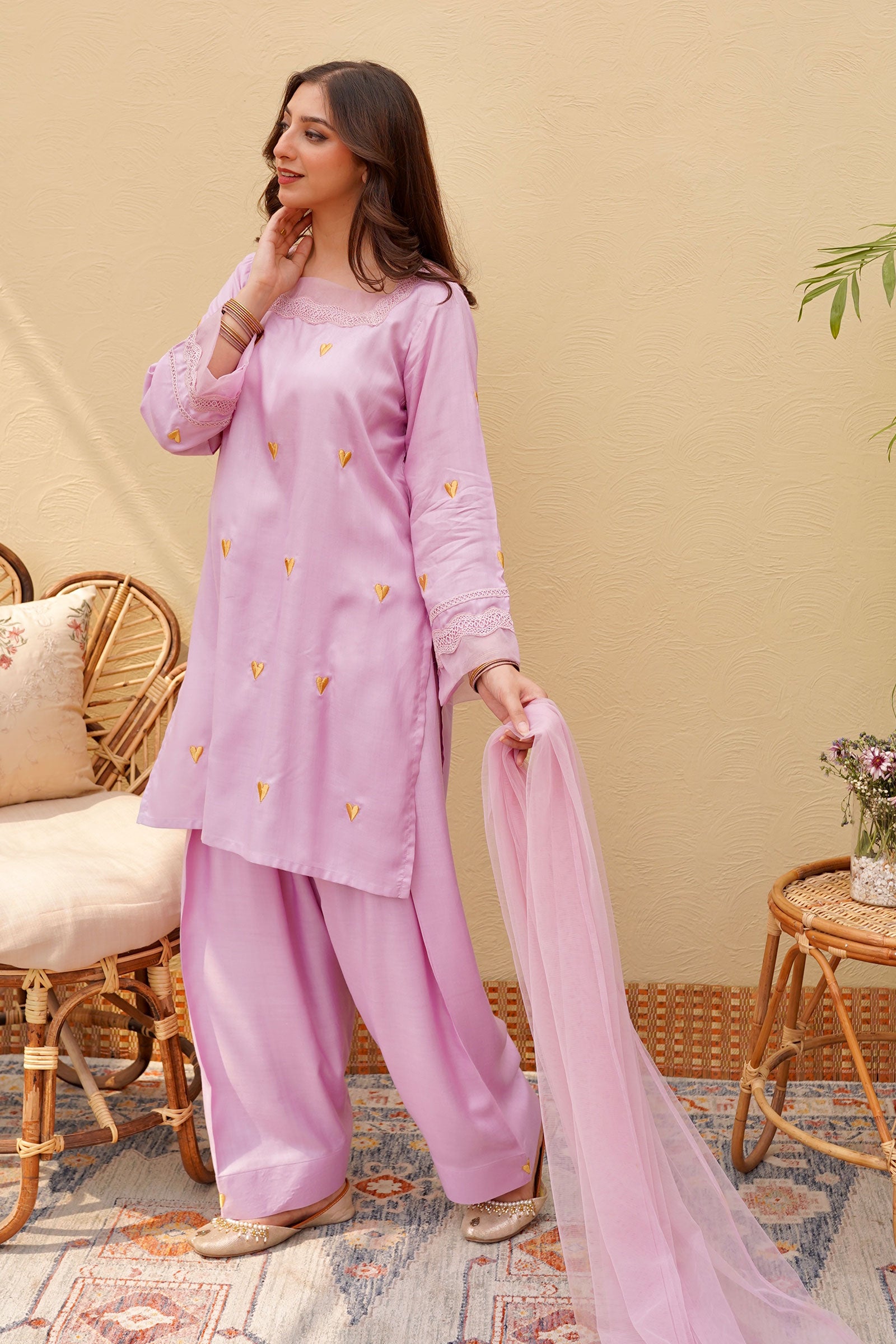 The perfectl lilac girl aesthetic dress, adorned with butter yellow hearts and delicate lace details on the neckline and sleeves. Paired with a khari shalwar featuring intricate heart embroidery and a matching dupatta for a dreamy, feminine look.