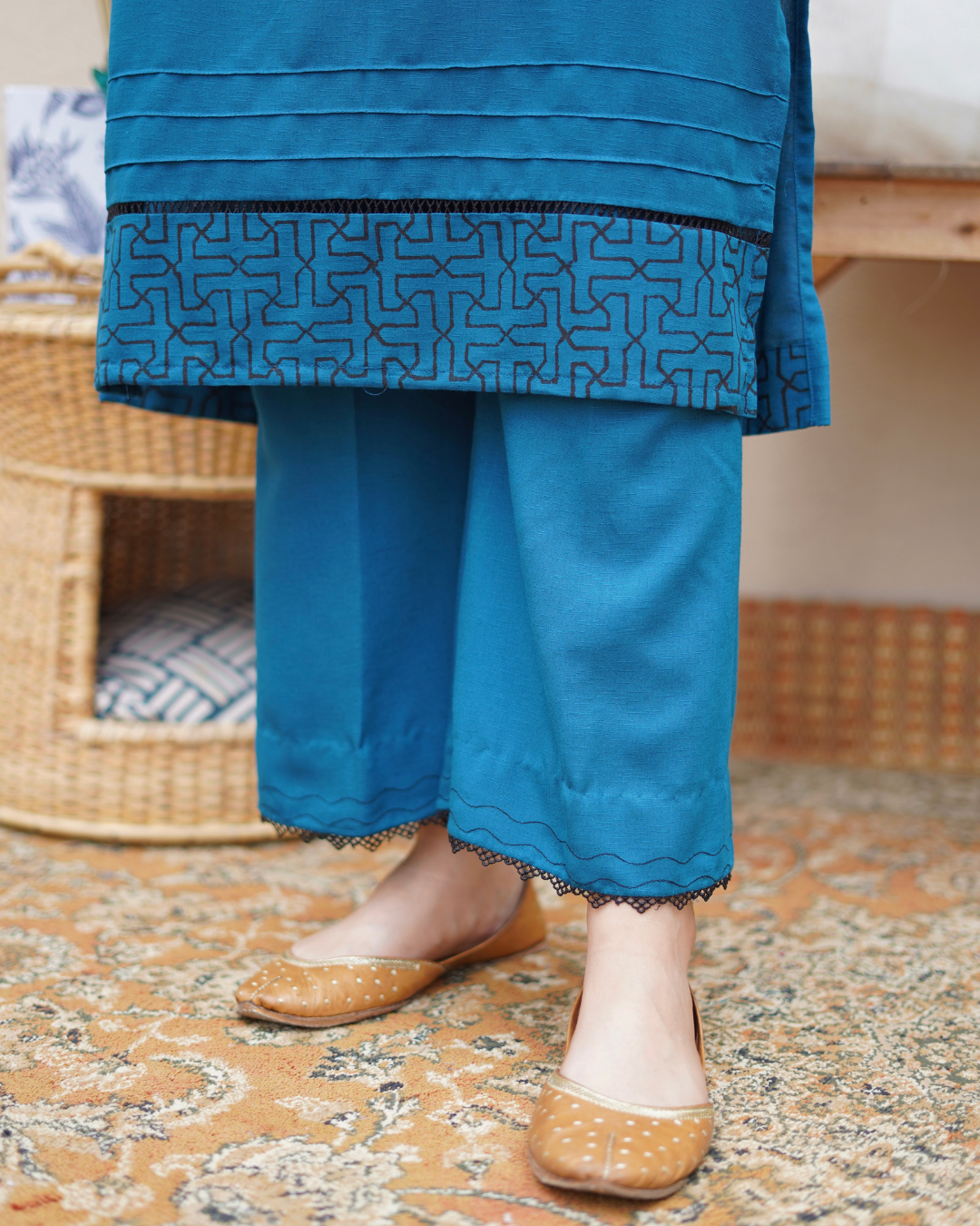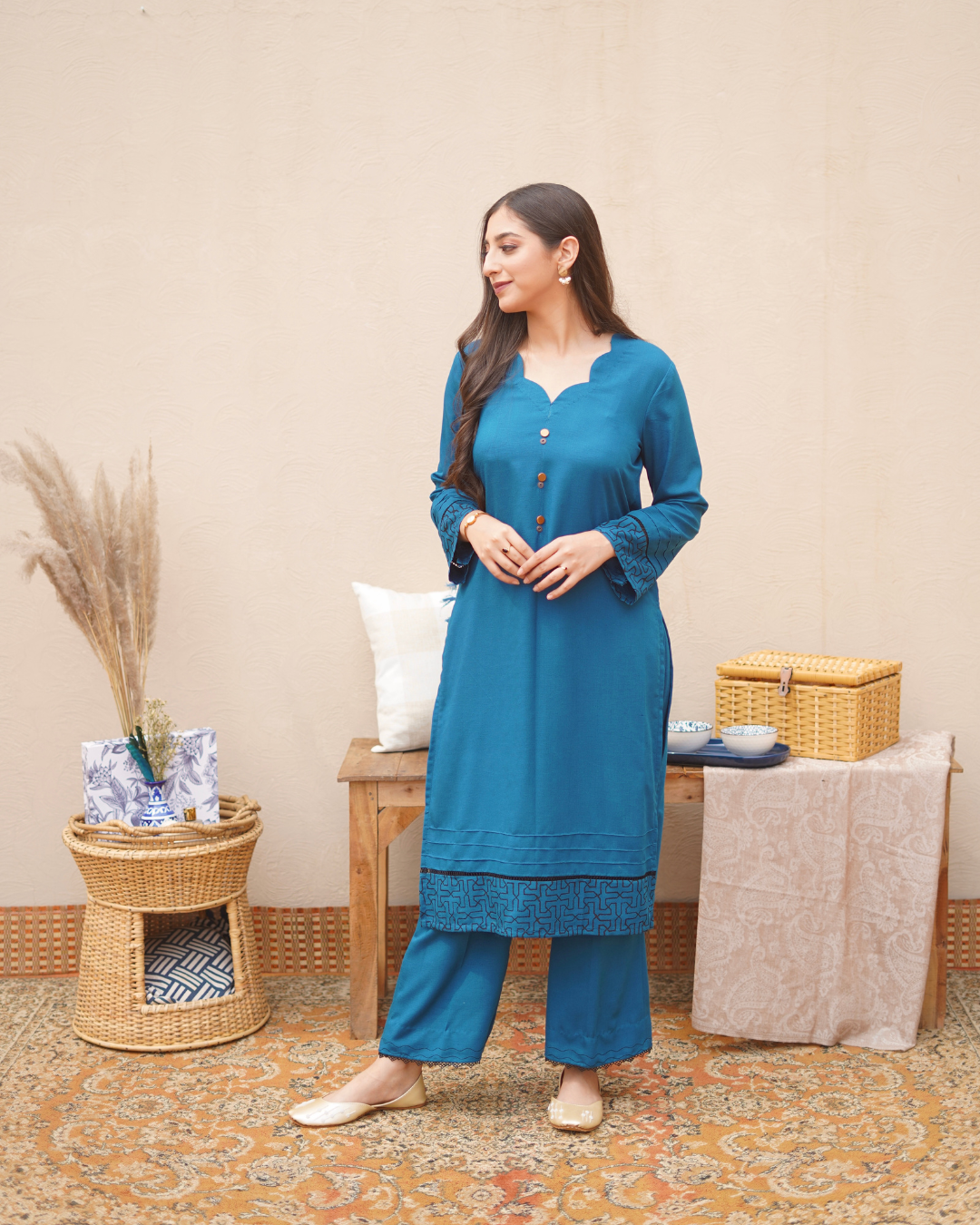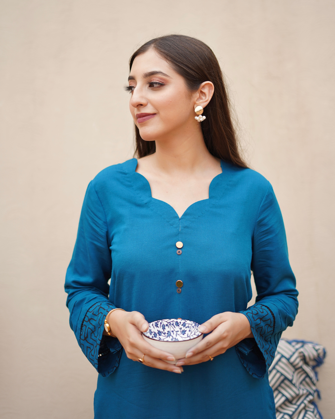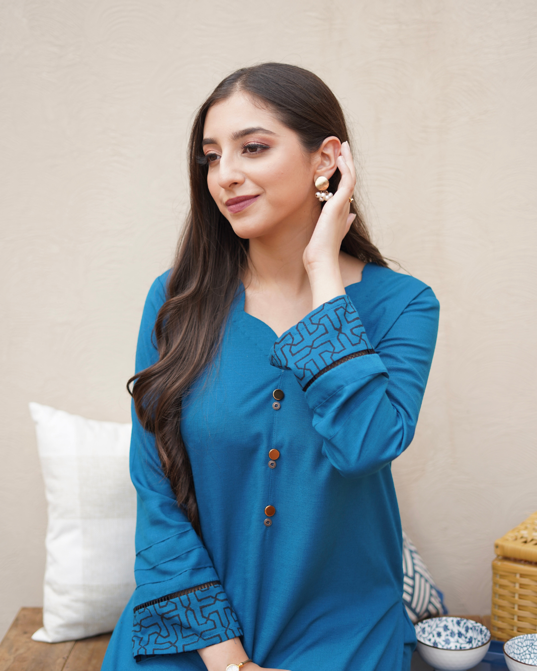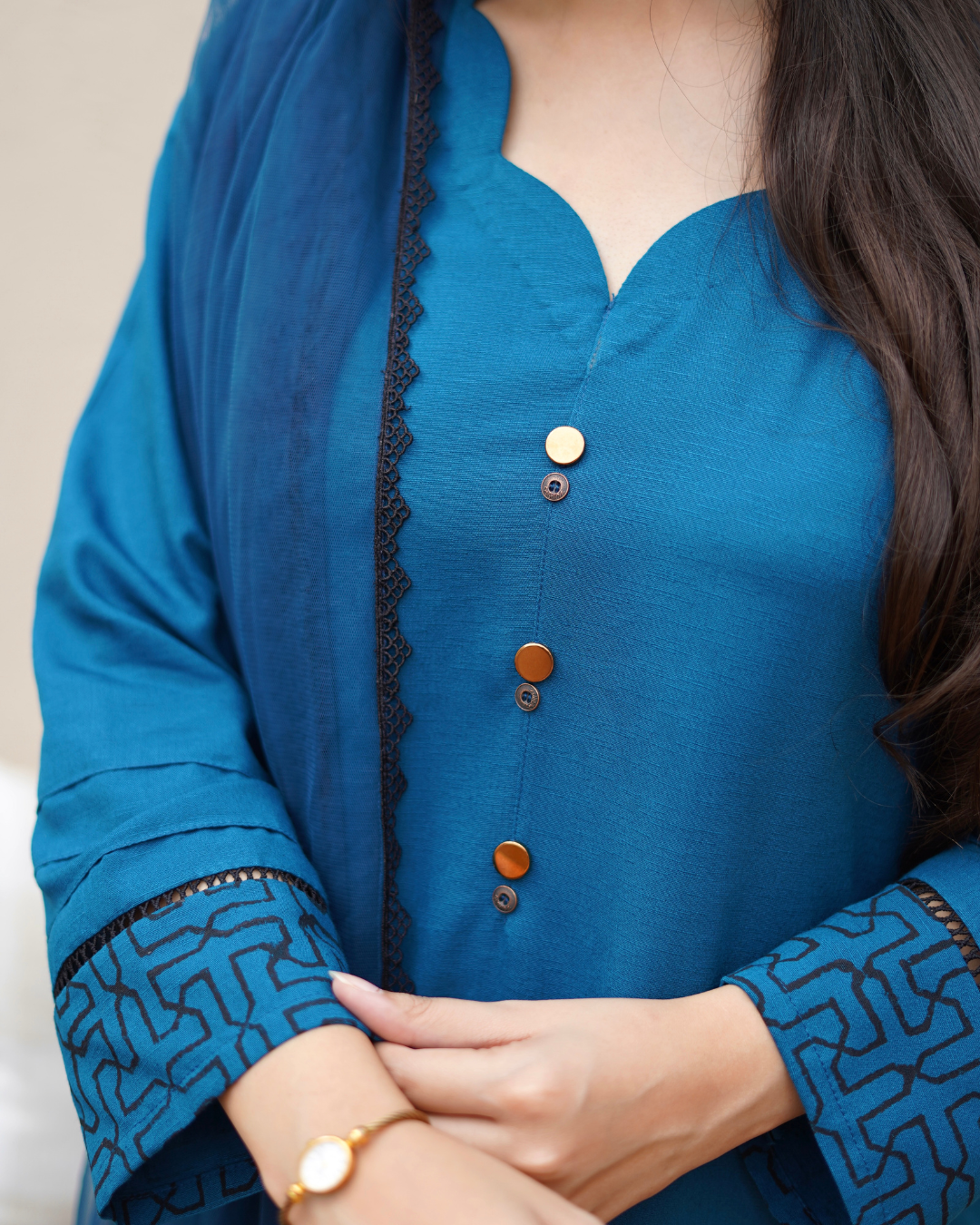 bronze buttons & scalloped neckline. Sleeves and Hem enhanced with intricate geometric block print, lace and pintex.