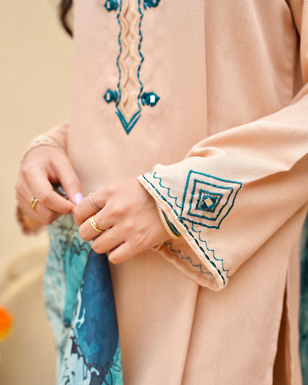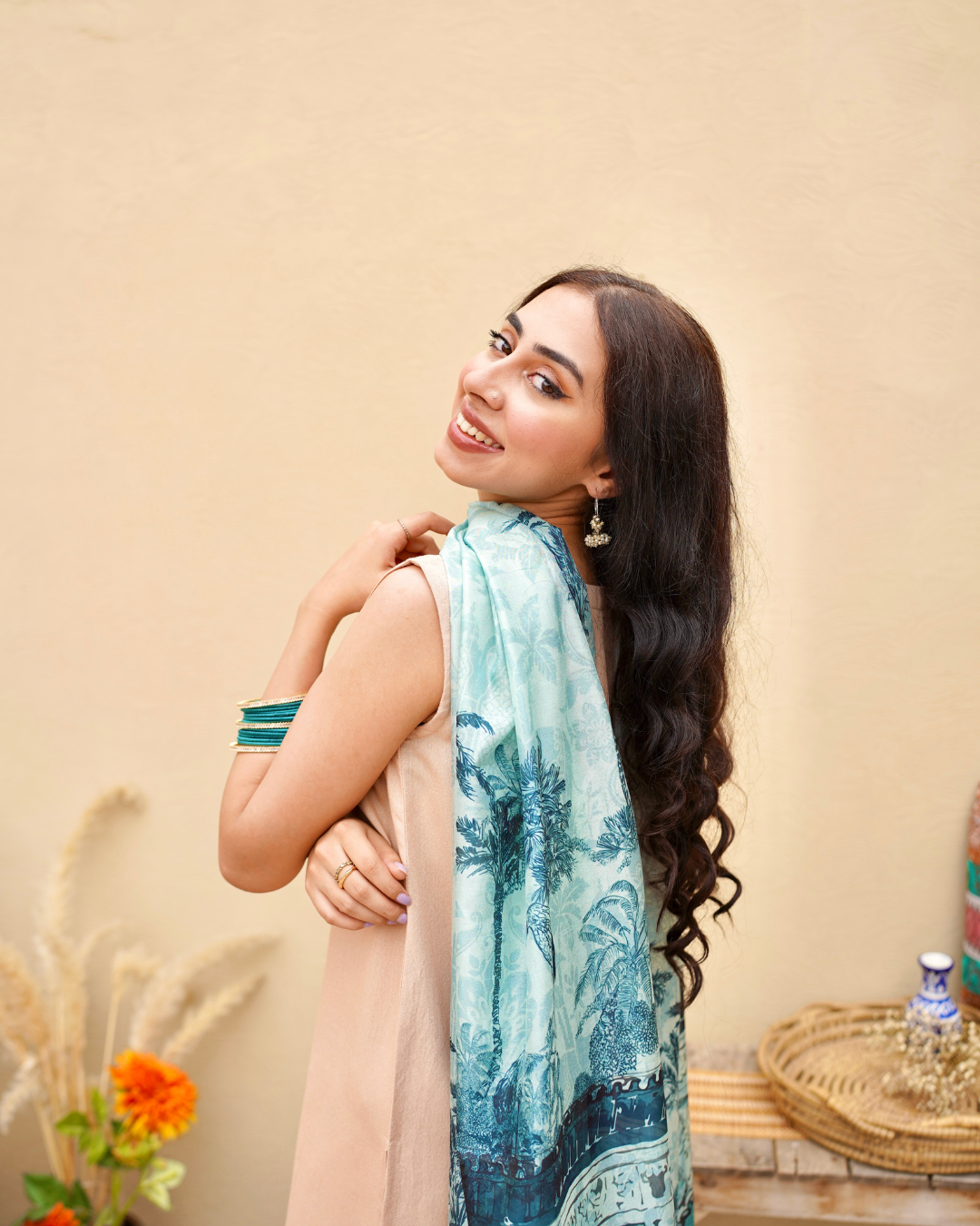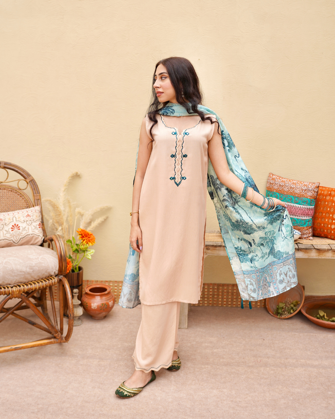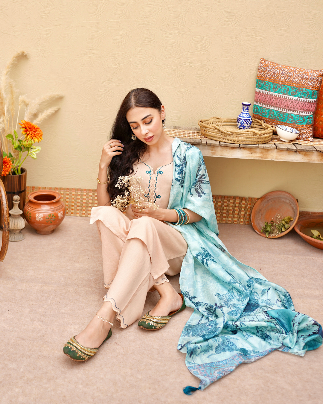 Delicate scallops and intricate green mirror work embroidery adorn the neckline, sleeves, and culottes, while a stunning digital printed dupata completes the look.