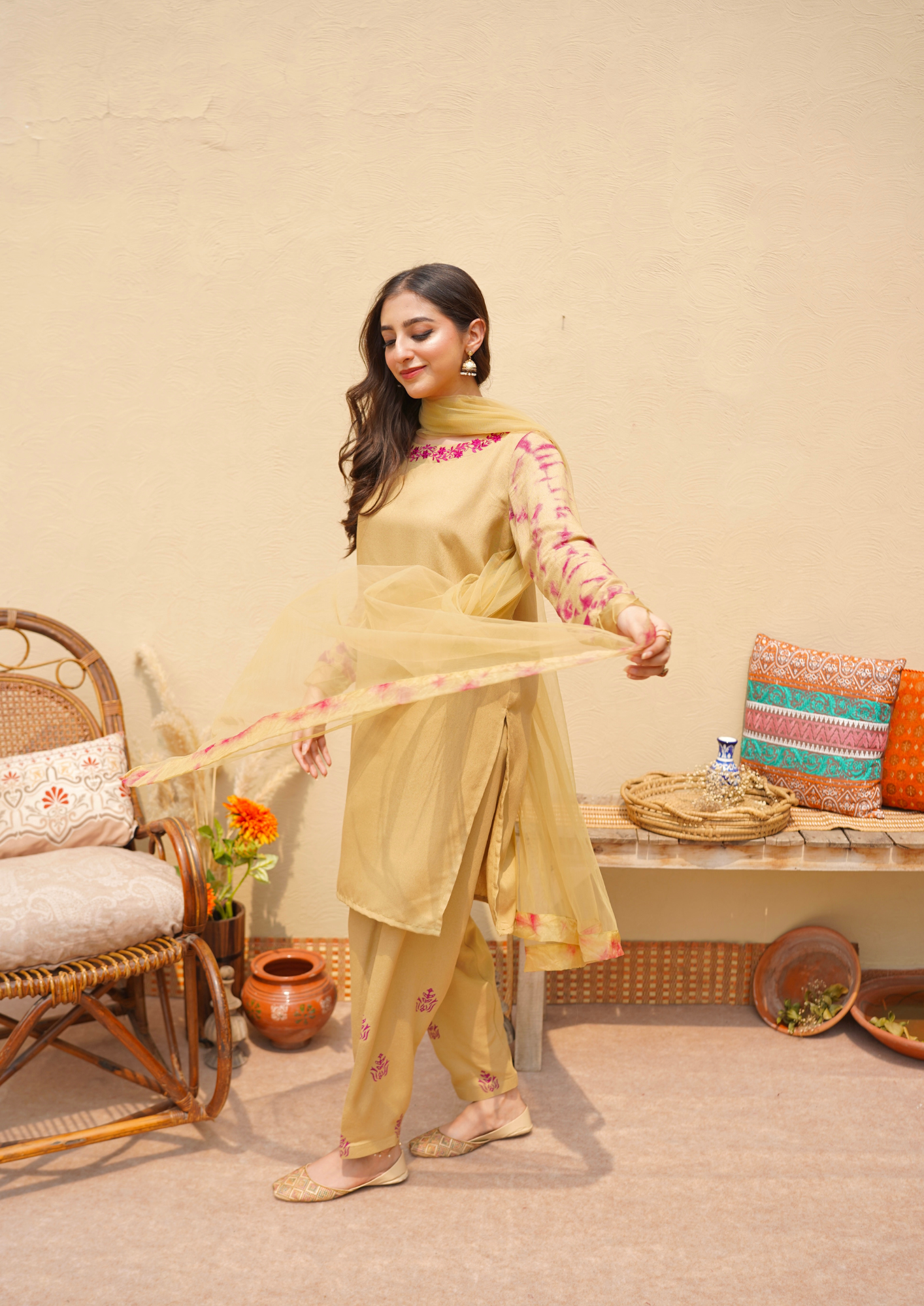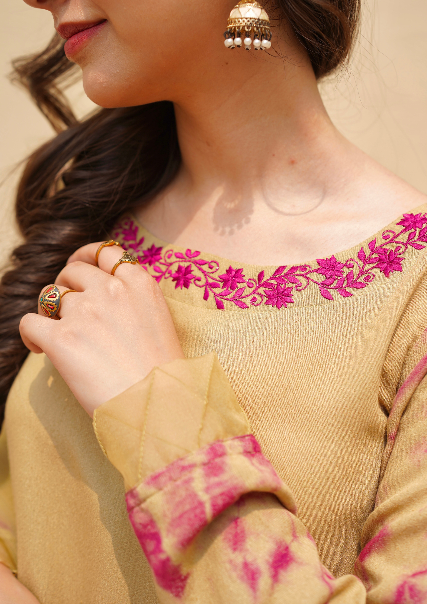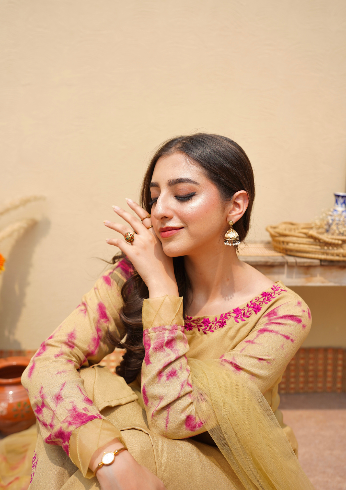 This dress combines the serenity of olive green with the vibrancy of fuschia pink tie-dye sleeves, intricate embroidery, and block print to create a true work of art.