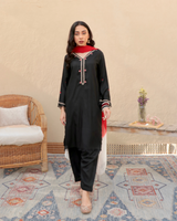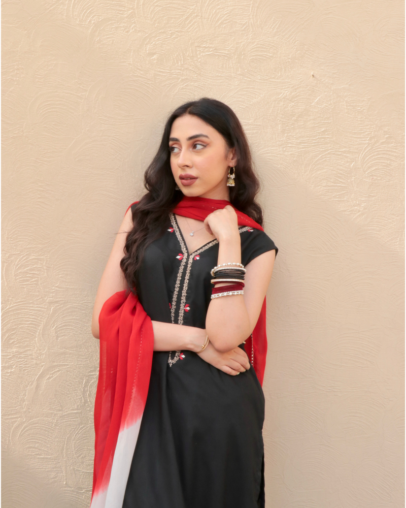 This Black dress comes with a splash of cherry & white. Complete the ensemble with our vibrant cherry-dipped net dupata.