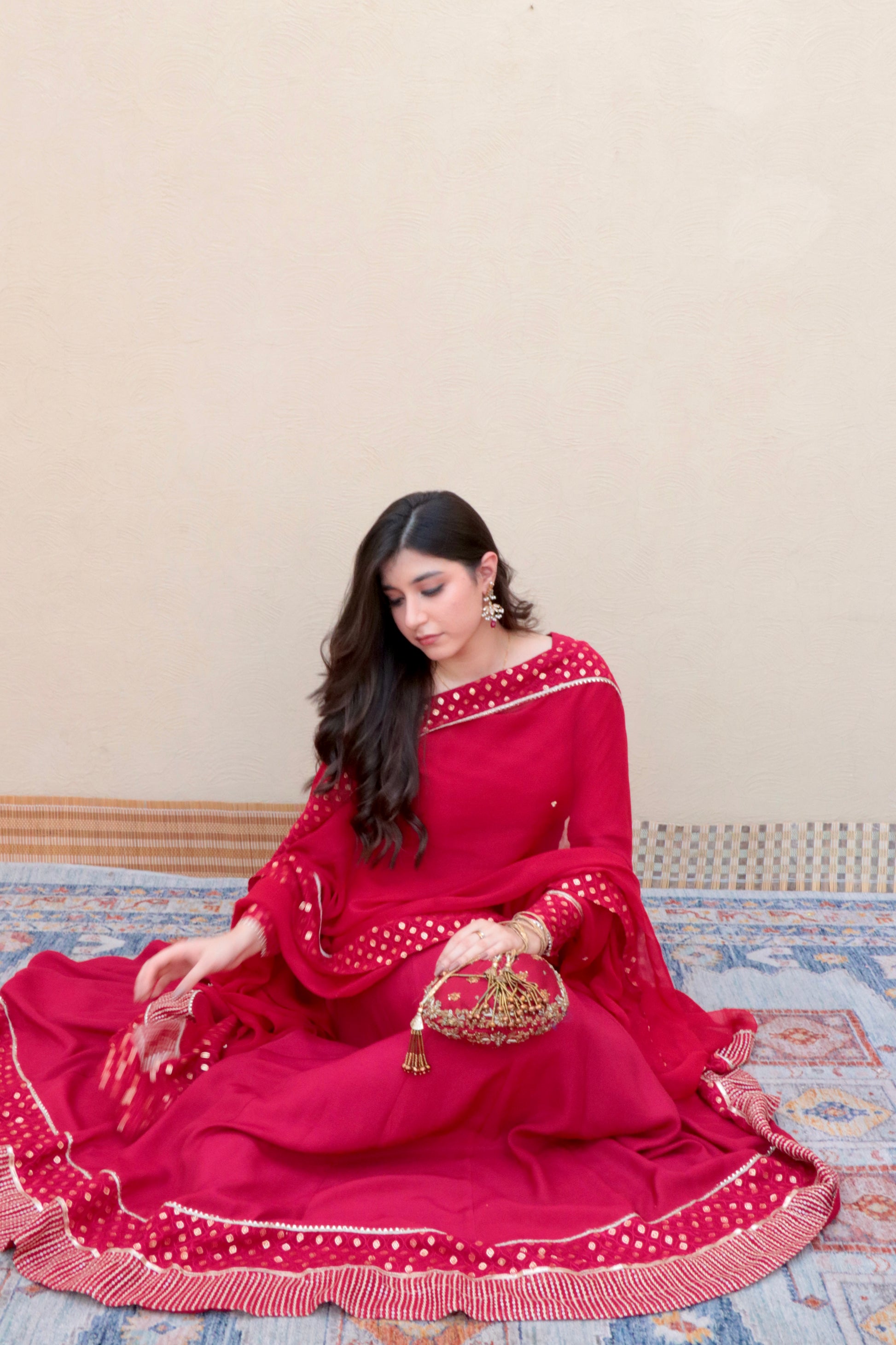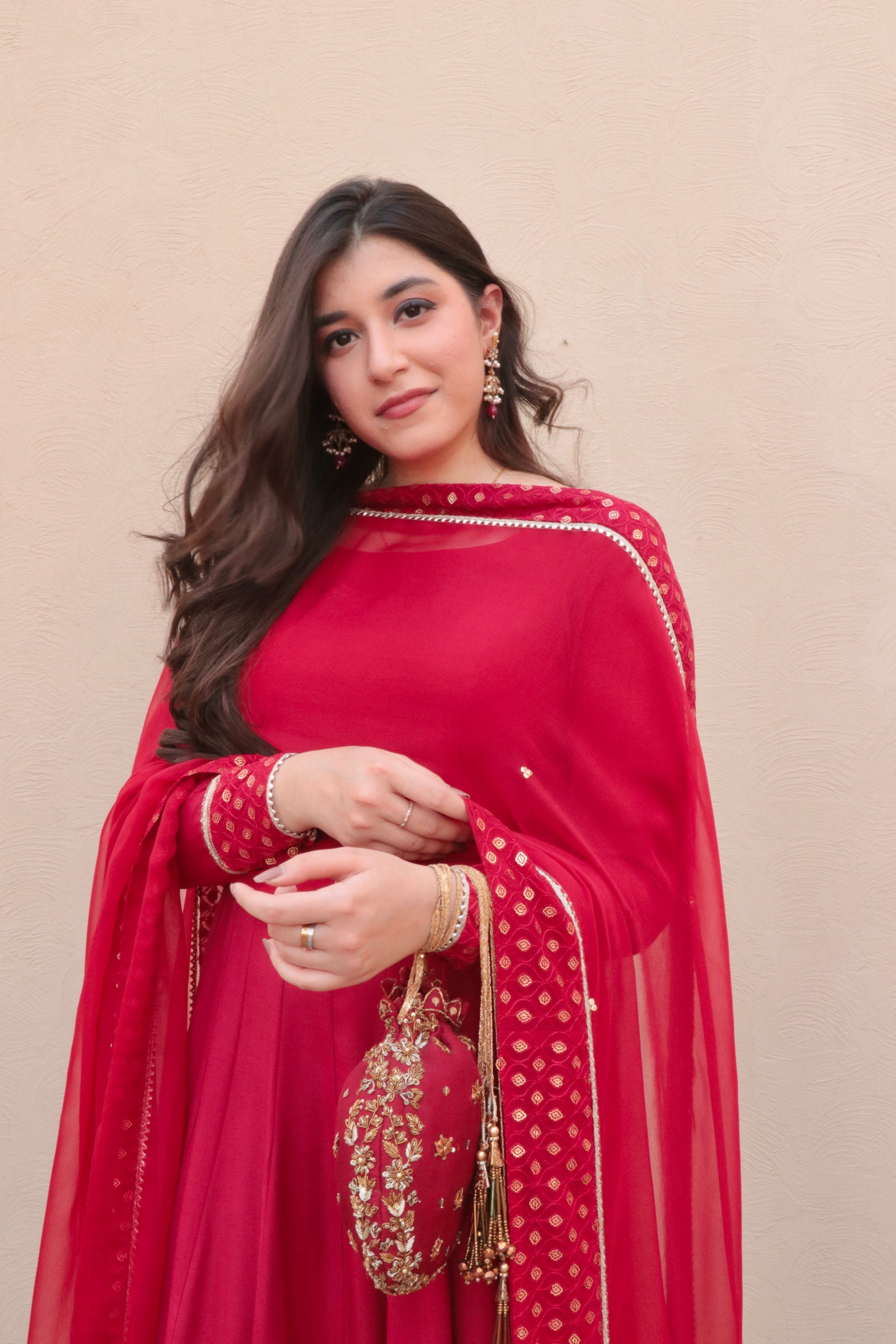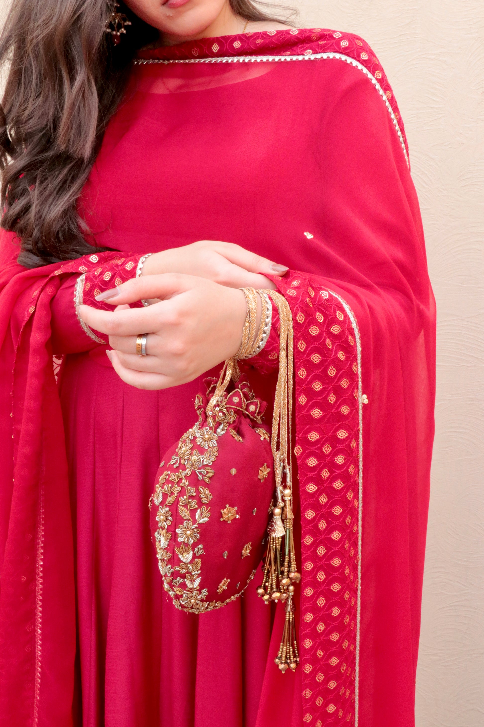 Our Pomegranate Peshwaas, enhanced with exquisite gold and silver work on the sleeves and hem. Paired with a stunning dupatta and our classic potlie bag, complete your royal look.