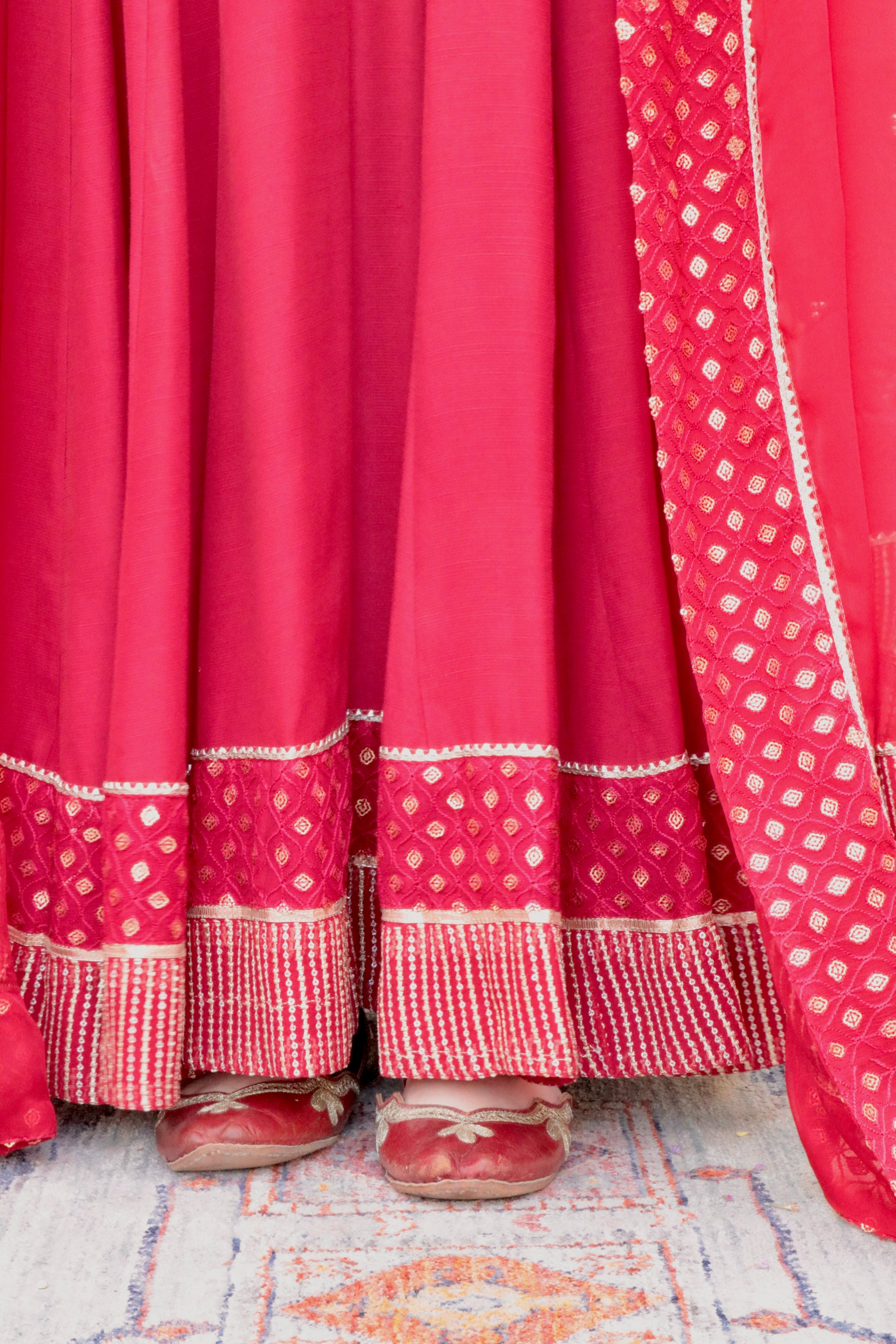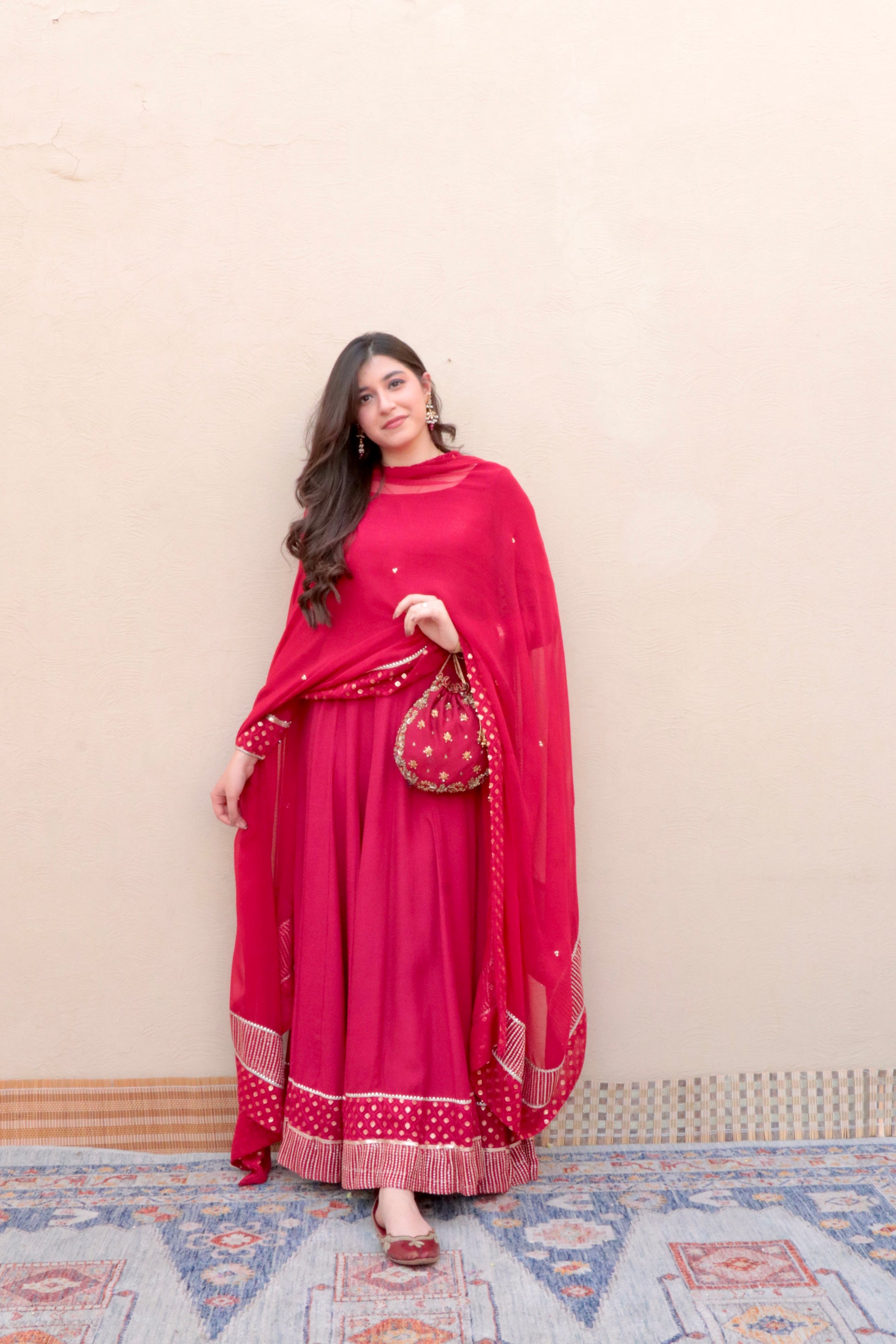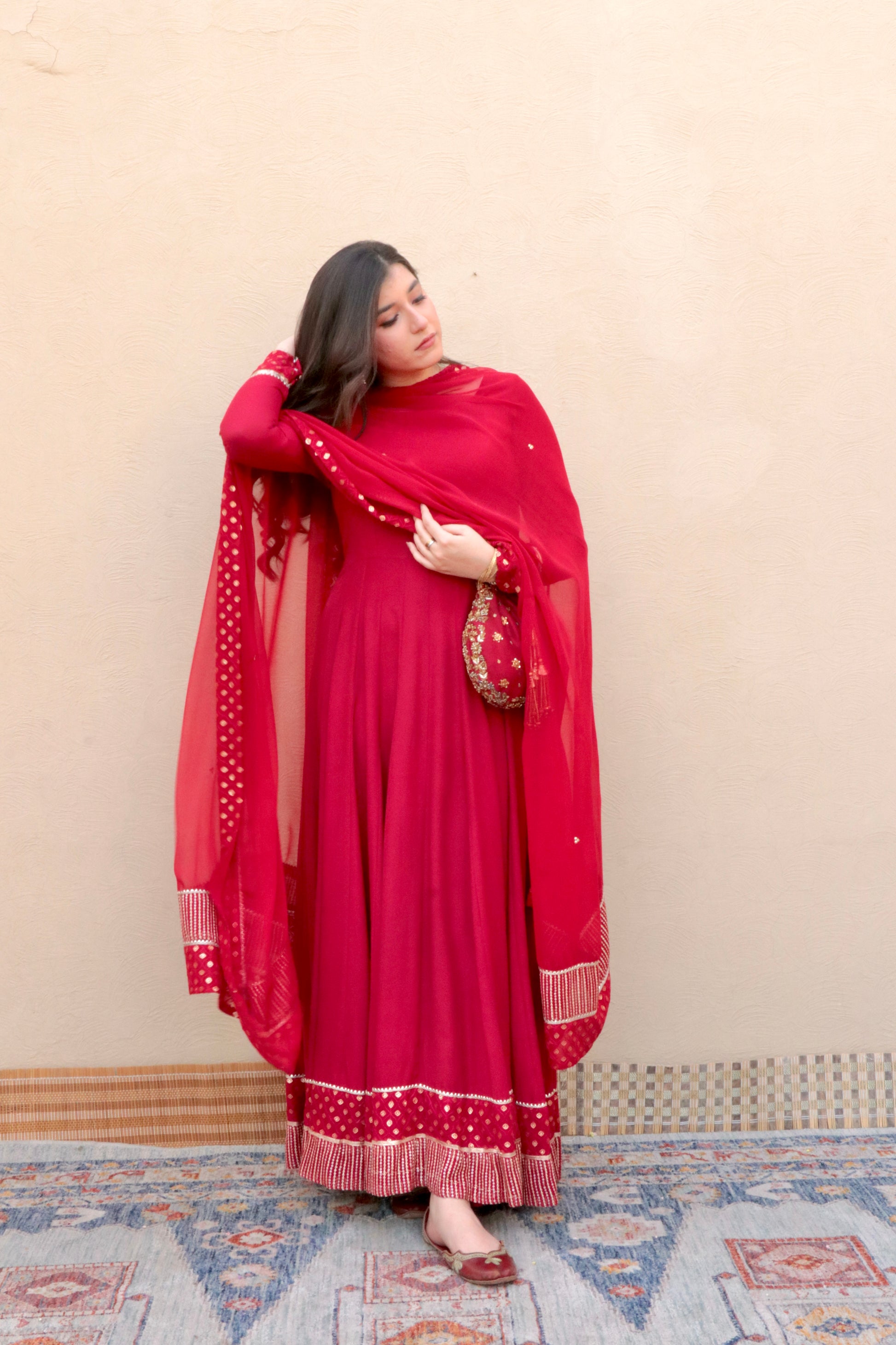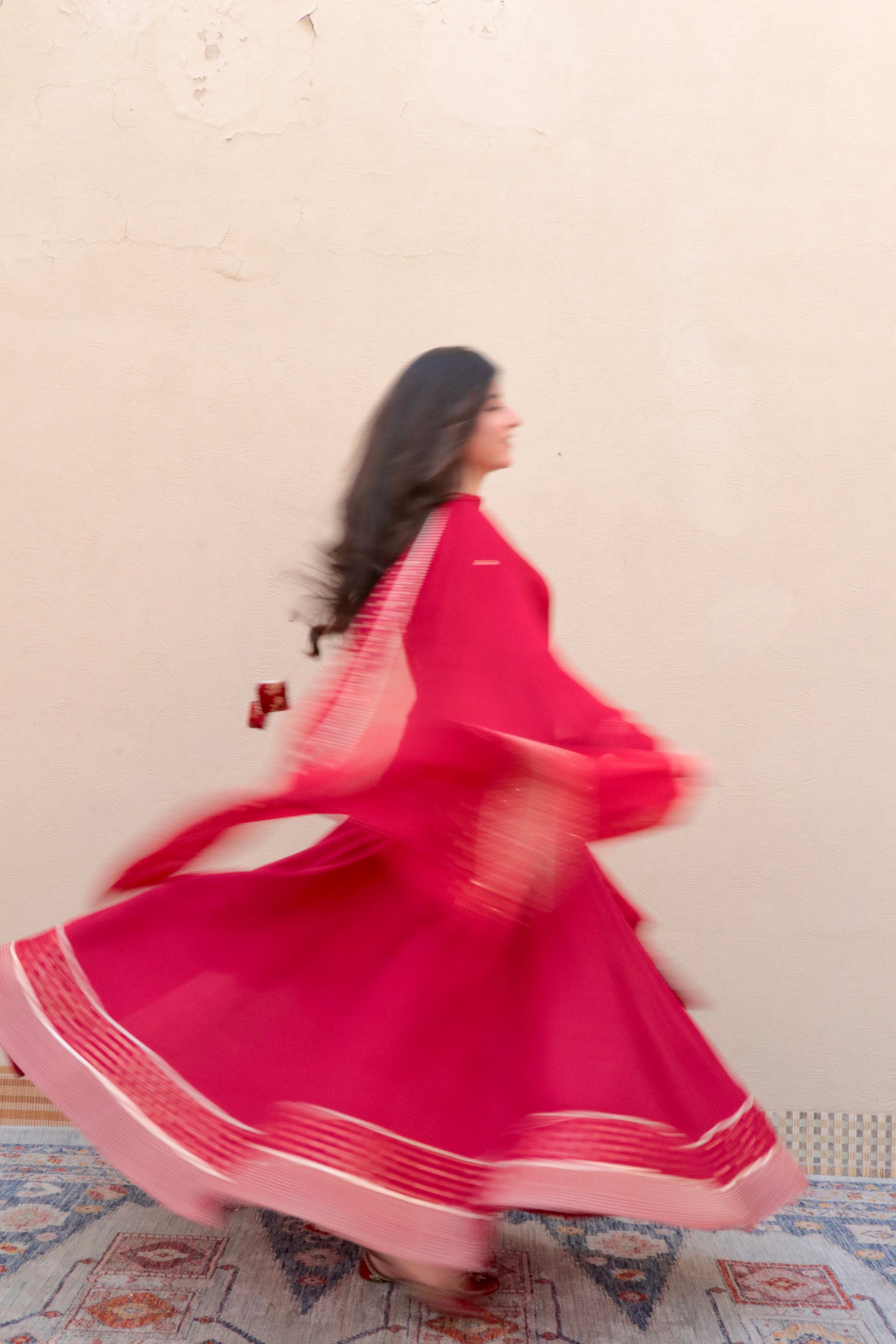 Our Pomegranate Peshwaas, enhanced with exquisite gold and silver work on the sleeves and hem. Paired with a stunning dupatta and our classic potlie bag, complete your royal look.