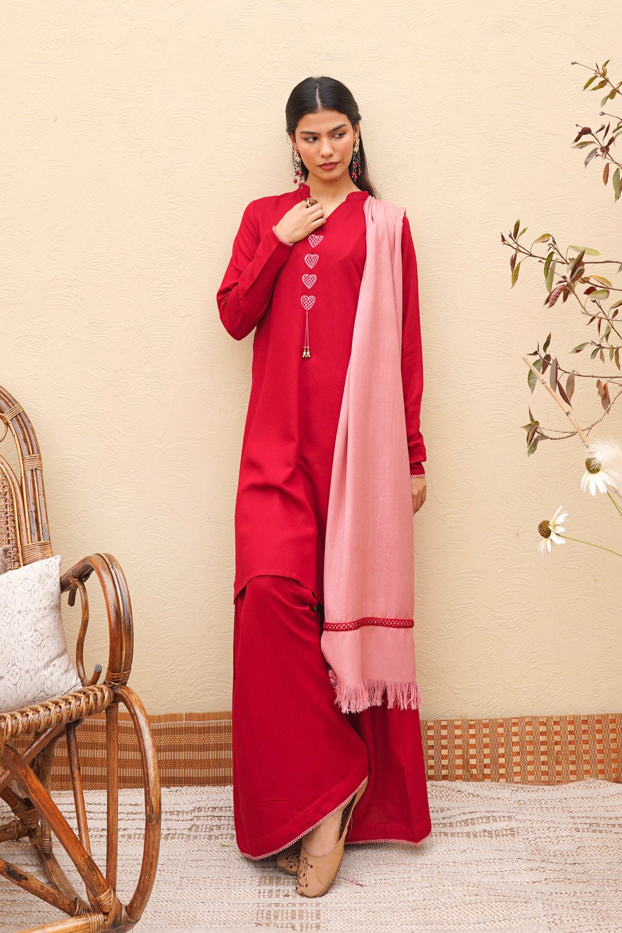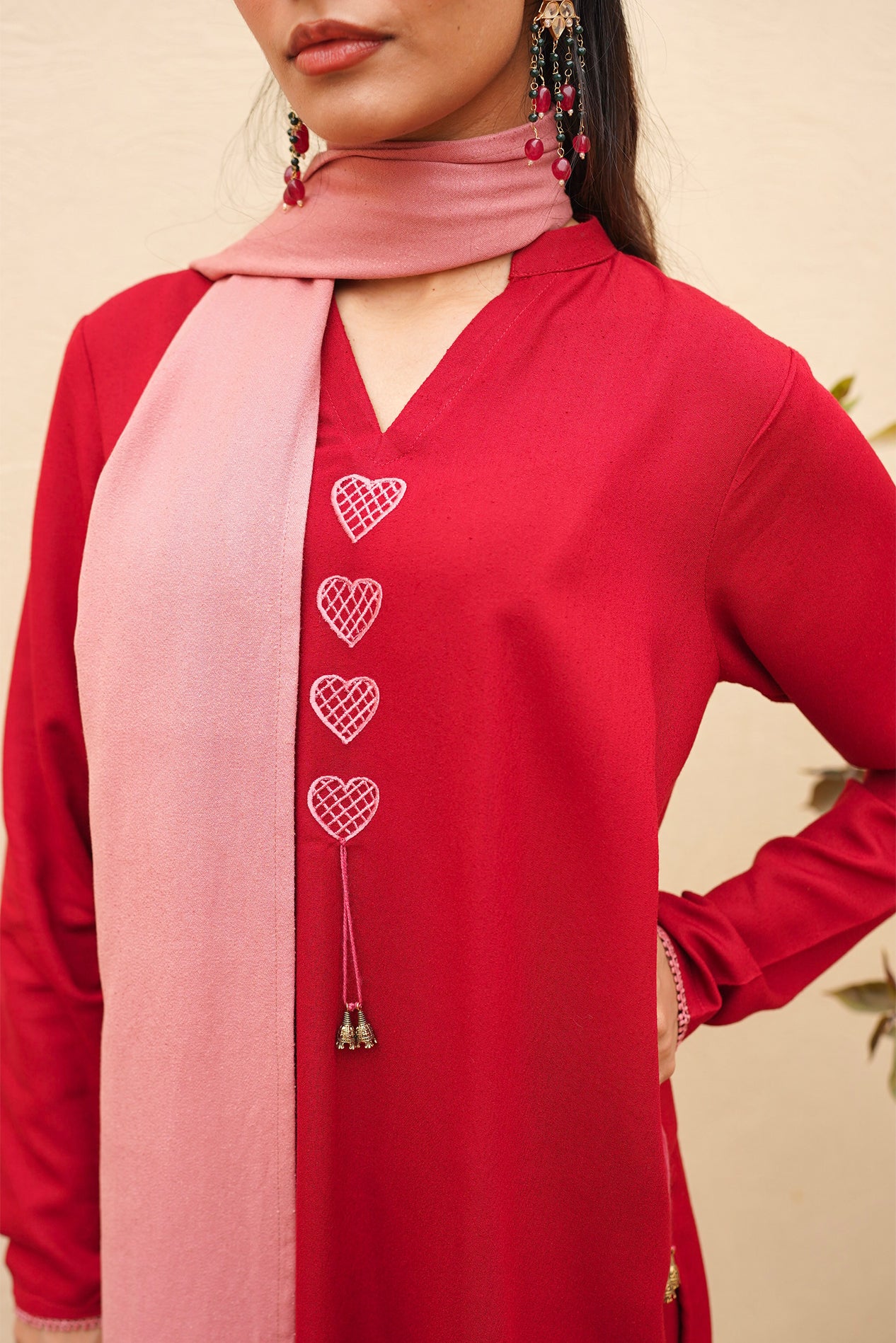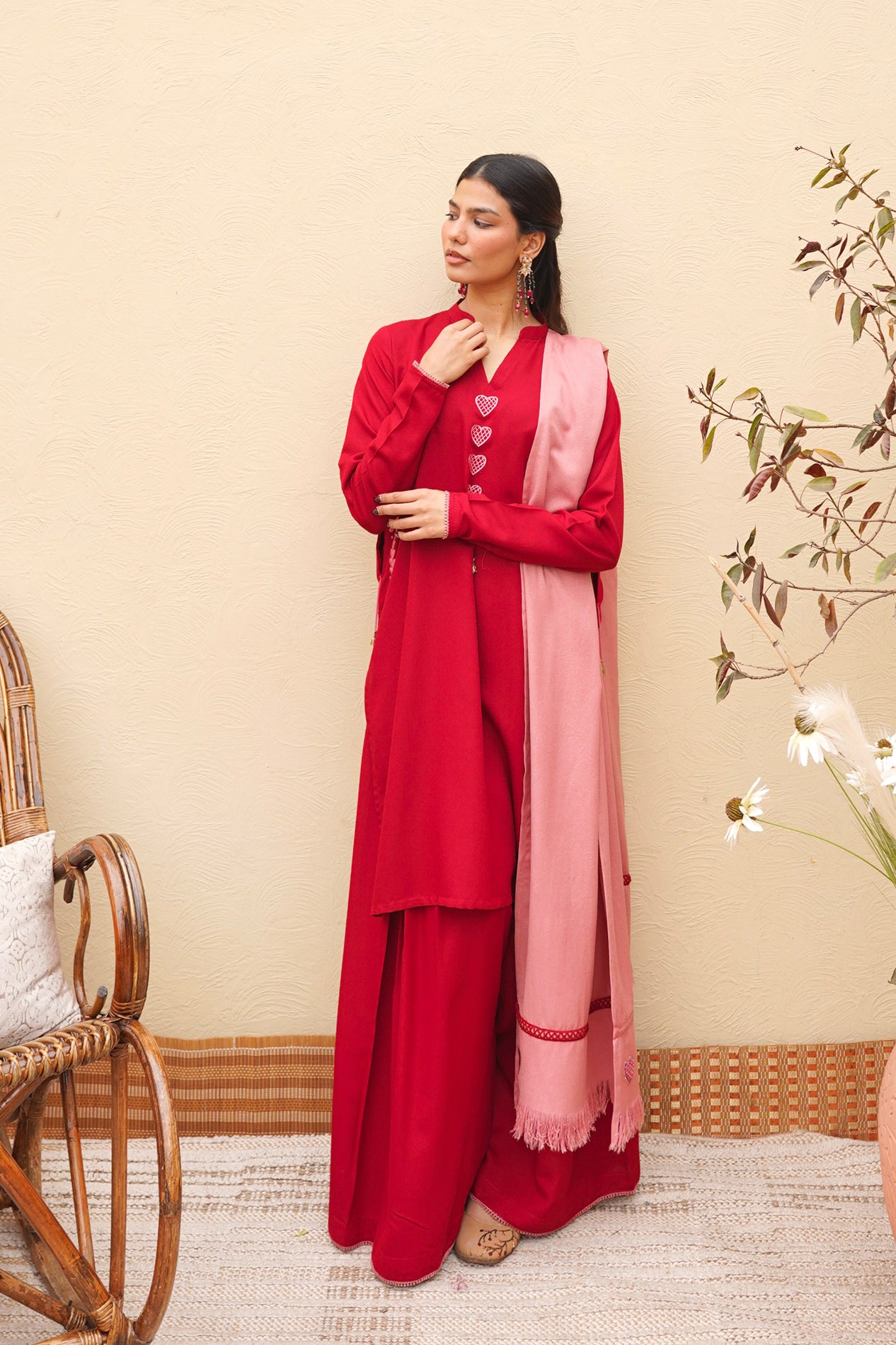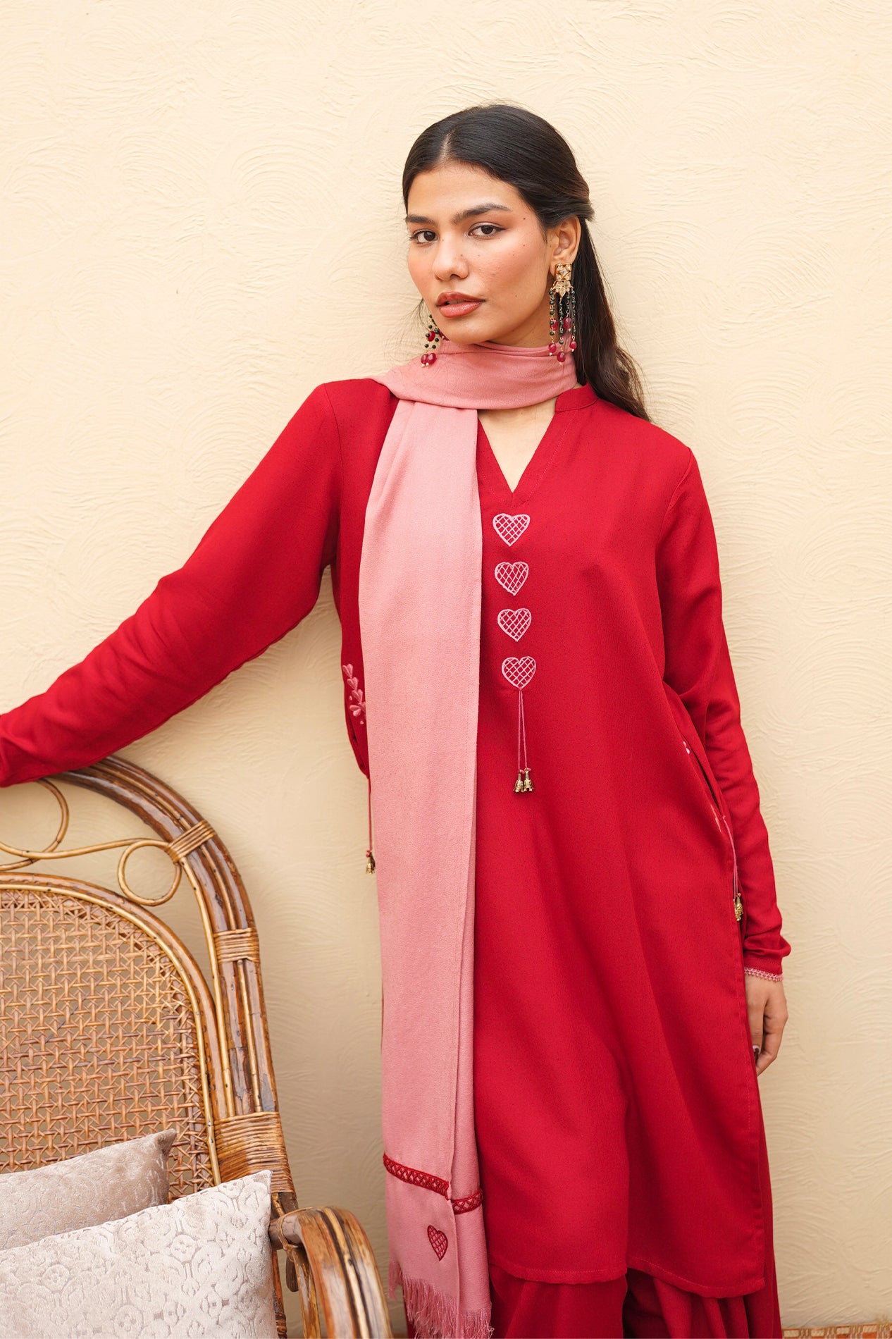 A perfect crimson kurta set featuring our signature dhaaka shalwar pants for a graceful flare. The kurta is styled with fitted sleeves and candy pink heart embroidery on the neckline and pockets, finished with intricate tassel detailing. Paired with the option of a candy pink scarf or a silk dupatta adorned with embroidery and lace.