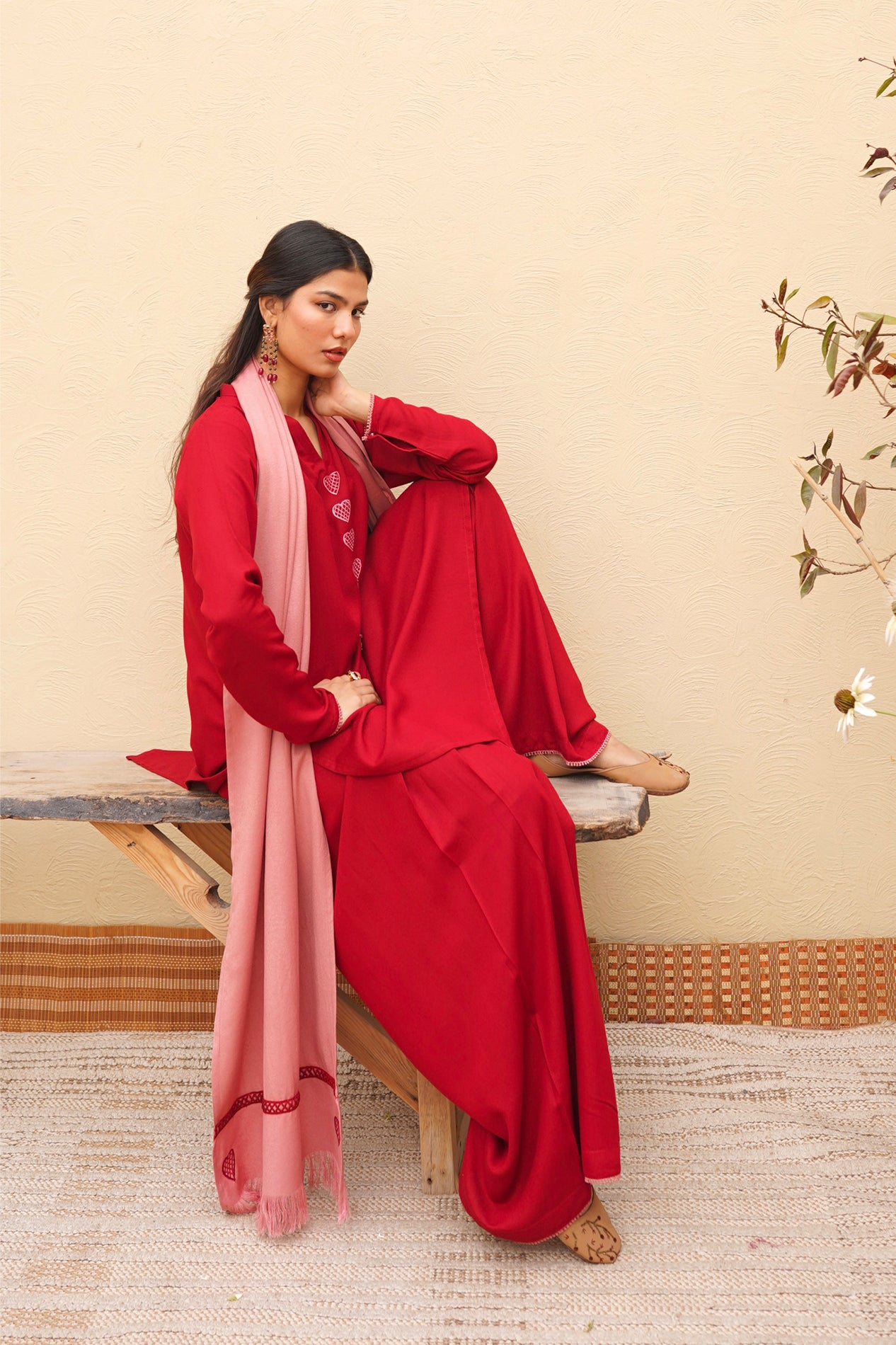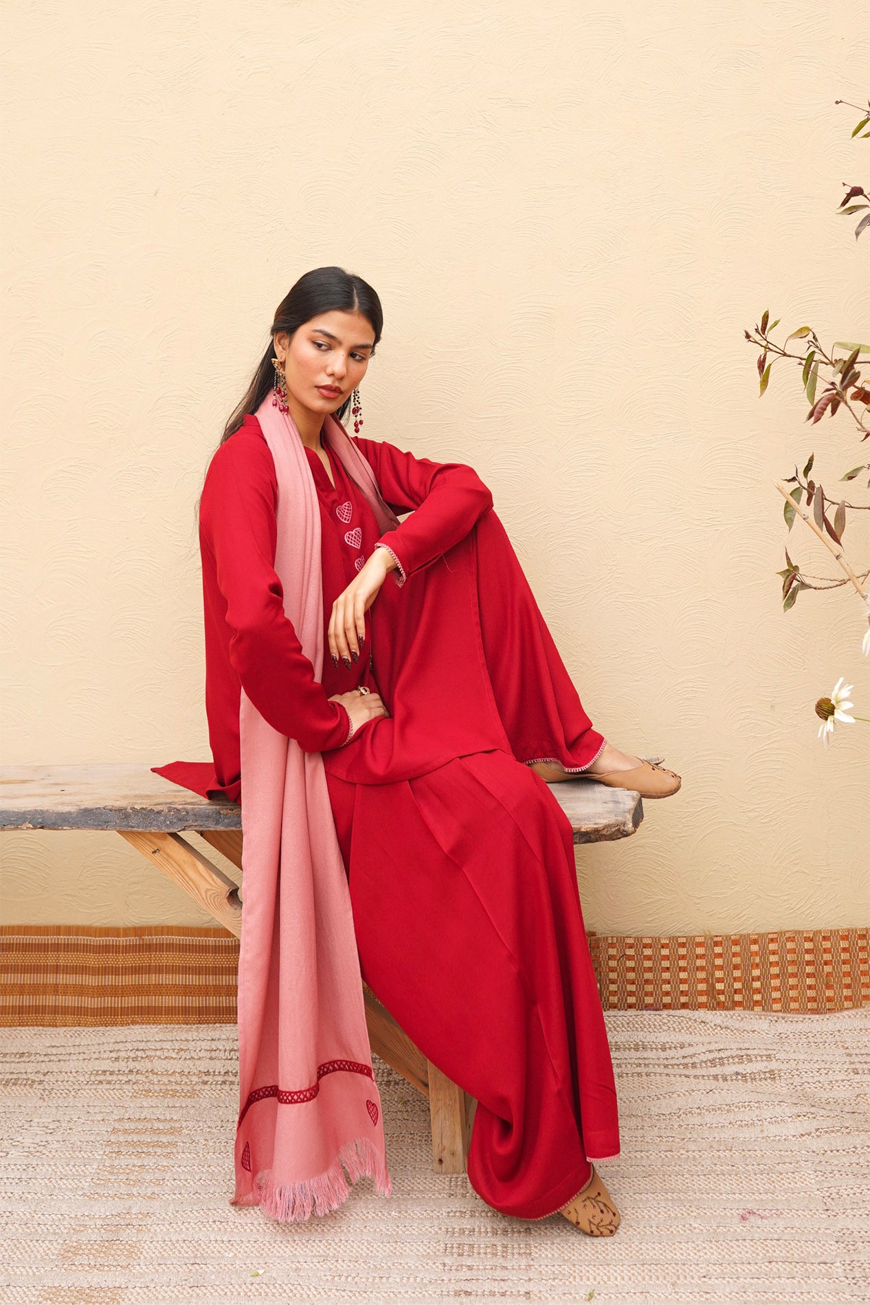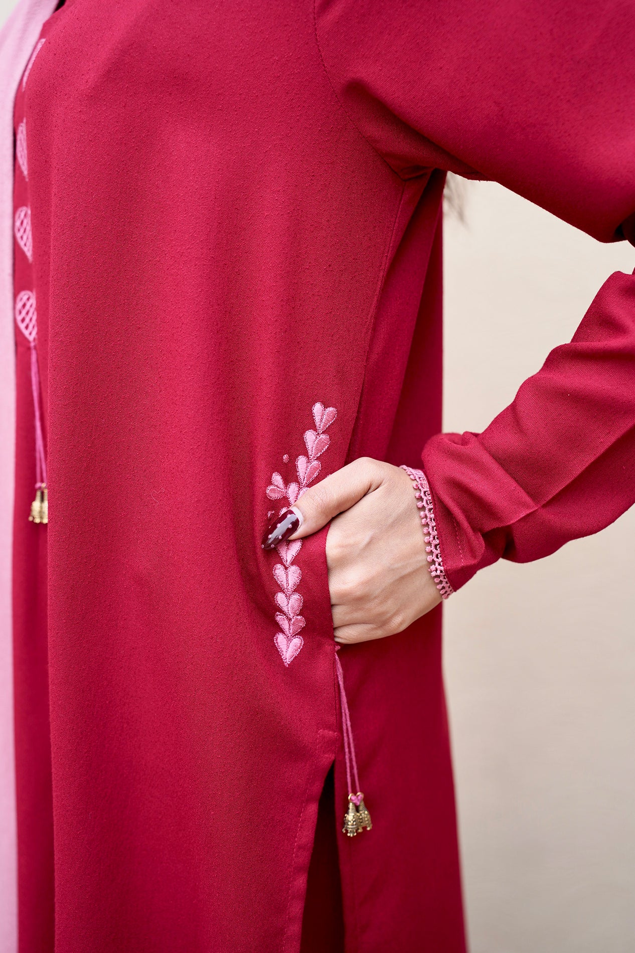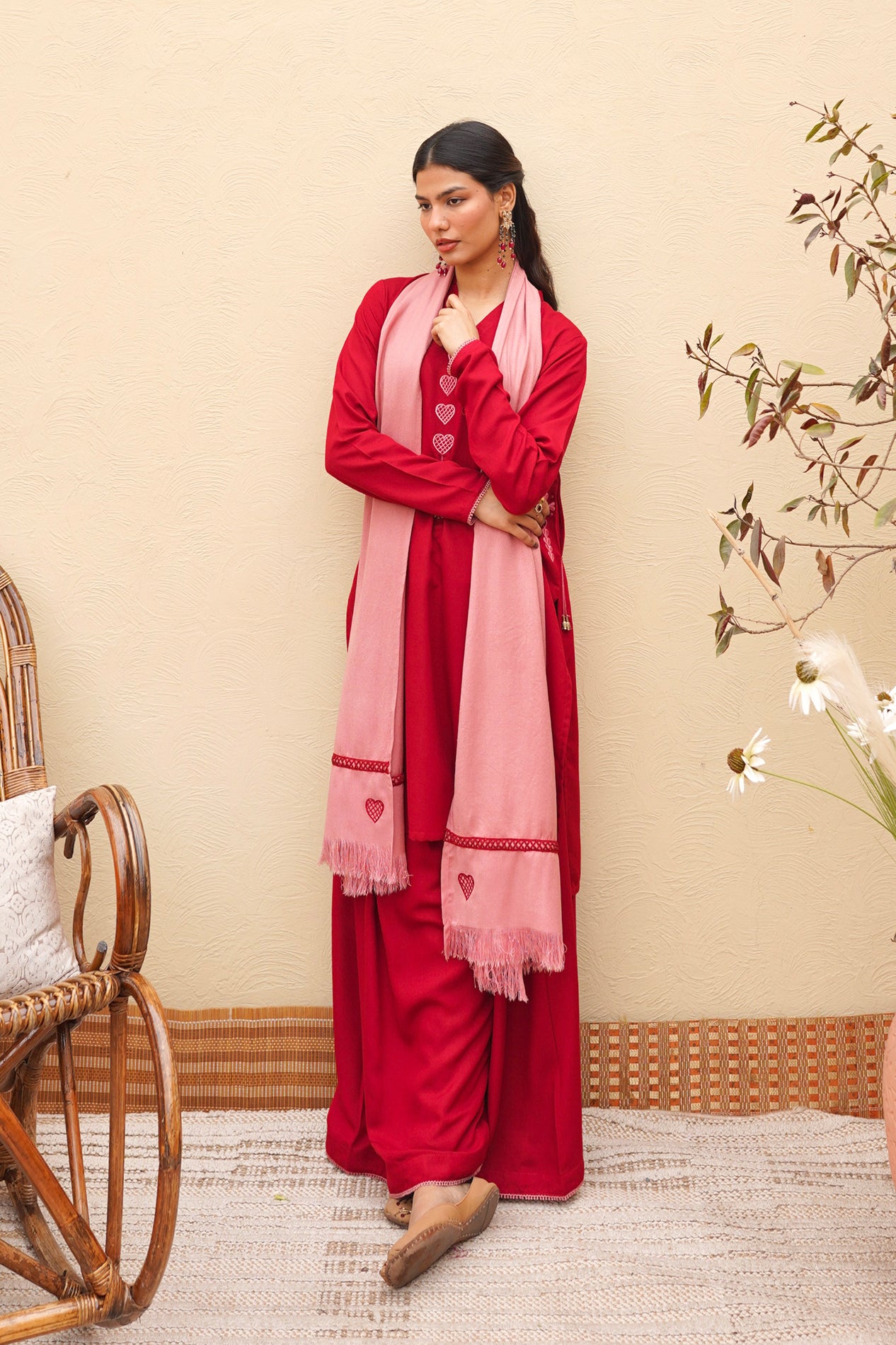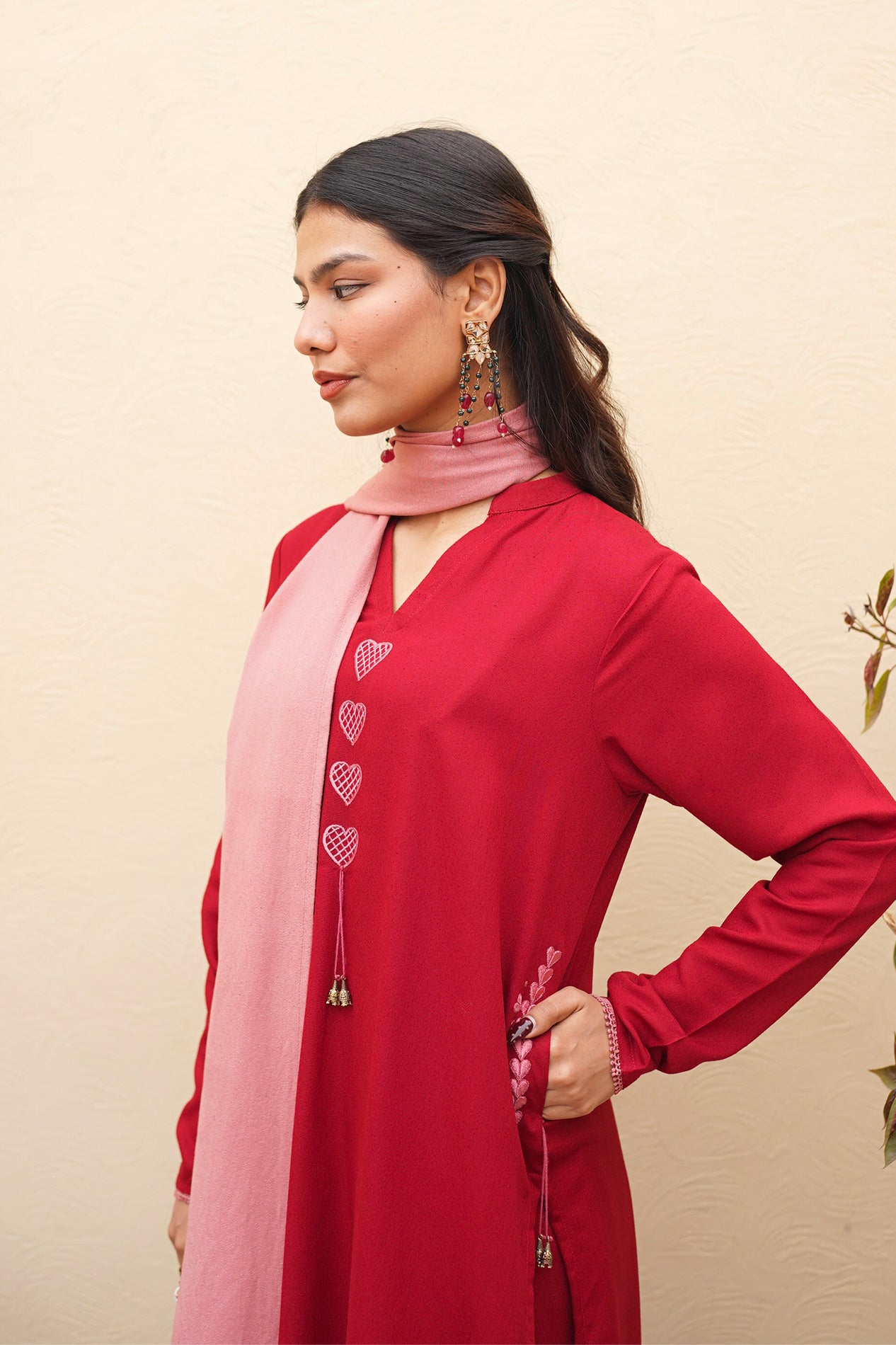 A perfect crimson kurta set featuring our signature dhaaka shalwar pants for a graceful flare. The kurta is styled with fitted sleeves and candy pink heart embroidery on the neckline and pockets, finished with intricate tassel detailing. Paired with the option of a candy pink scarf or a silk dupatta adorned with embroidery and lace.