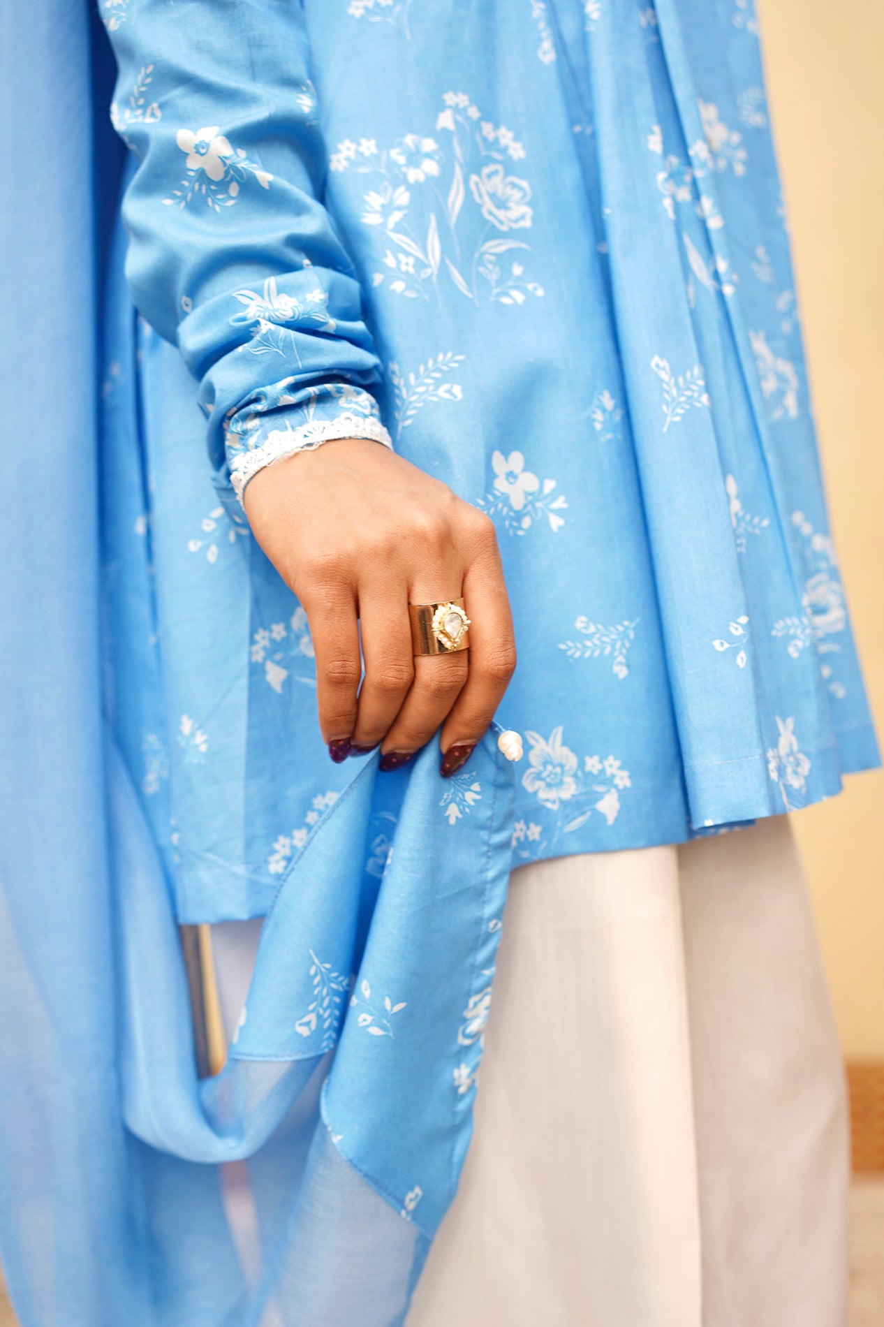 A perfect fusion fit, featuring a floral cloud printed peplum with chooridaar sleeves. The beautiful ivory wide paincha shalwar is enhanced with pearly lace details. For a pop of color, paired with a blue dupatta, completing the elegant and vibrant look.