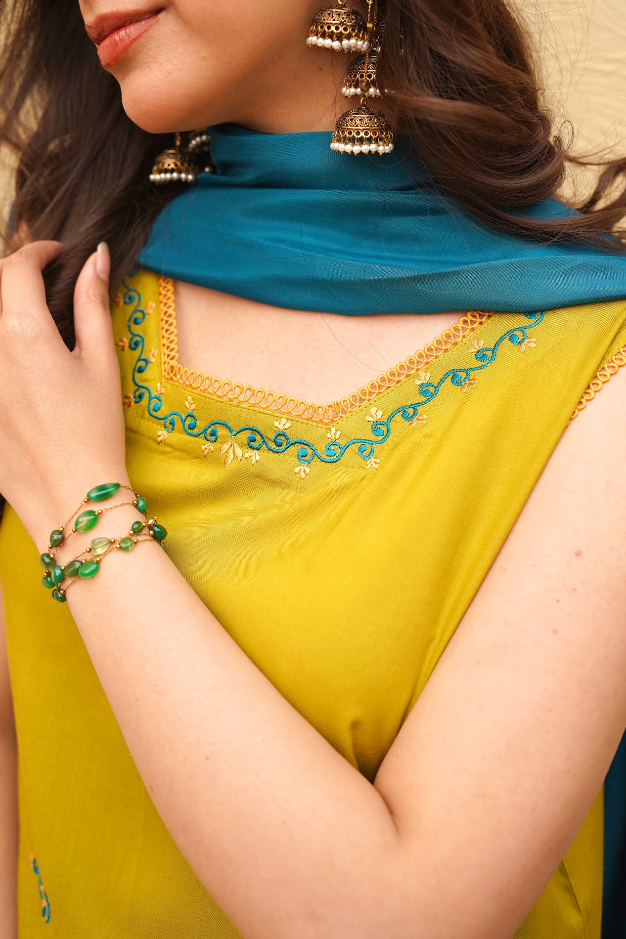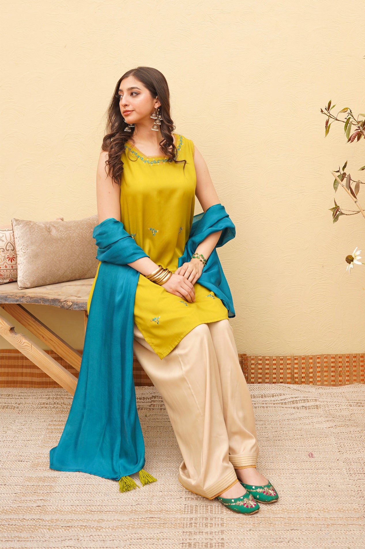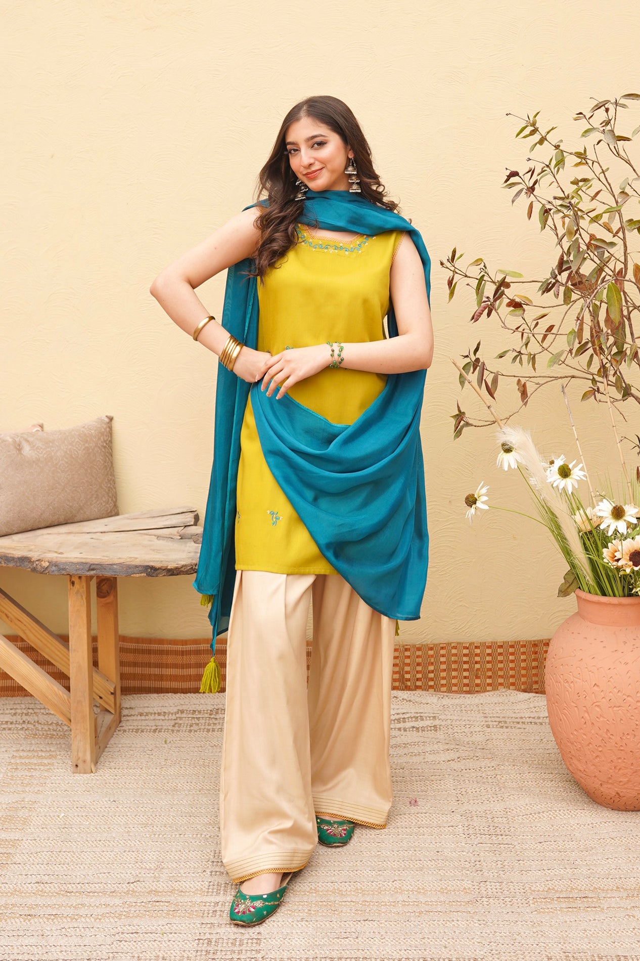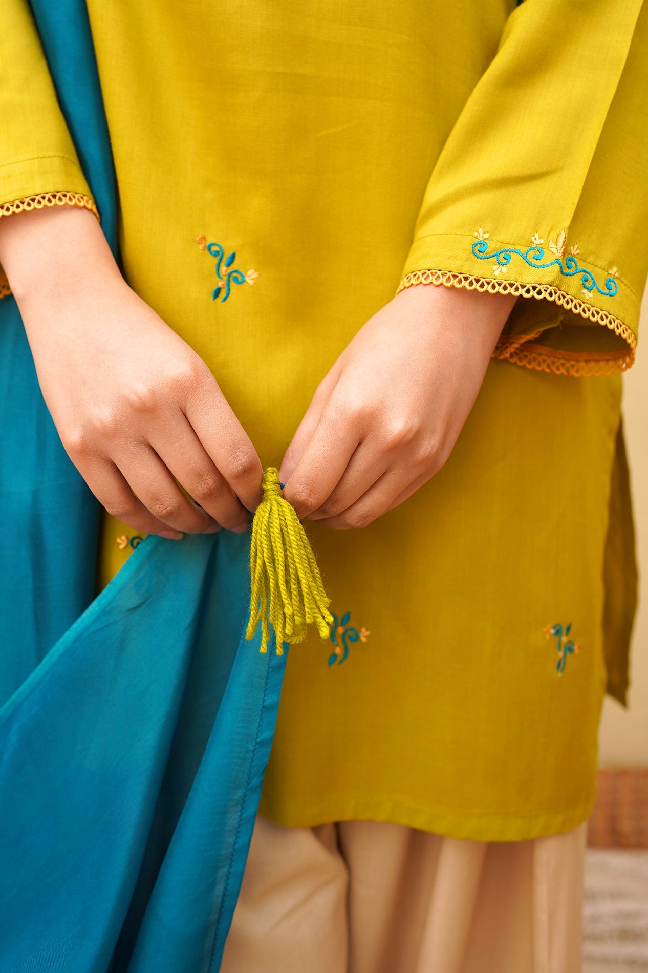 Lime kurta adorned with teal and lemon embroidery on the square neckline and sleeves. Paired with a fawn farshi shalwar and a teal blue contrast silk dupatta for a breezy, effortless look.