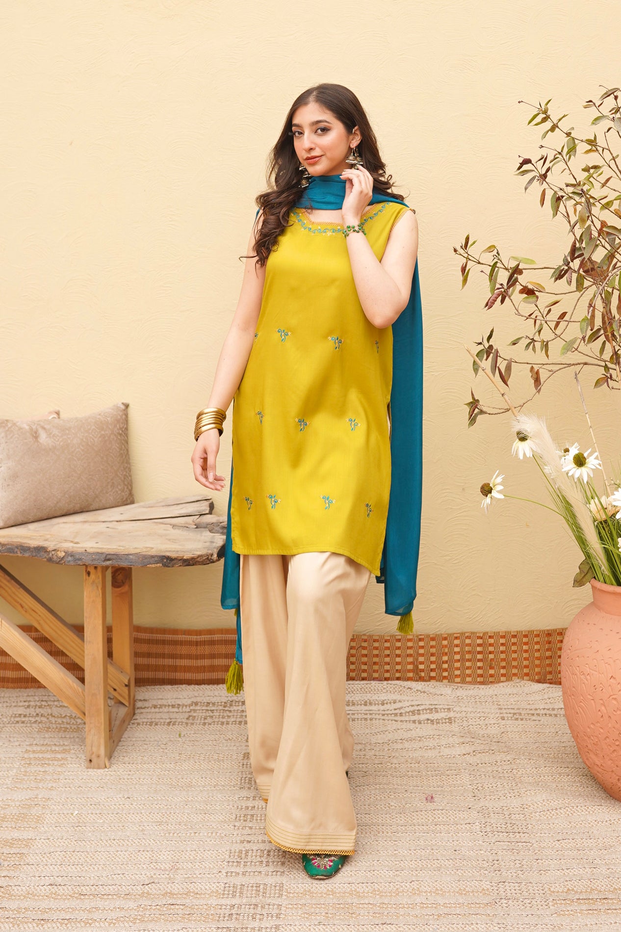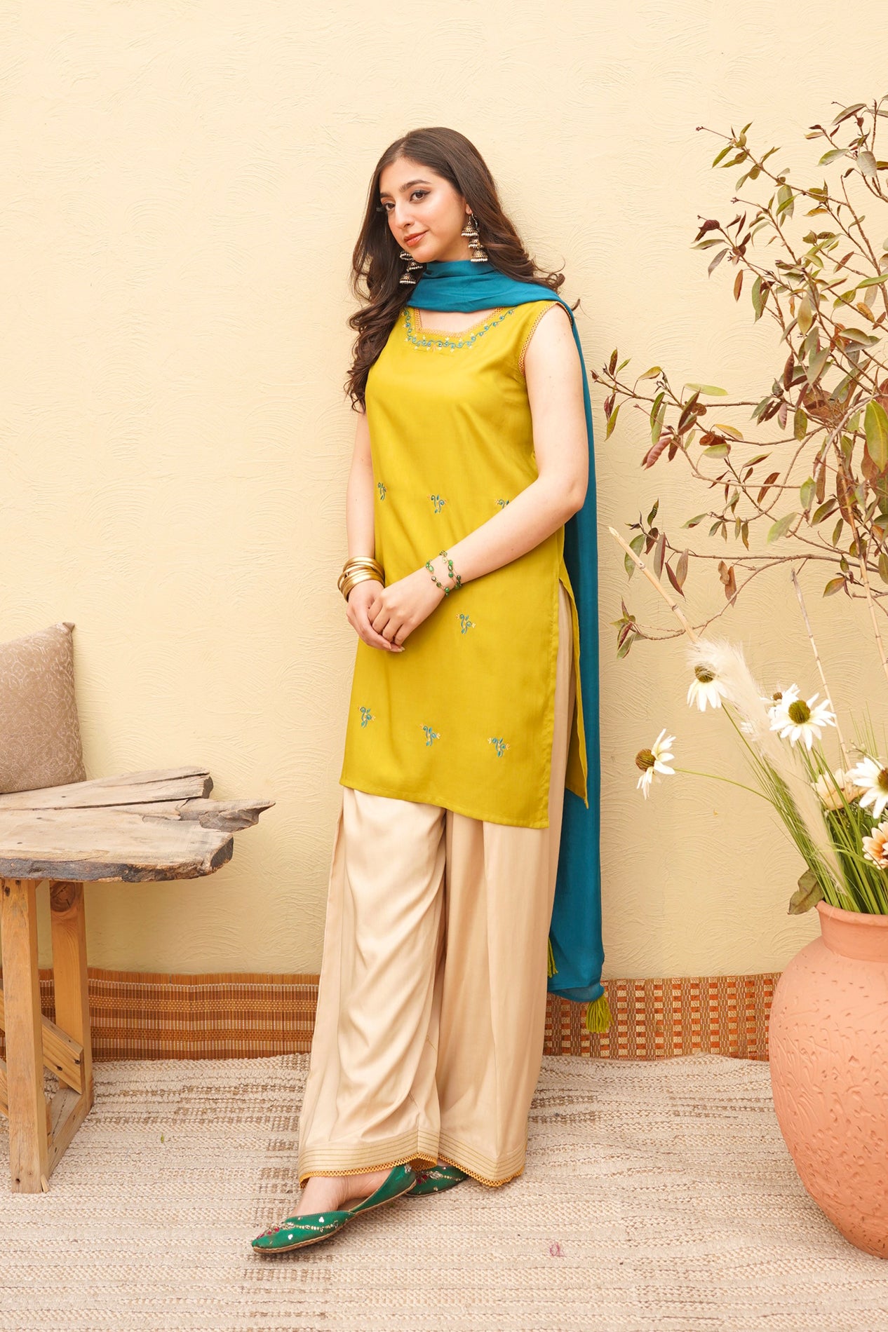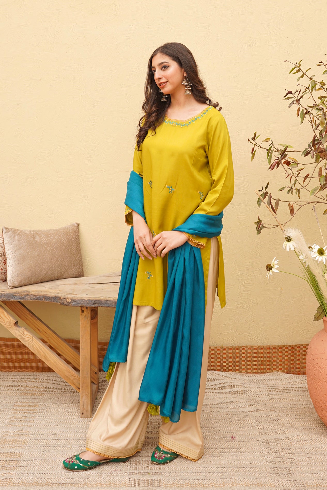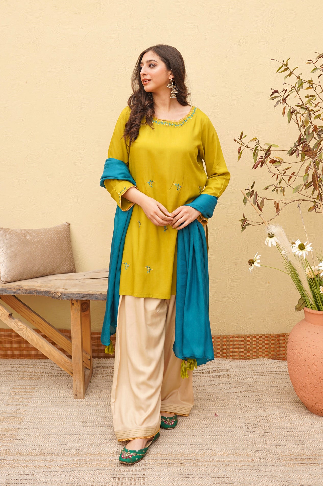 Lime kurta adorned with teal and lemon embroidery on the square neckline and sleeves. Paired with a fawn farshi shalwar and a teal blue contrast silk dupatta for a breezy, effortless look.