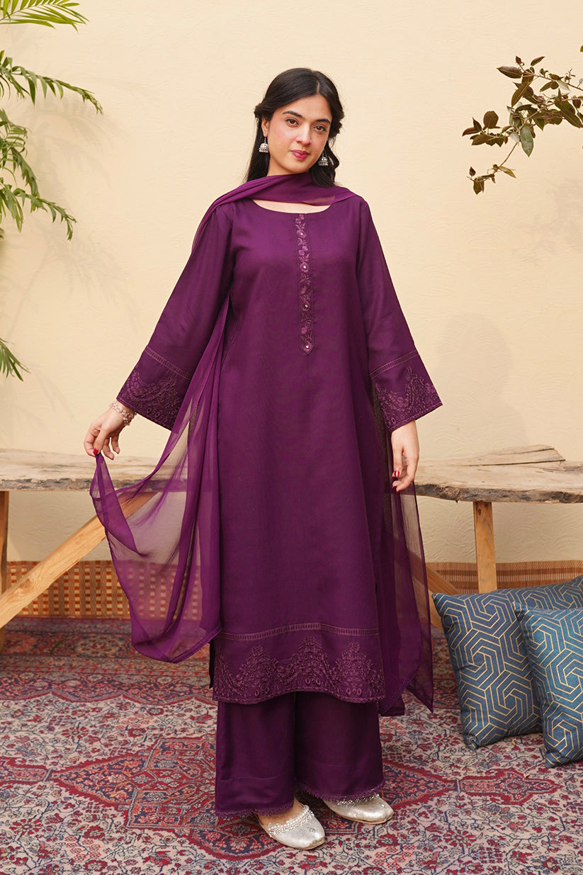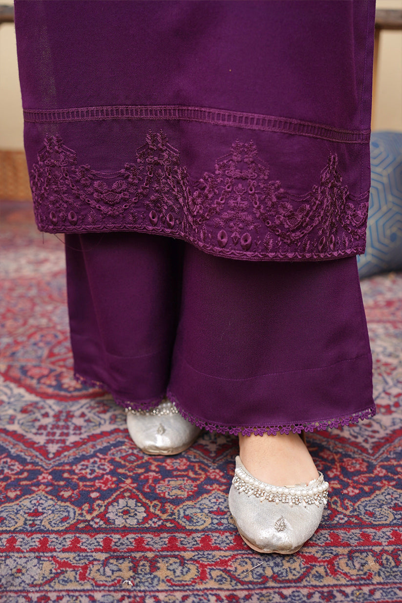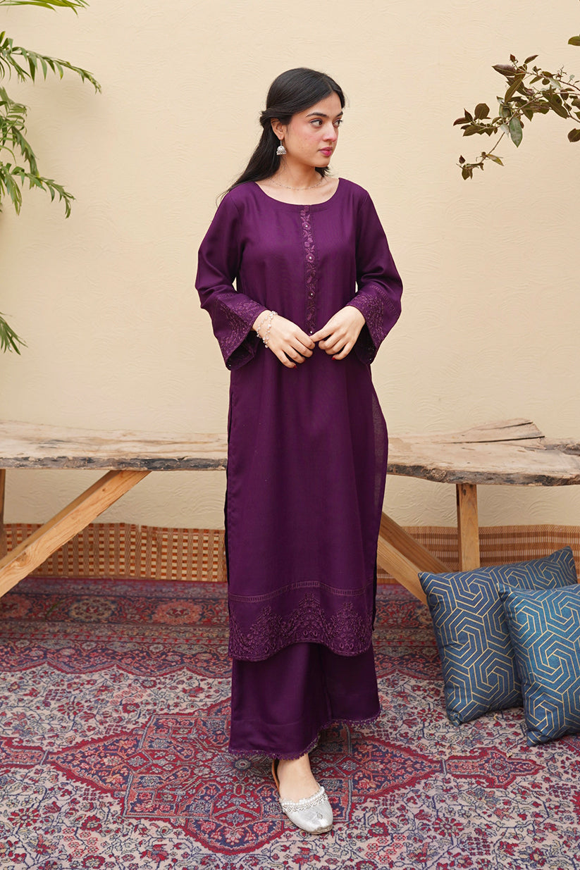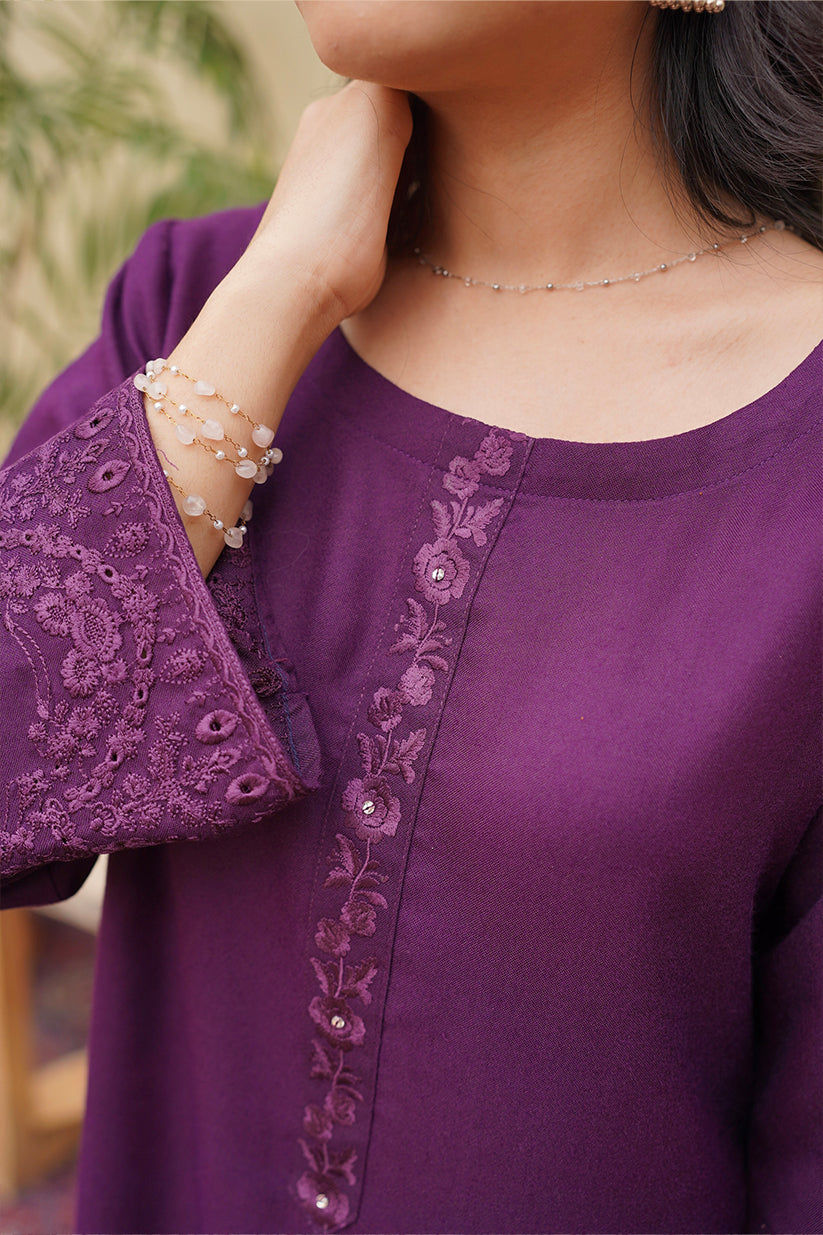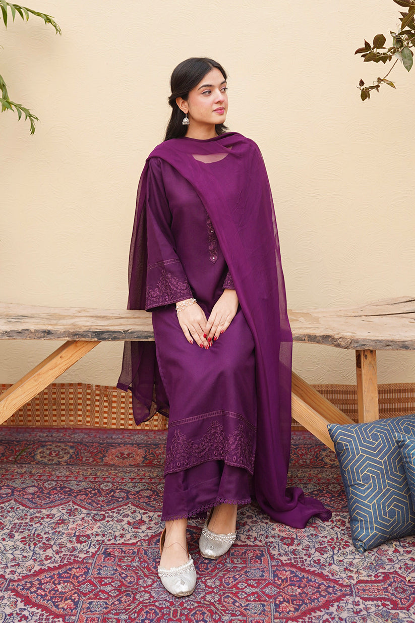 Our beautiful plum kurta set adorned with intricate embroidery, boring, and lace detailing on the neckline, sleeves, and hem, delicately enhanced with sitara chamak for refined elegance. Paired with matching culottes and dupatta for a complete, graceful look.