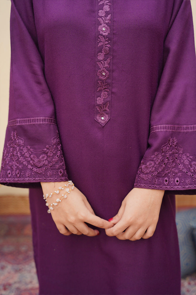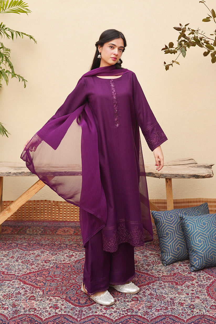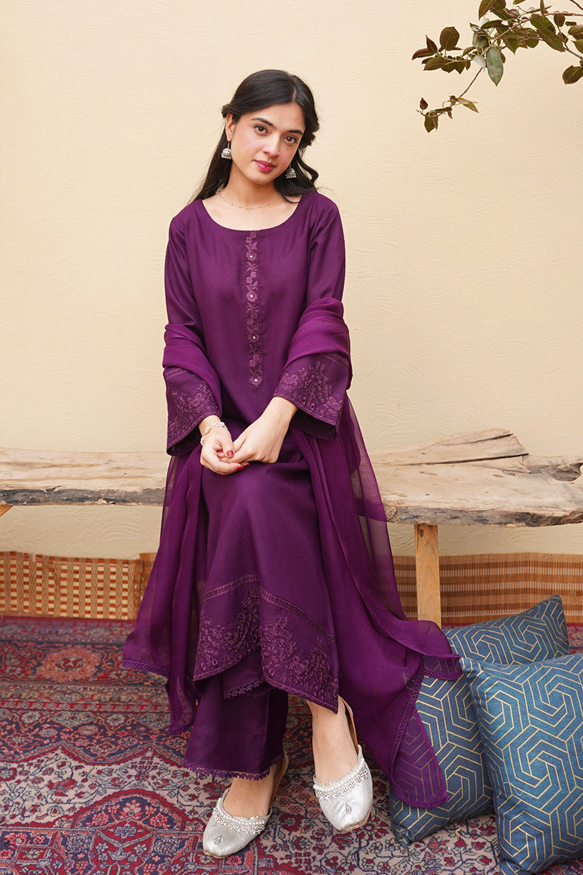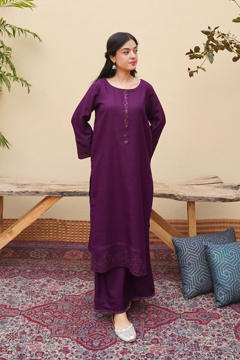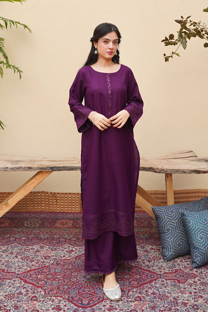 Our beautiful plum kurta set adorned with intricate embroidery, boring, and lace detailing on the neckline, sleeves, and hem, delicately enhanced with sitara chamak for refined elegance. Paired with matching culottes and dupatta for a complete, graceful look.