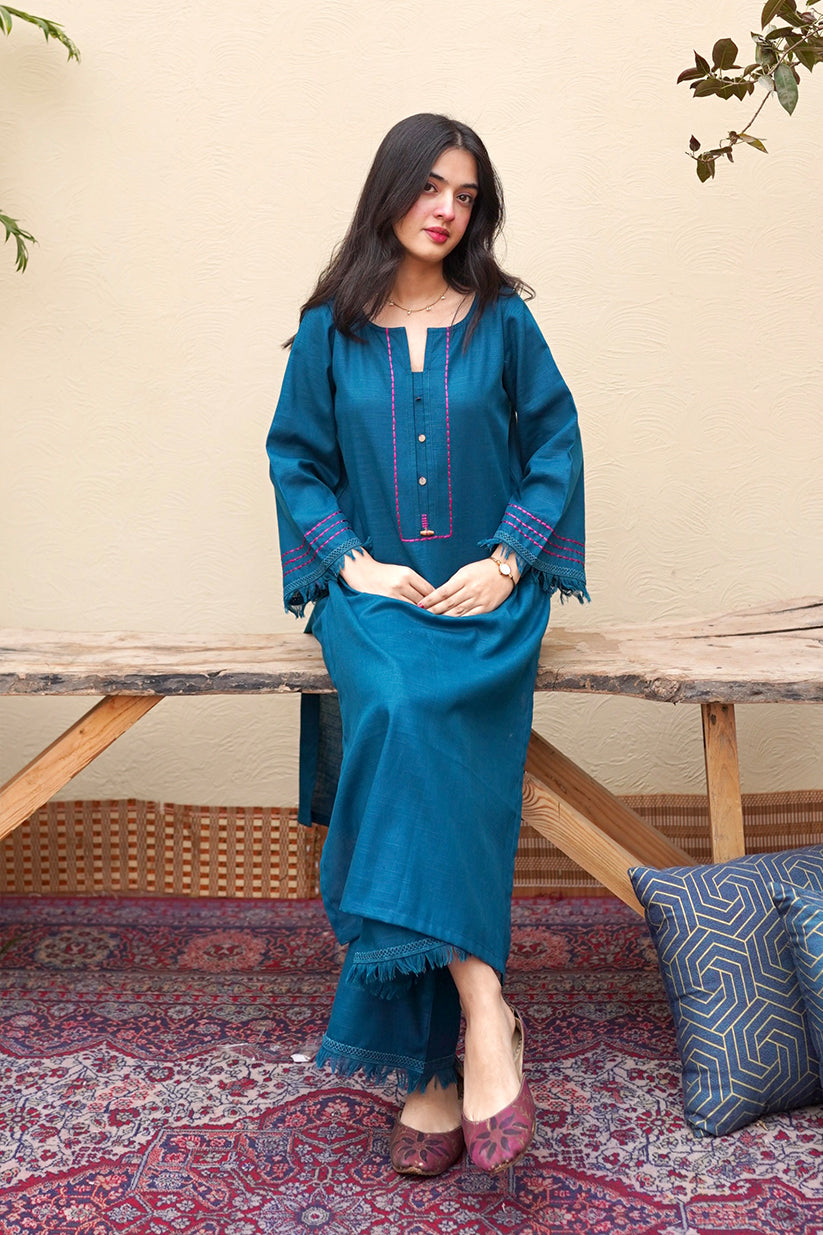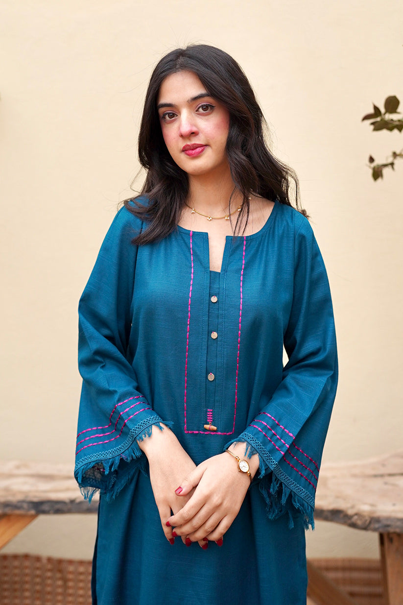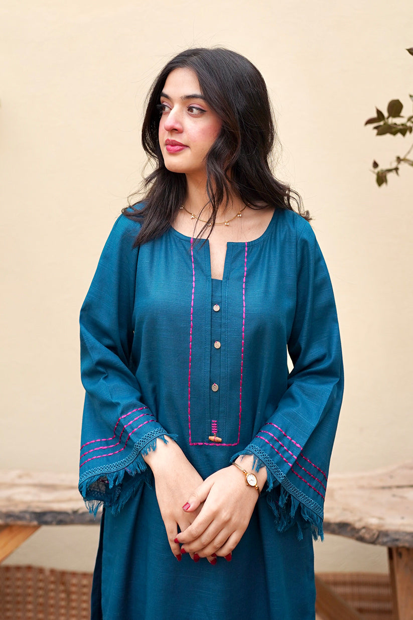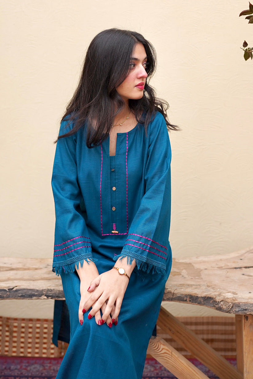 Our 2-piece teal ensemble, magenta delicatel embroidery on the neckline and sleeves, featuring intricate button detailing, refined lace accents, and subtle fringes. Perfectly paired with culotte pants for a polished, complete look.