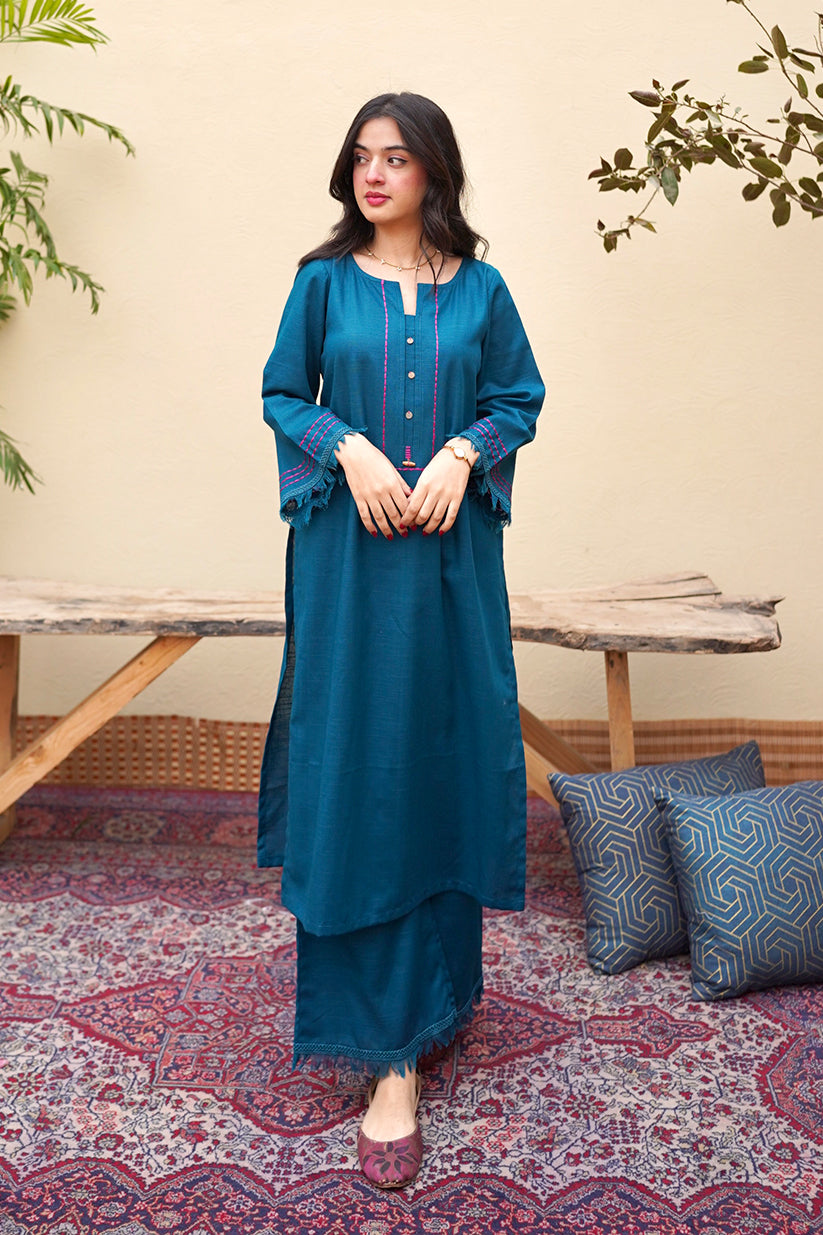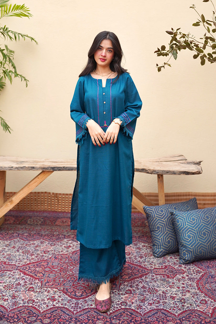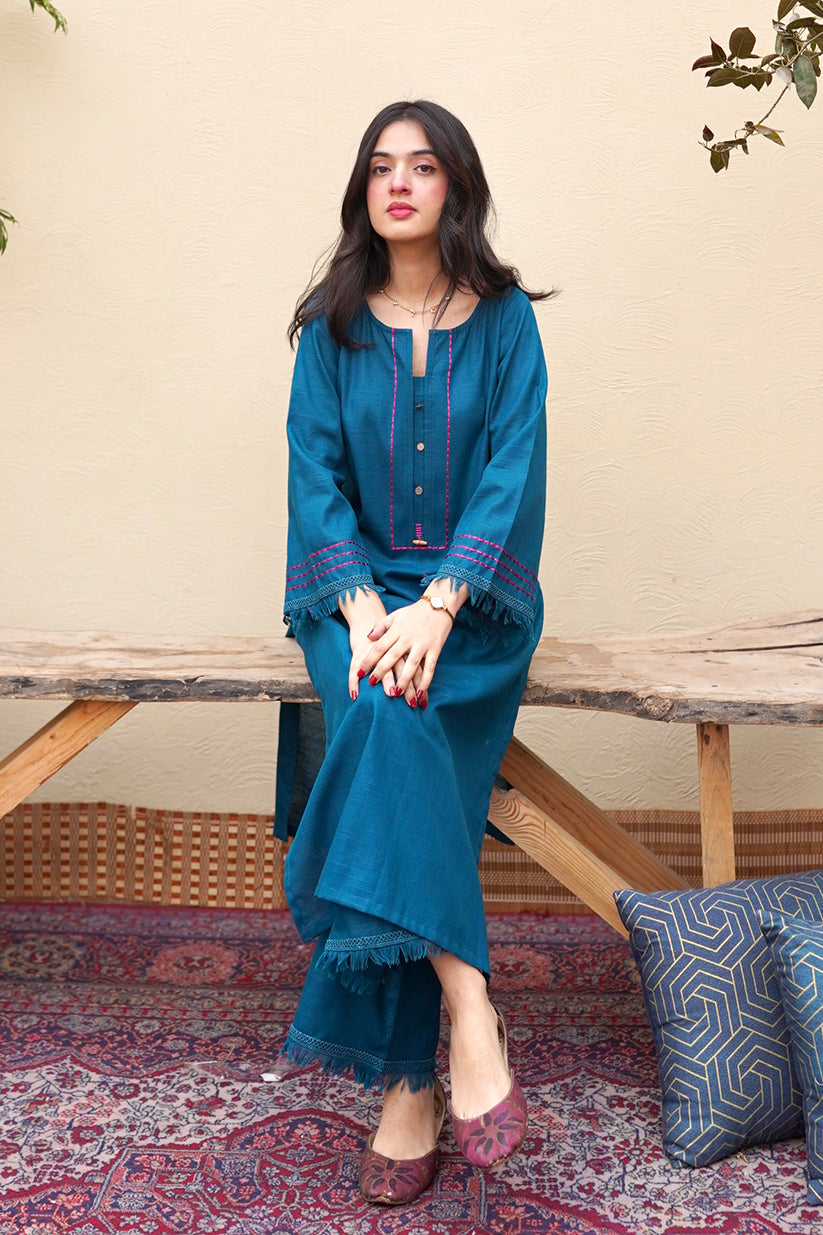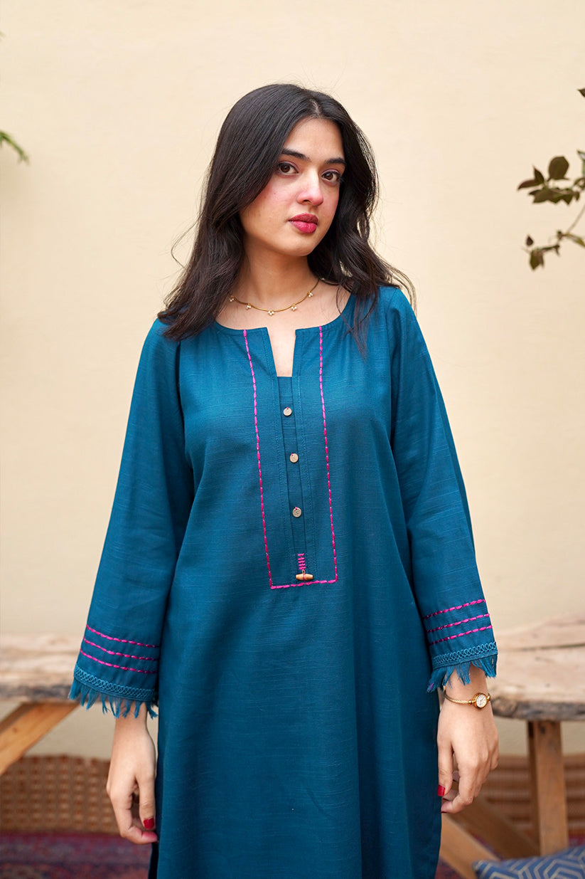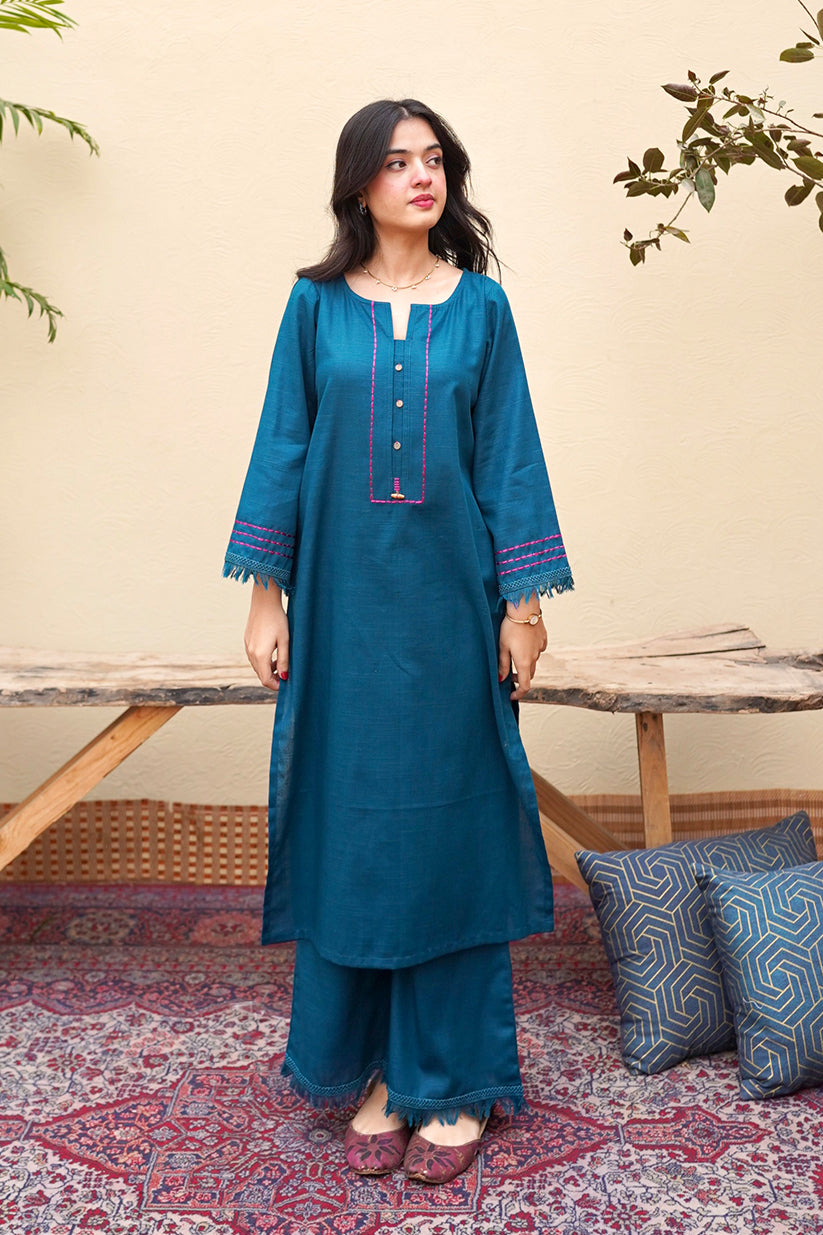 Our 2-piece teal ensemble, magenta delicatel embroidery on the neckline and sleeves, featuring intricate button detailing, refined lace accents, and subtle fringes. Perfectly paired with culotte pants for a polished, complete look.