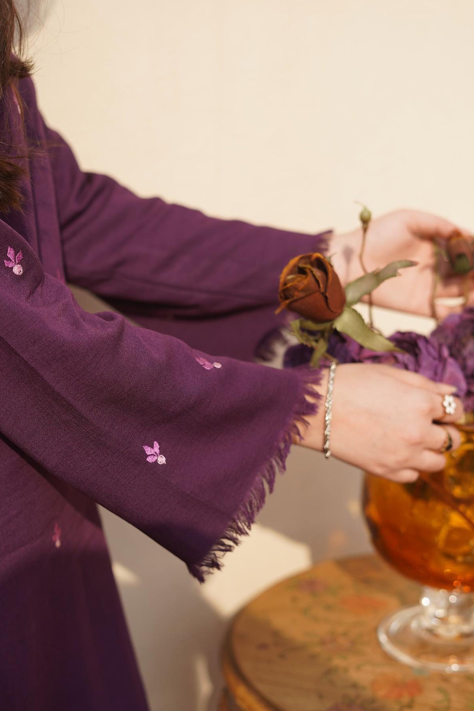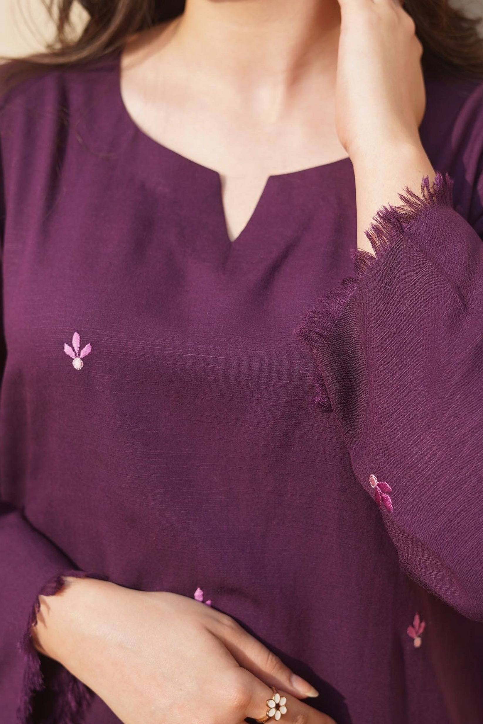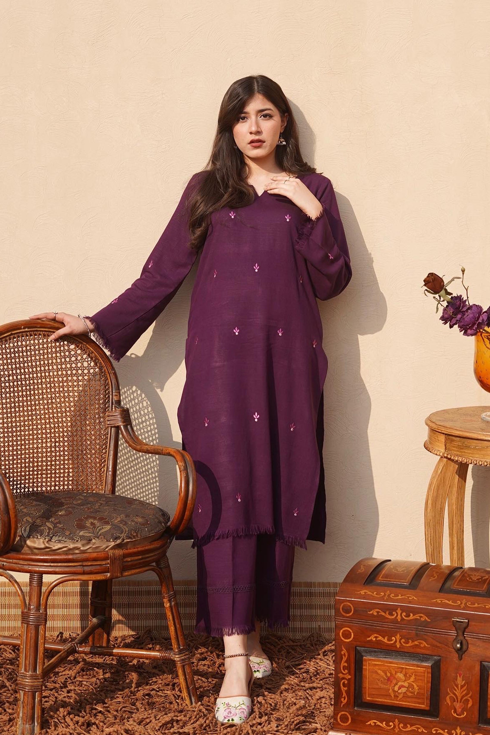 This 2-Piece Mulberry dress with floral embroidery sprinkles of lilac all over. Hem and sleeves enhanced with delicate fringes. Paired with azaar pants adorned with lace and organza details on the flapper.