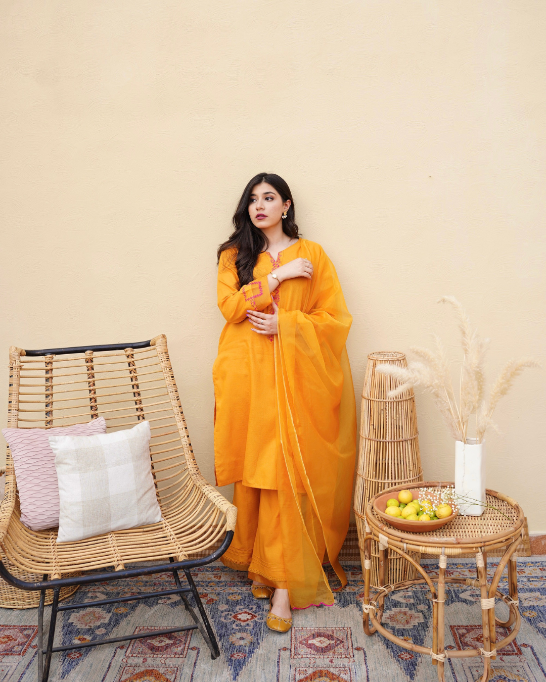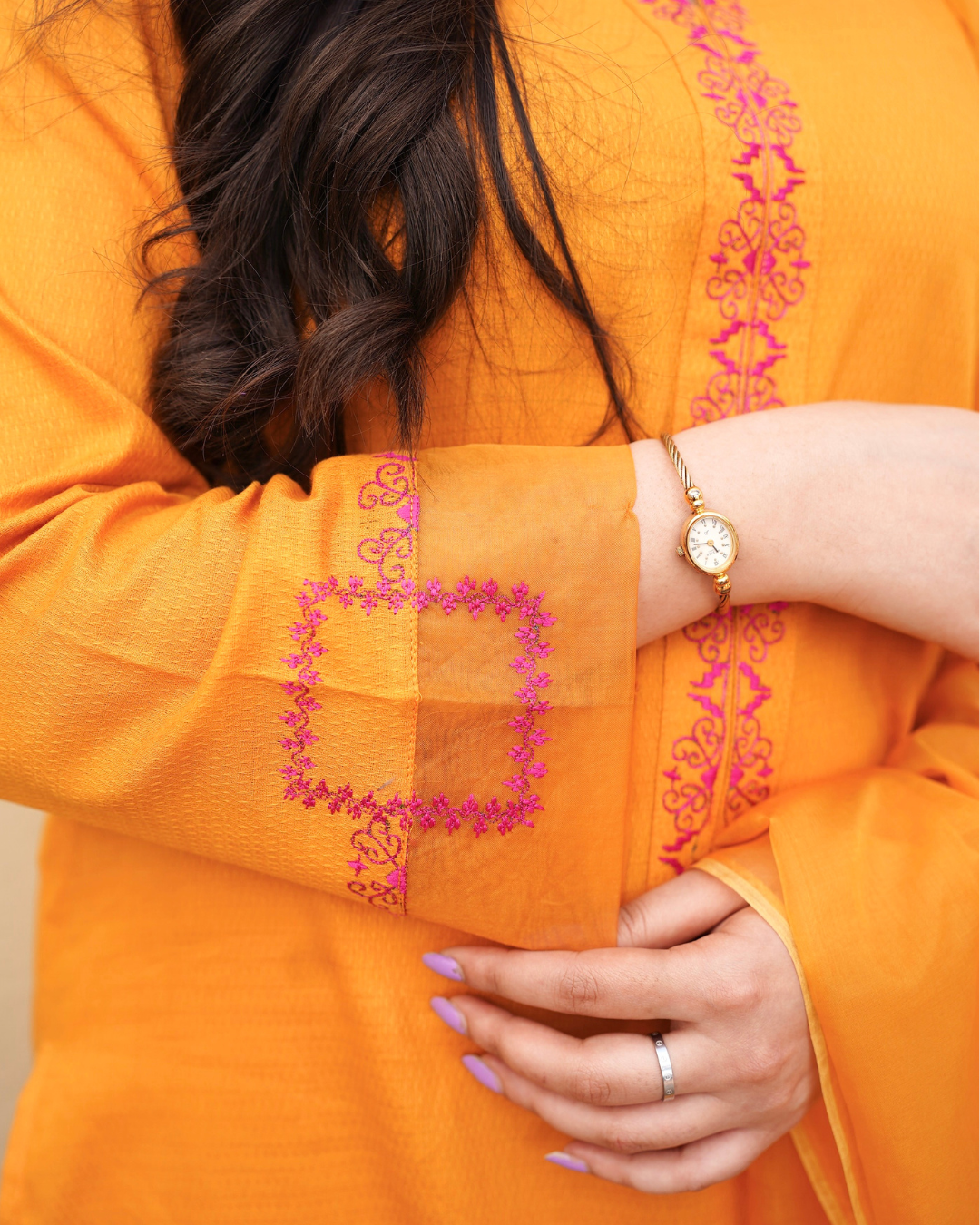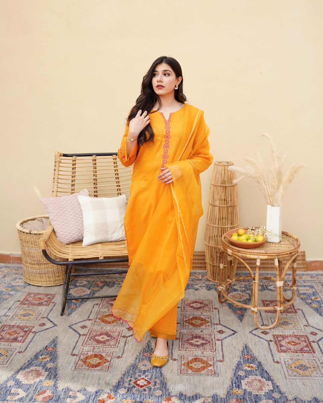 This 3-Piece Mustard dress with delicate hot pink embroidery & organza on neckline and sleeves.