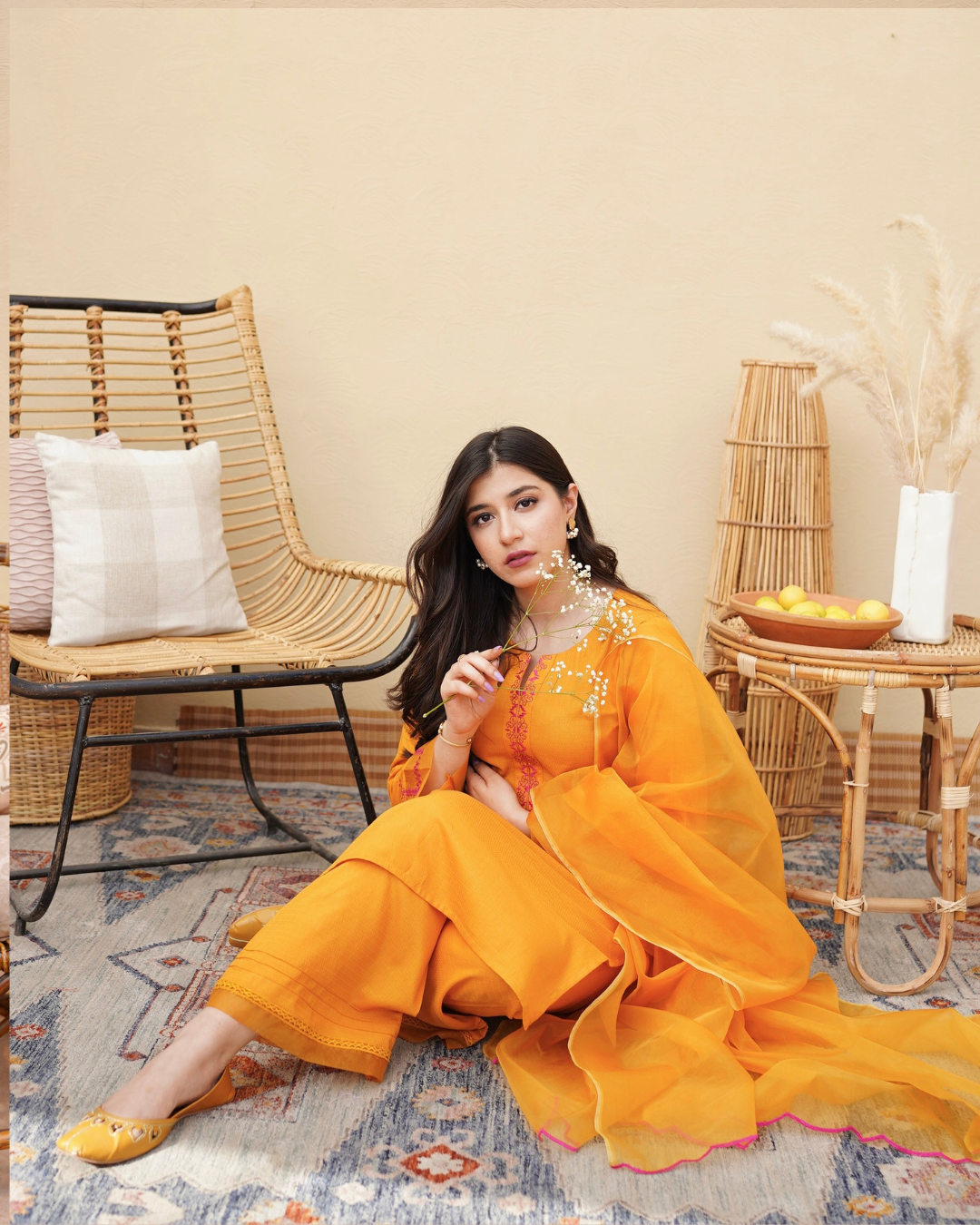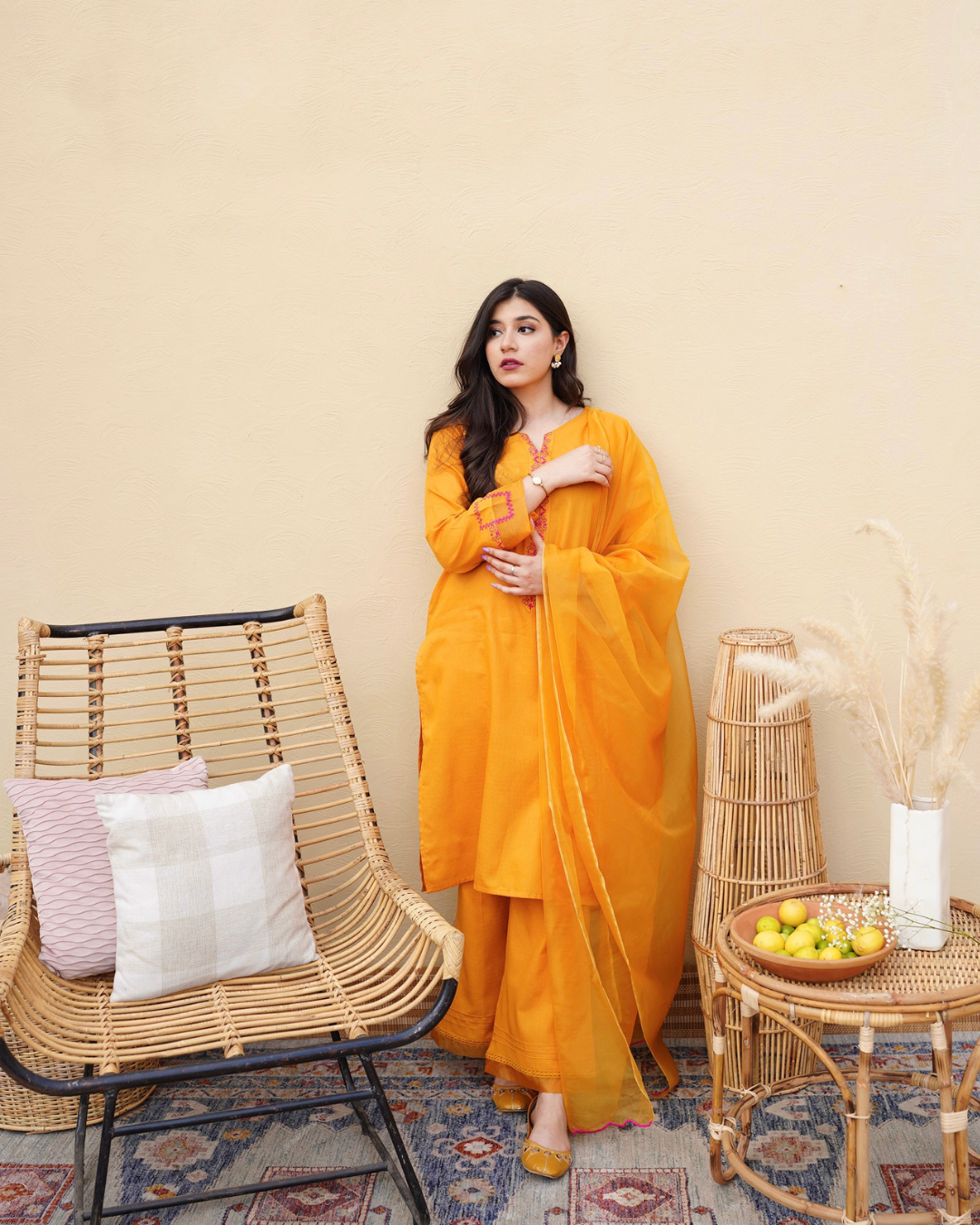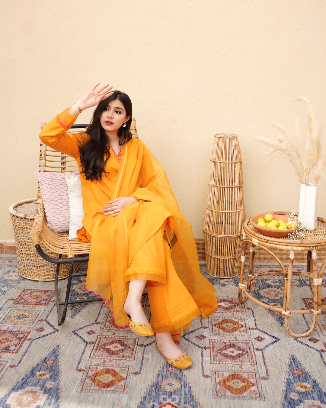 This 3-Piece Mustard dress with delicate hot pink embroidery & organza on neckline and sleeves.
