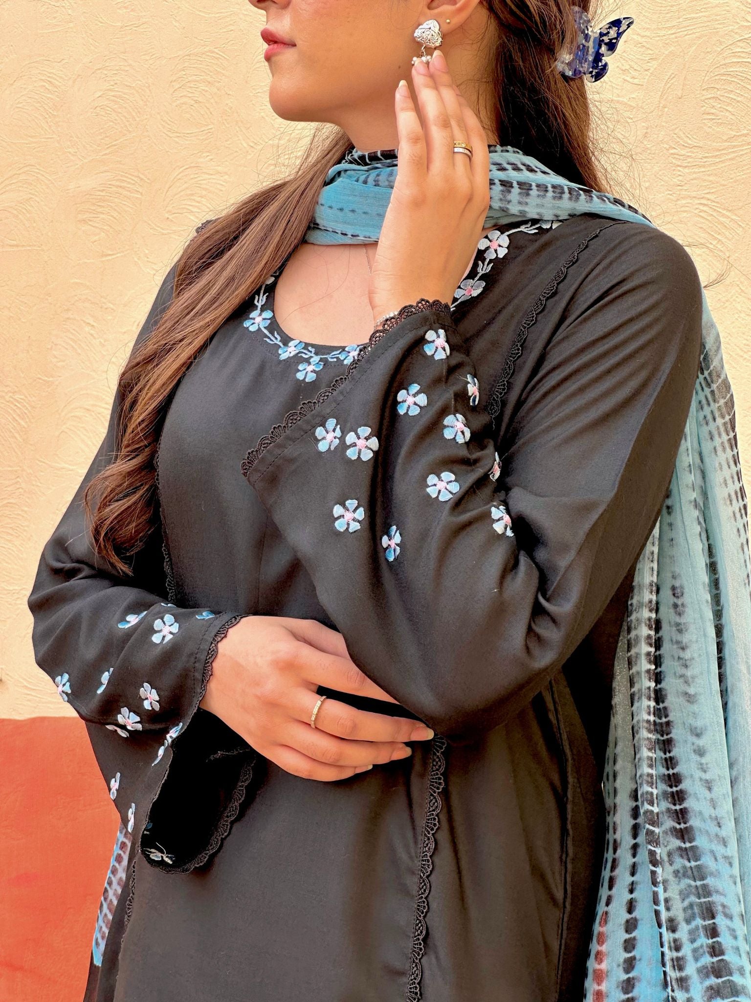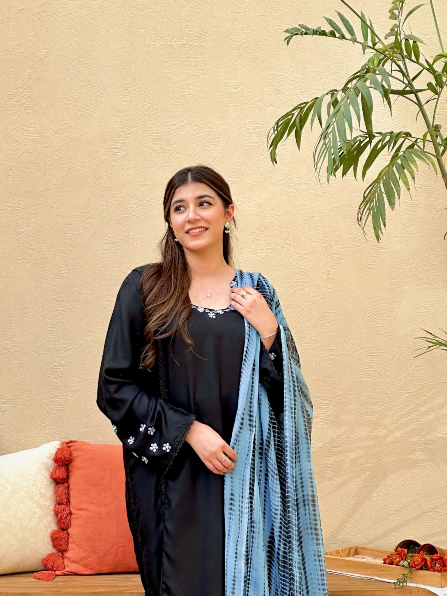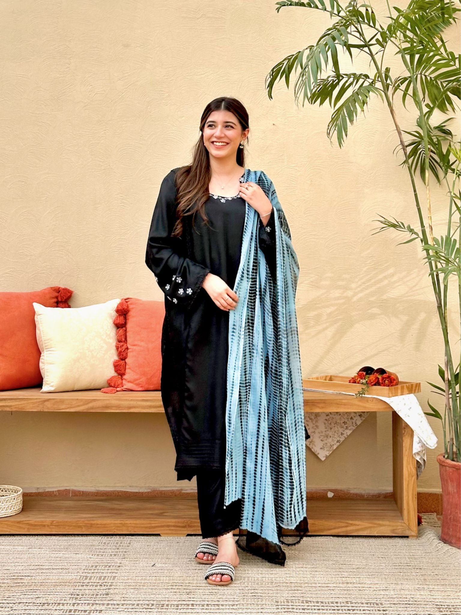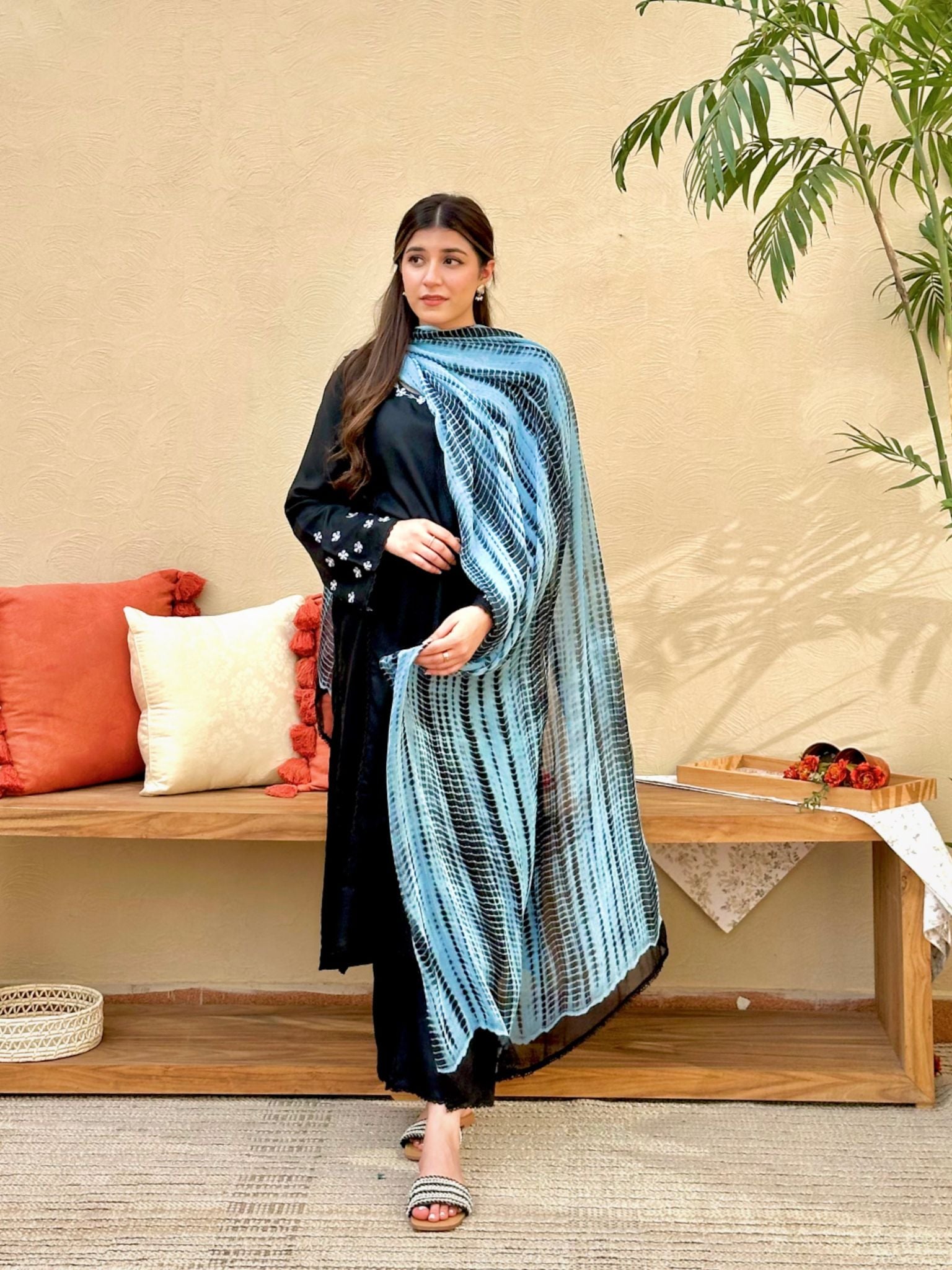 This Black 3-Piece is adorned with delicate steel blue daisies, a symphony of elegance. Paired with the star artistry of our contrast-dyed dupata