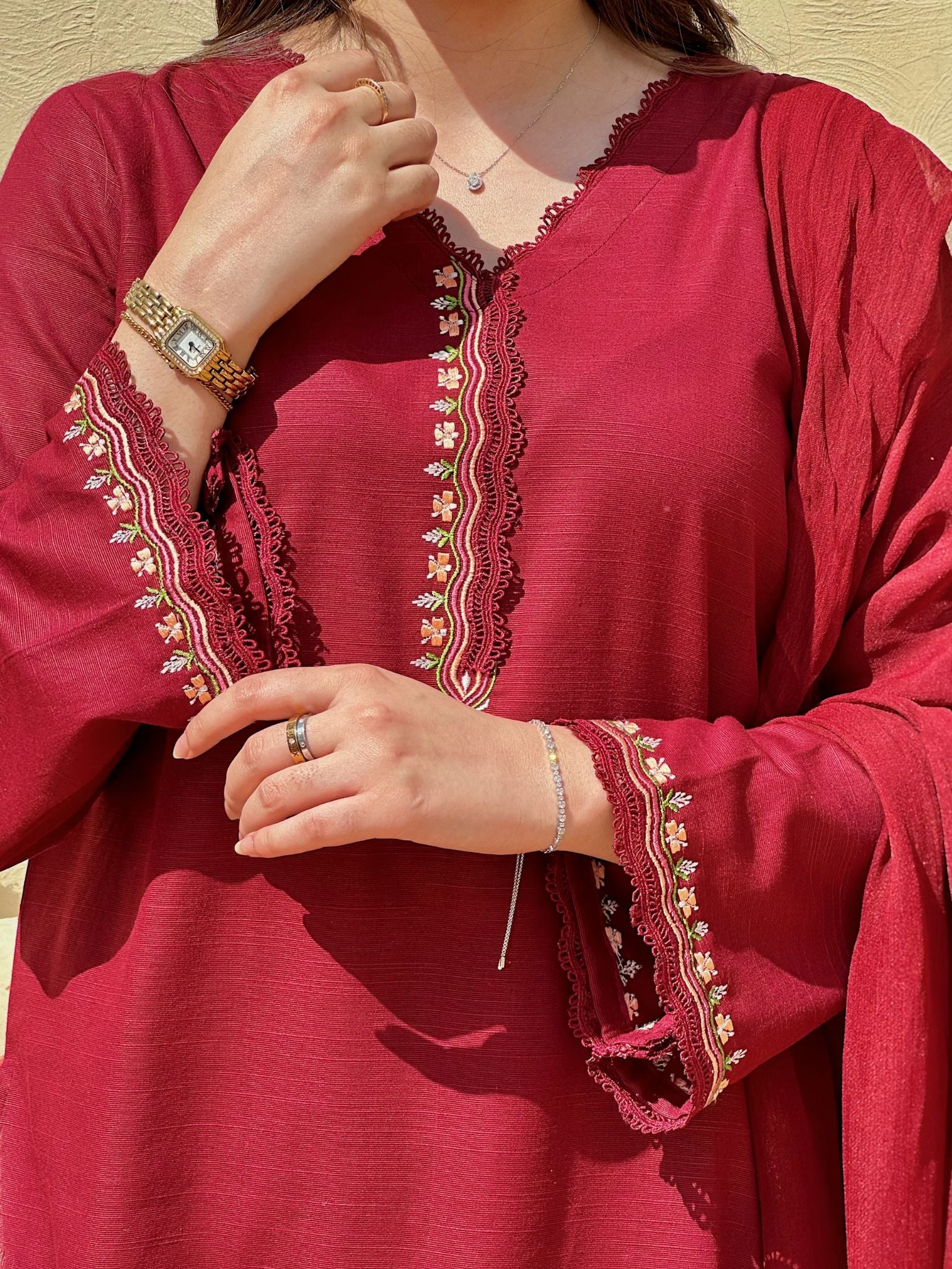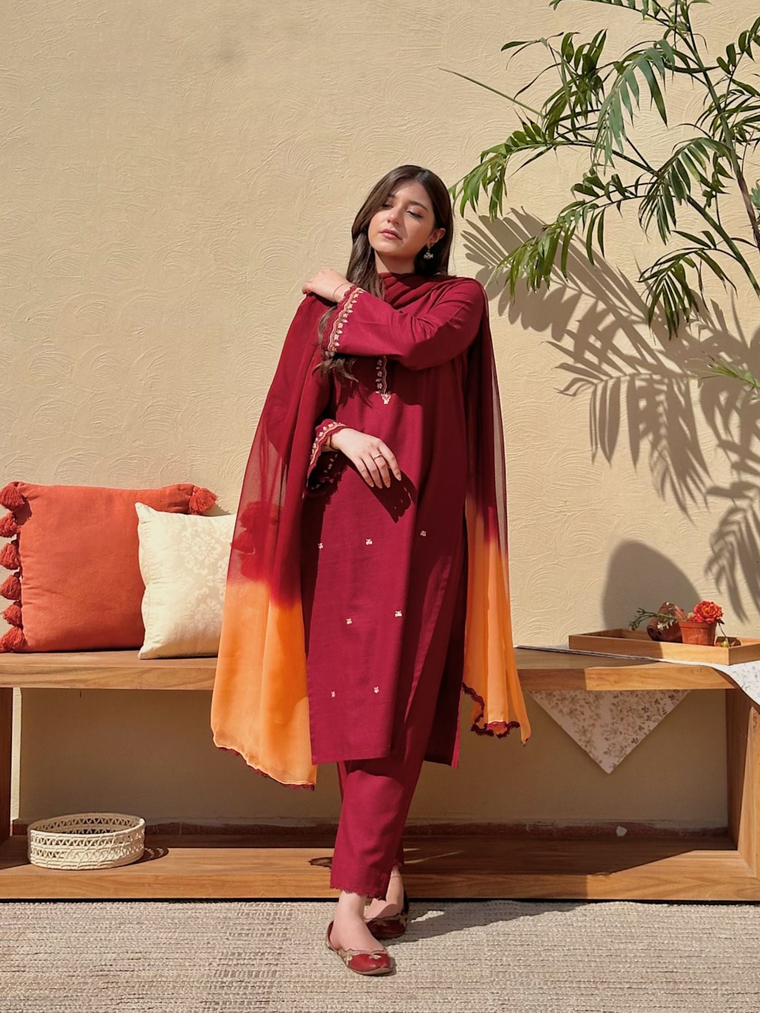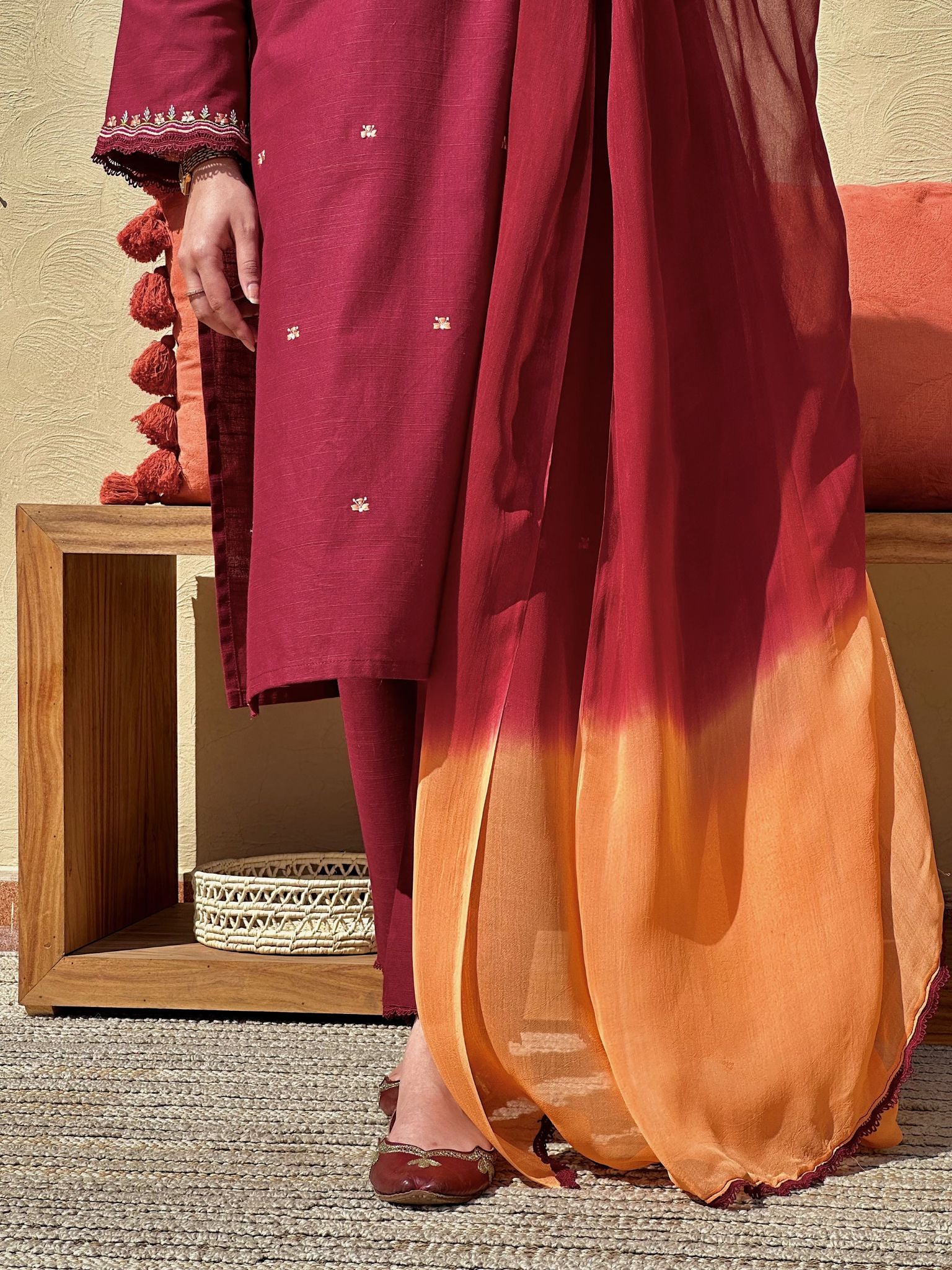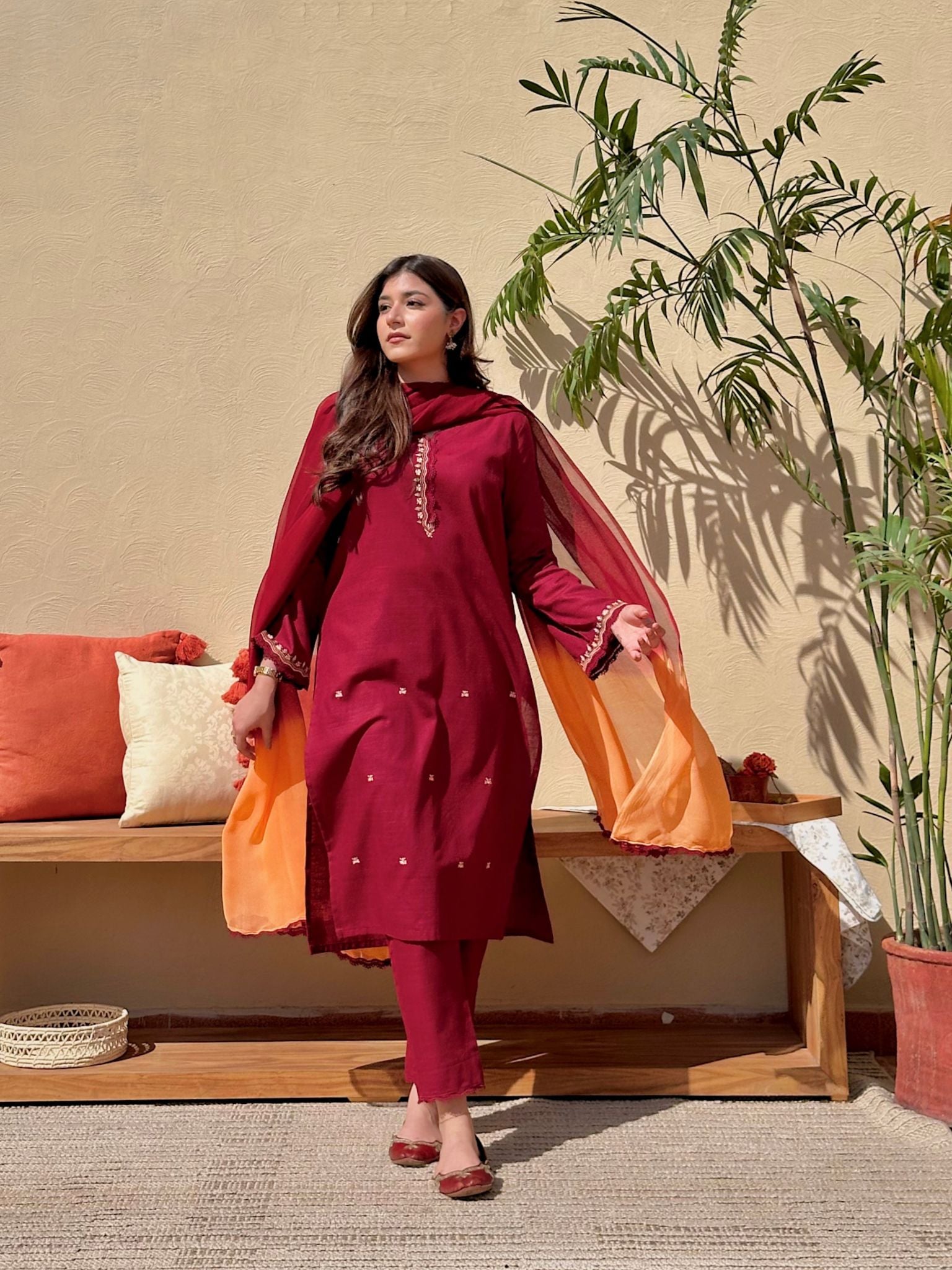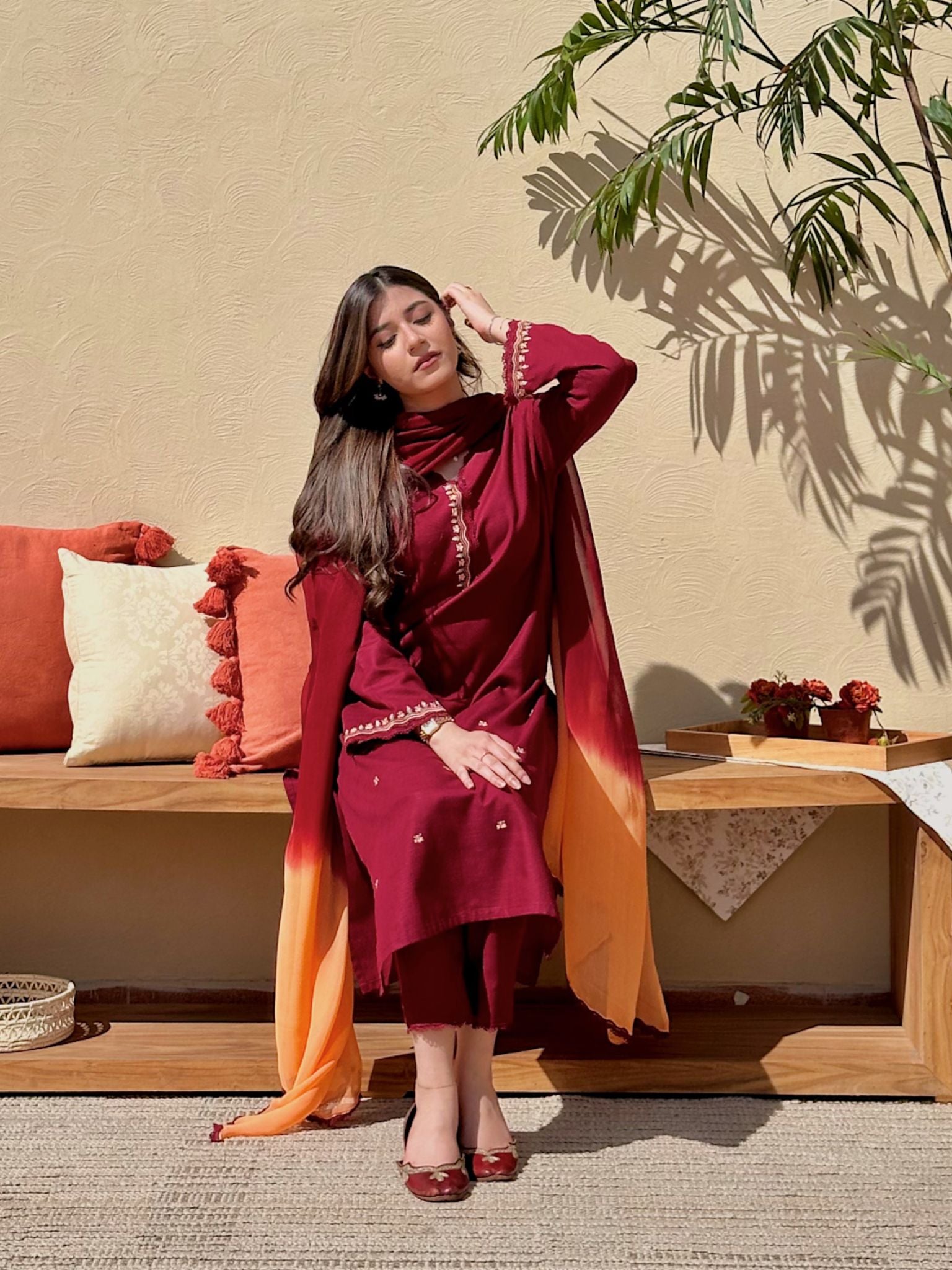 Garnet 3-piece set featuring elegant multi-color embroidery on the sleeves, neckline, and sprinkled on the shirt with delicate lace detailing. Paired with a stunning contrast tangerine dip-dye dupatta.