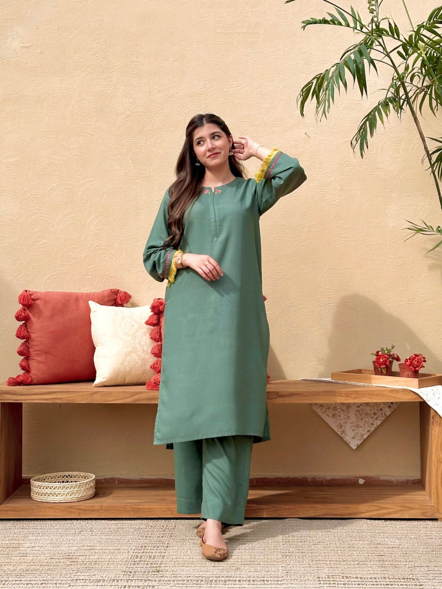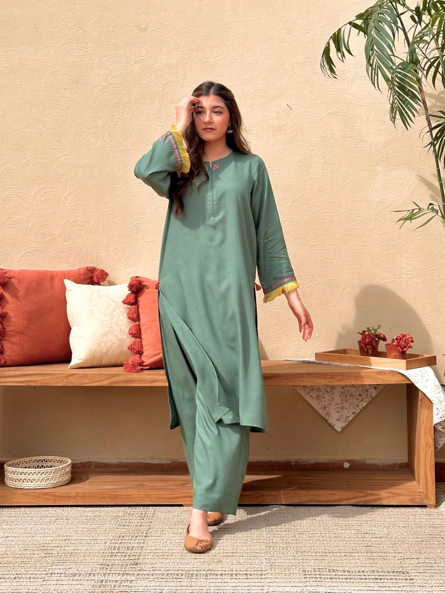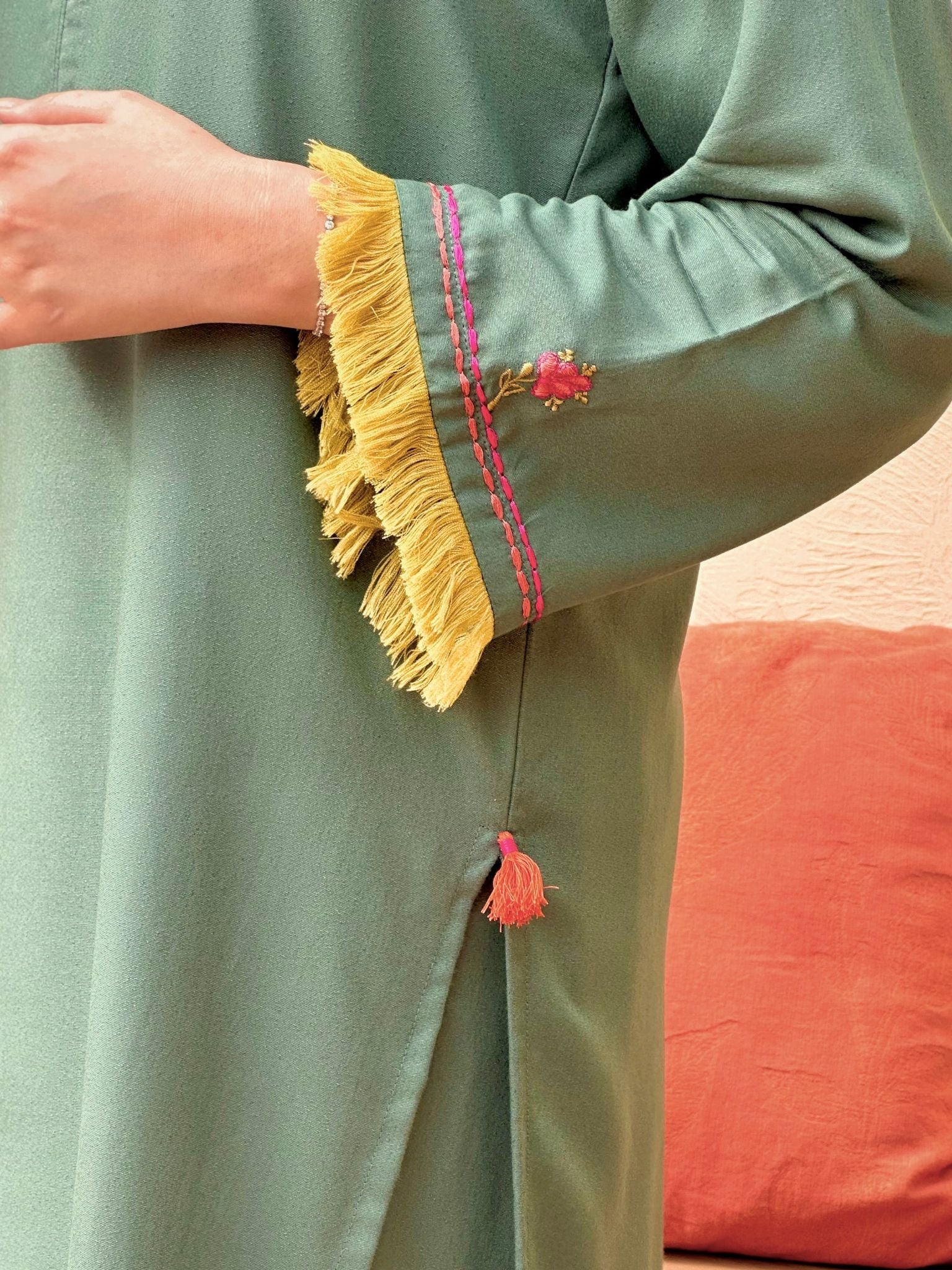 This 2-piece set with eye-catching lime fringes on sleeves and peachy pink floral embroidery on sleeves and neckline. Adorned with pearls, tassels on the side, and paired with straight pants.