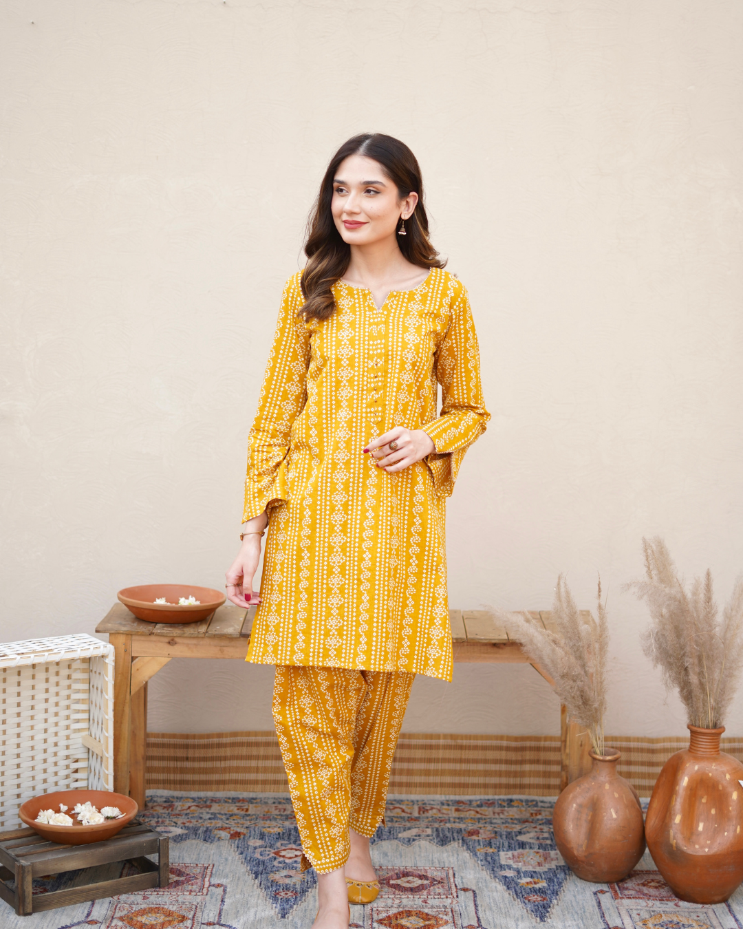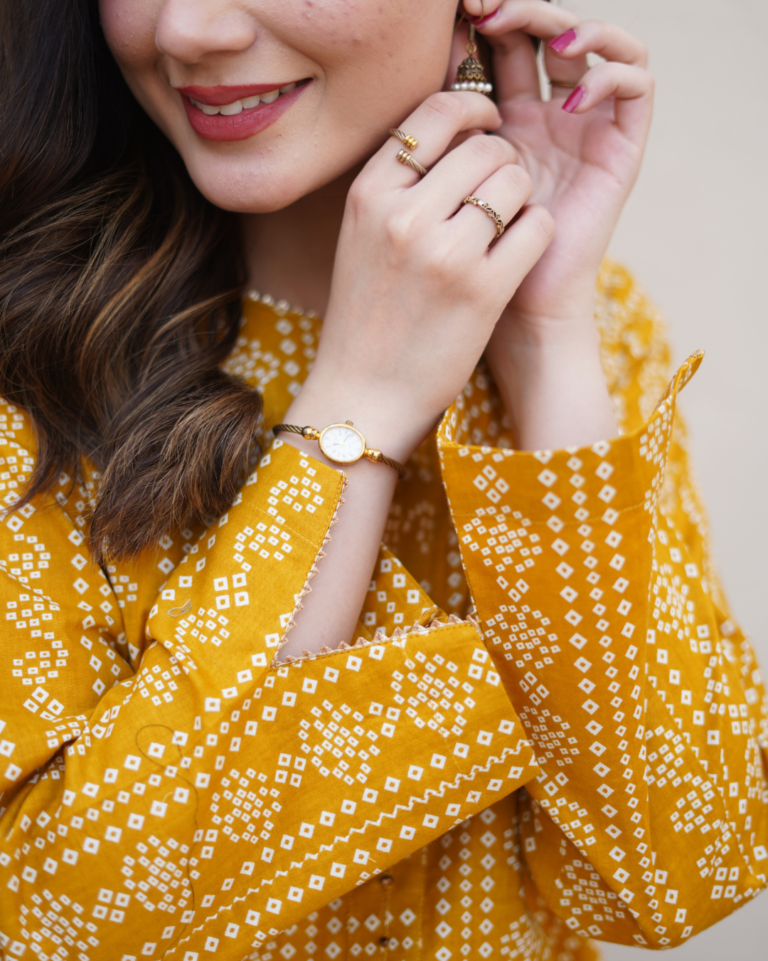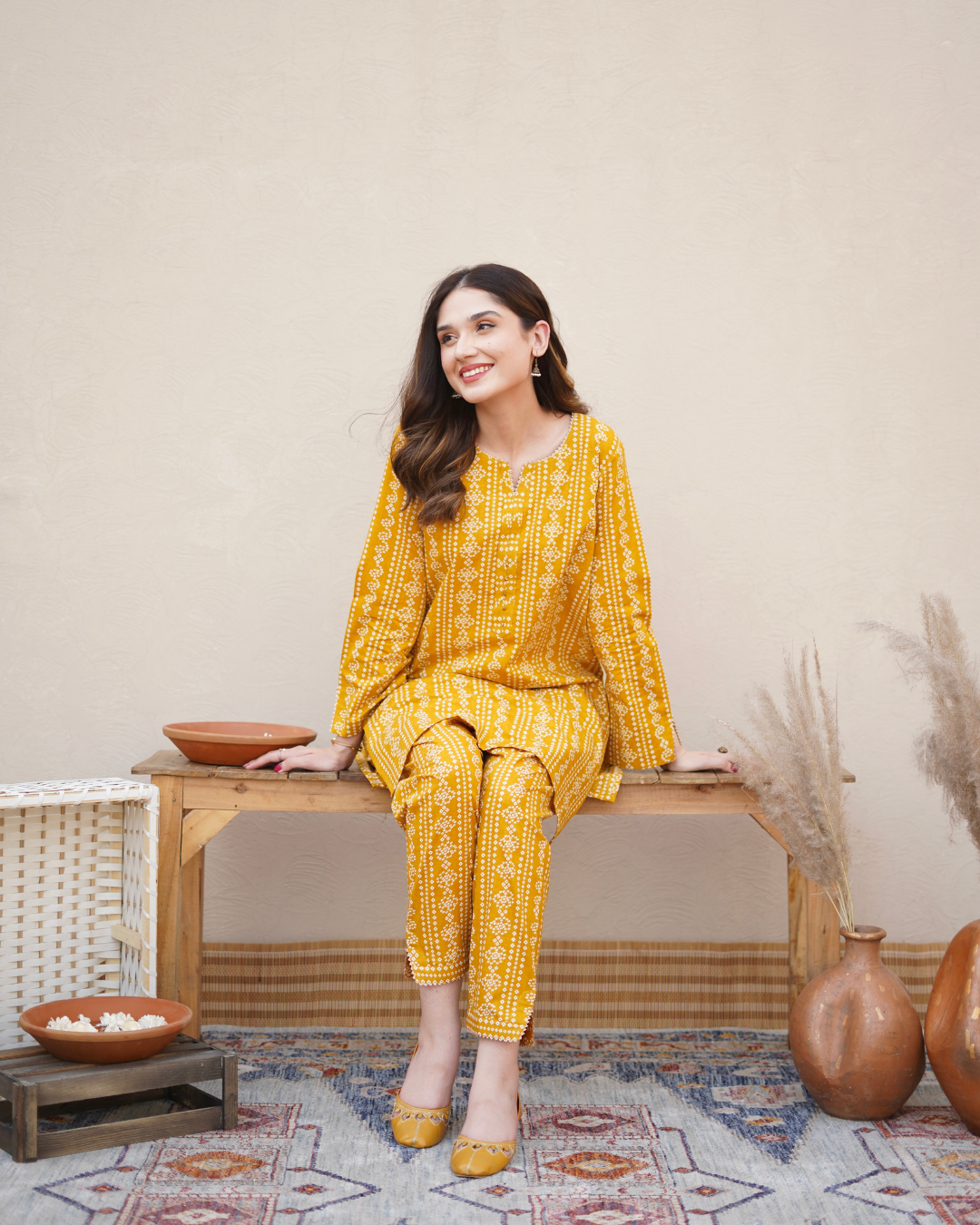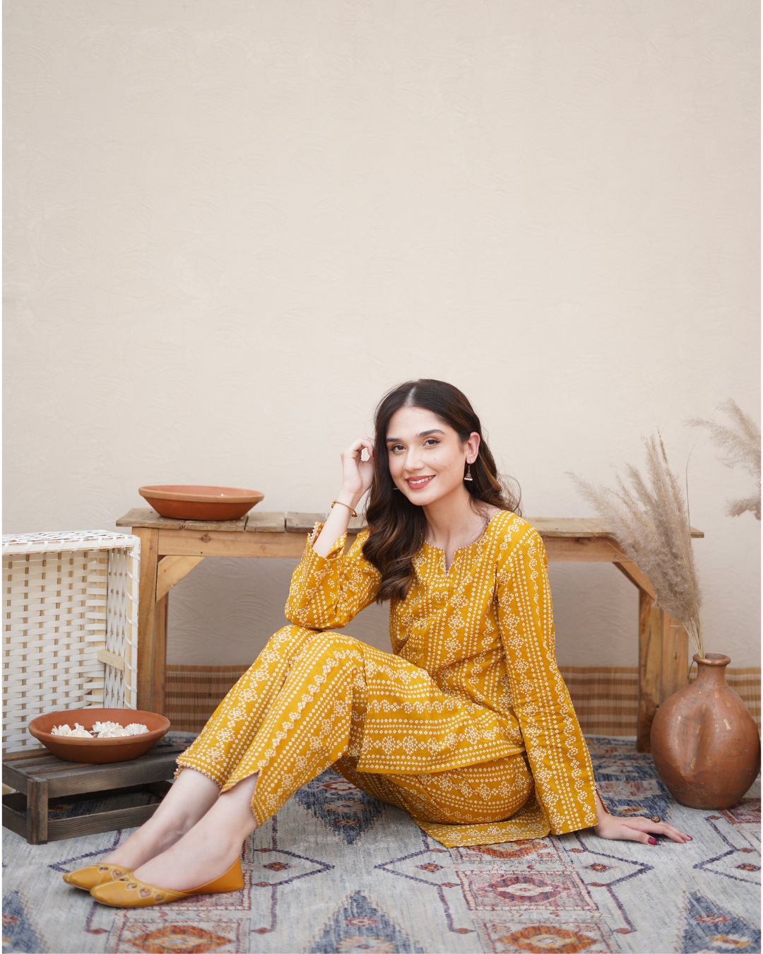 Chunri kurta with gota lace and droops on the neckline and sleeves, paired with a matching shalwar adorned with lace.
