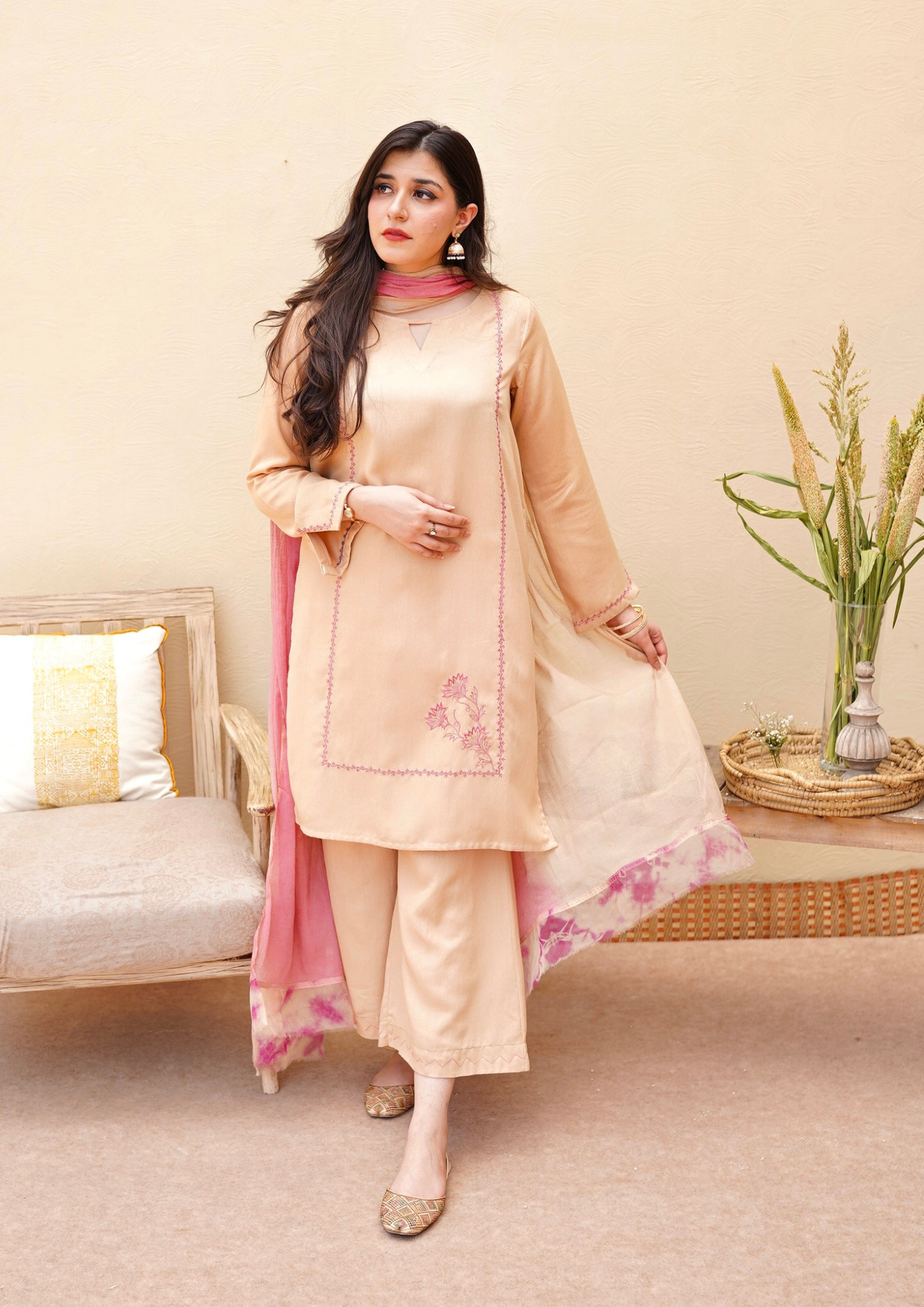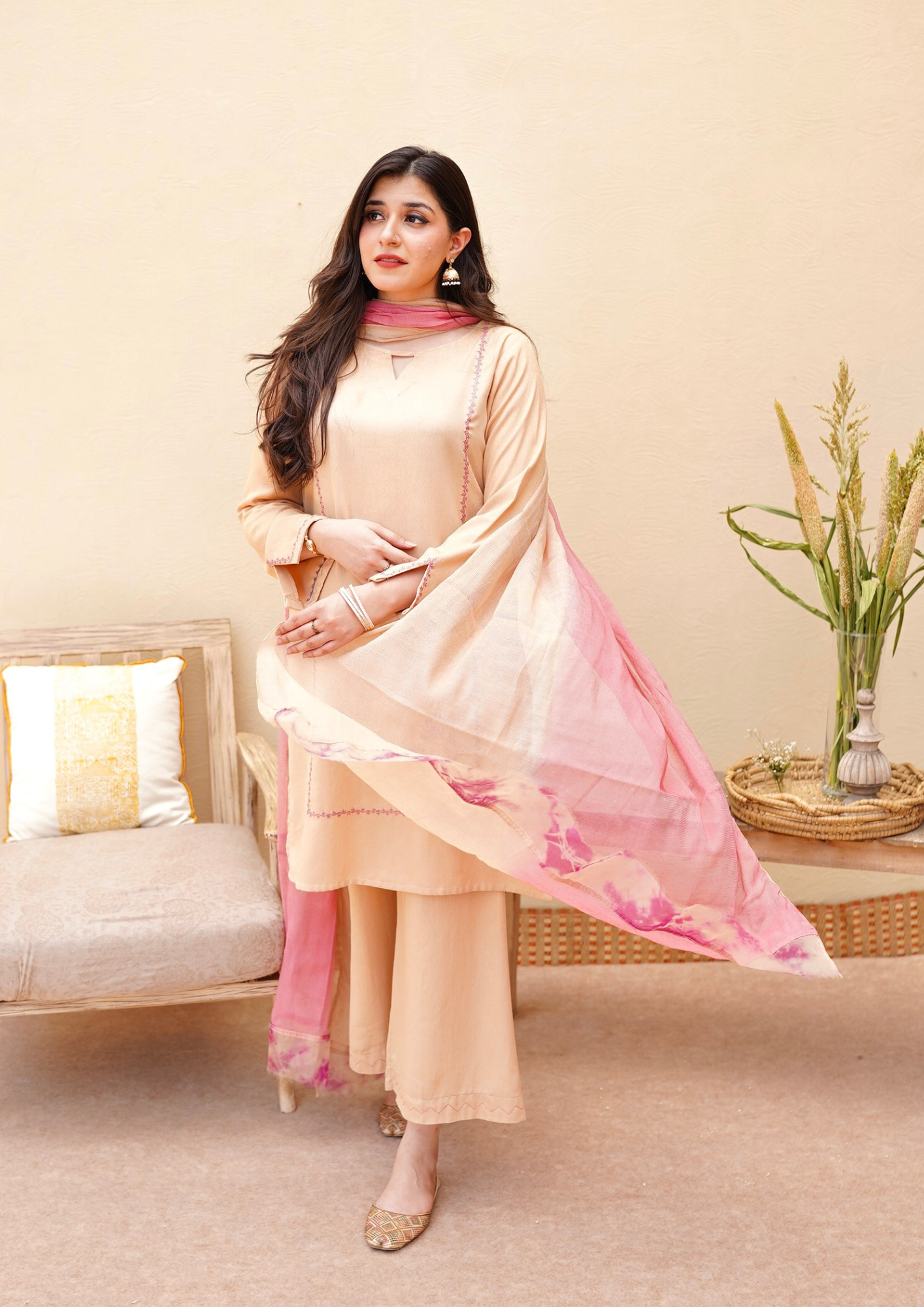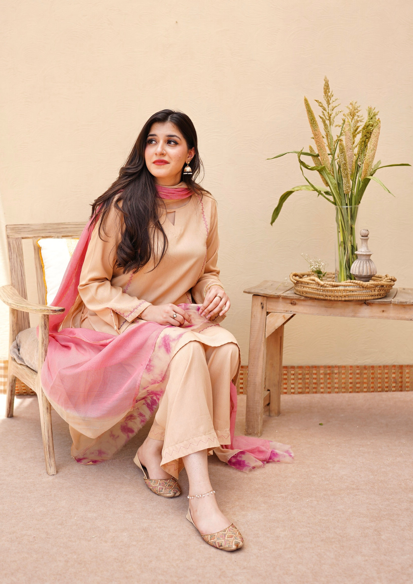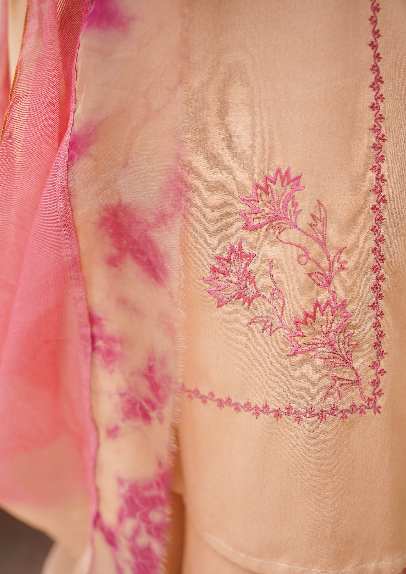 Our Kurta comes with intricate powder pink embroidery details. Paired with our matching culotte pants. You can also add our cotton net dupata enhanced with tie dye.