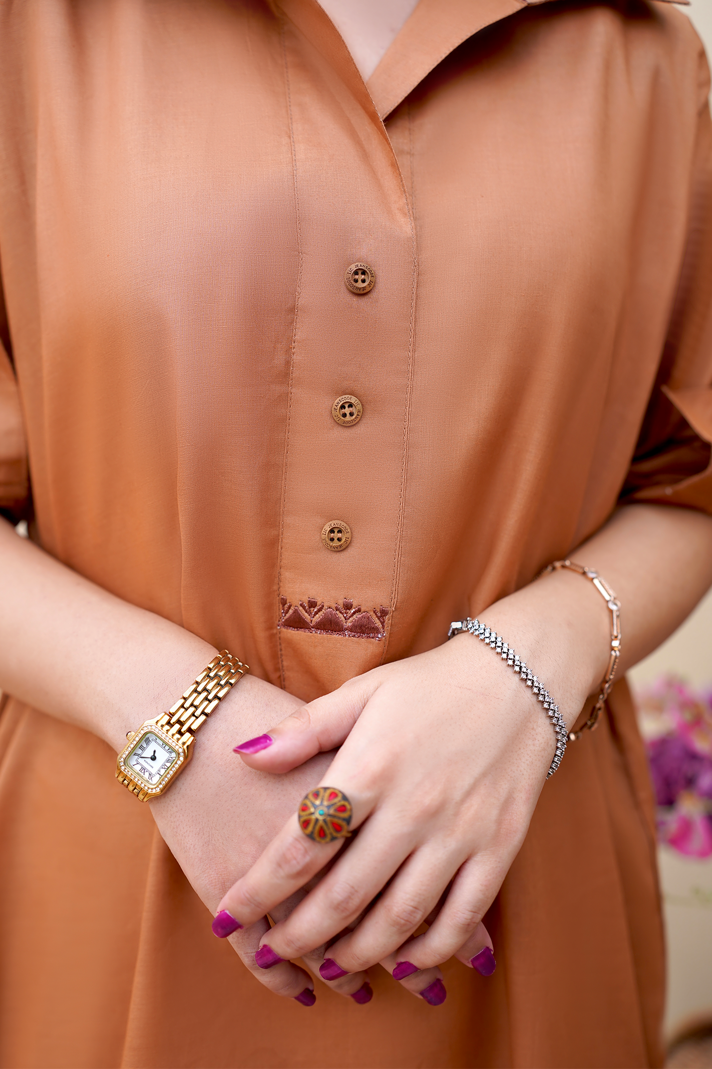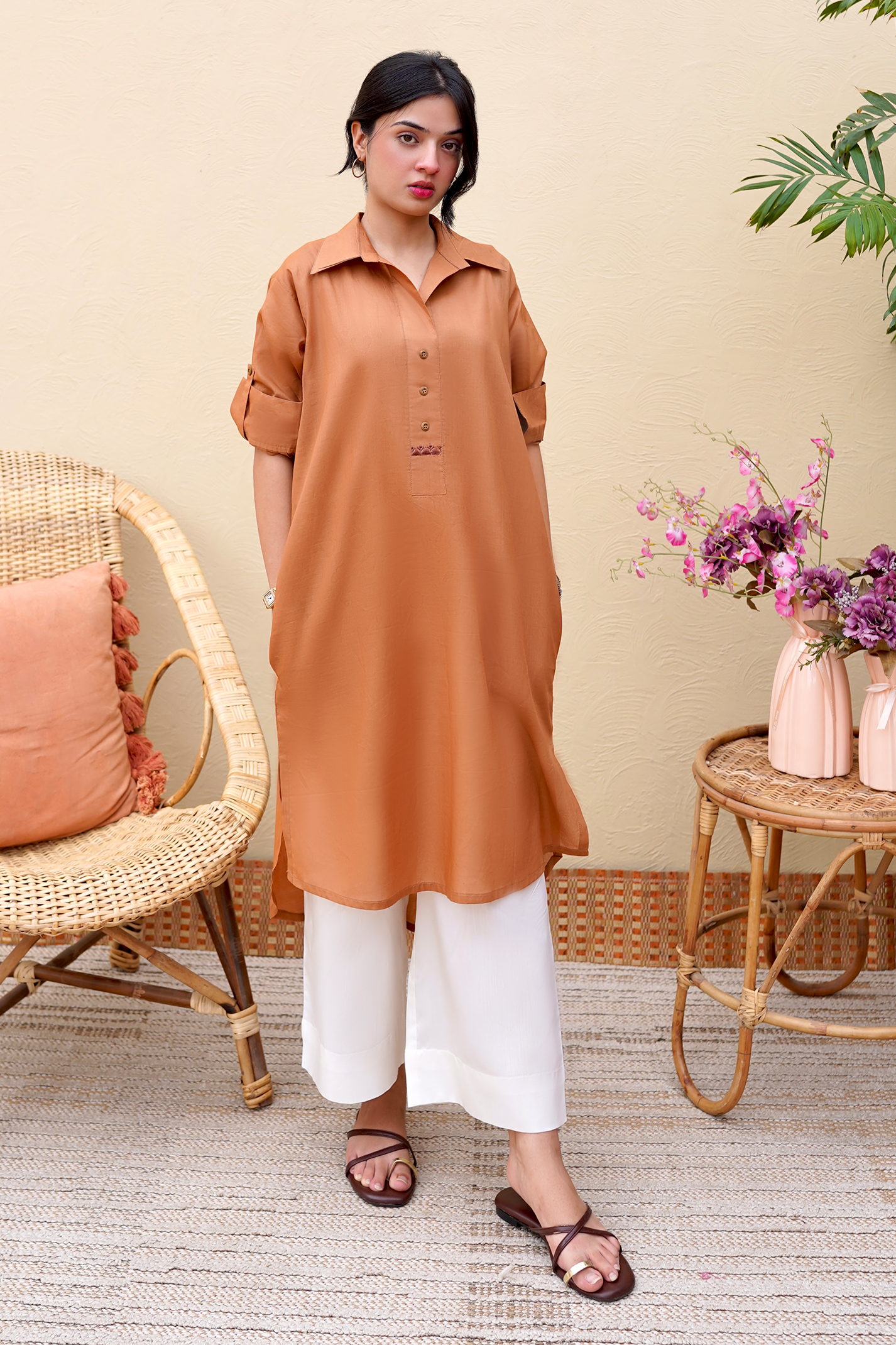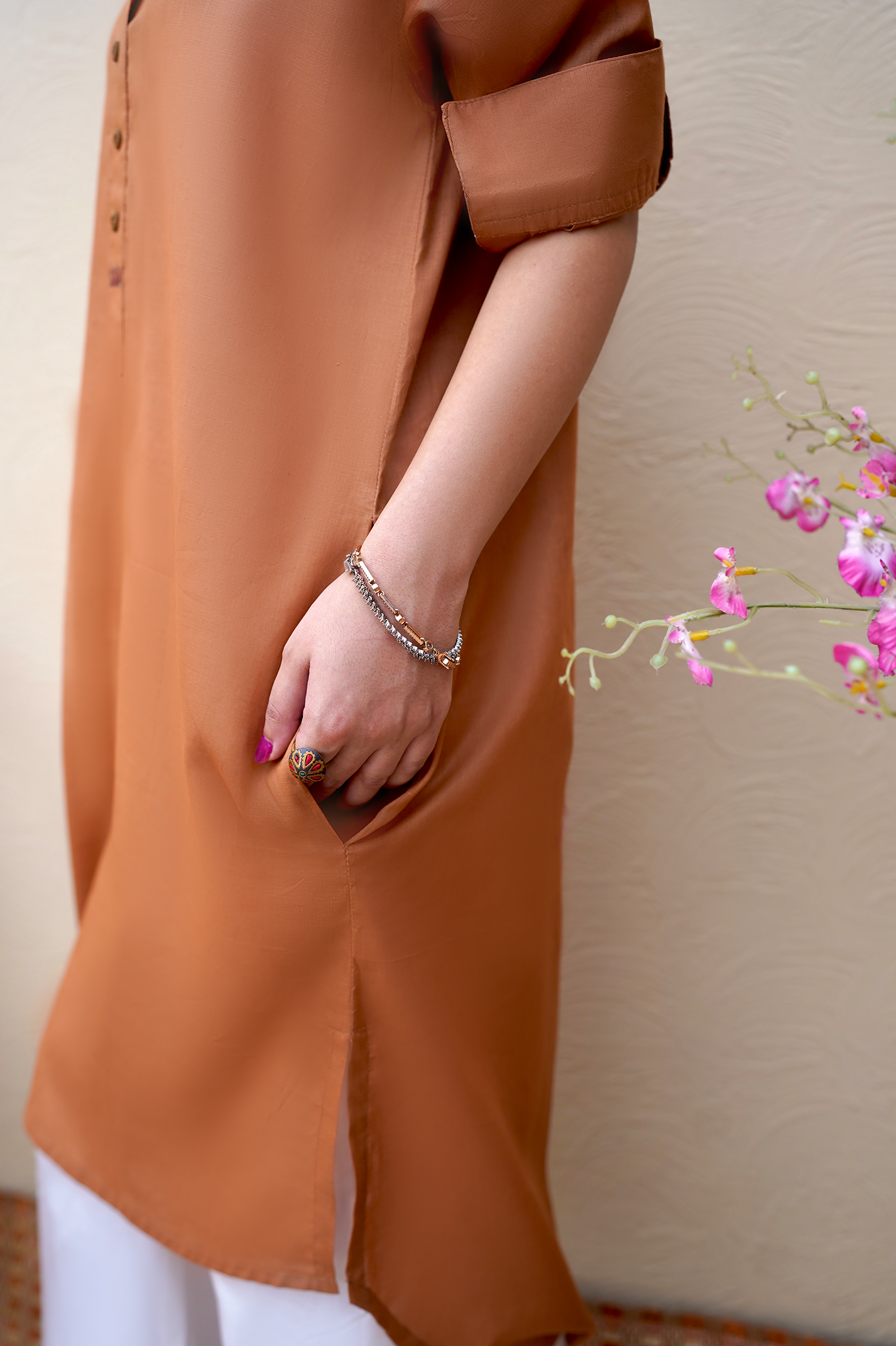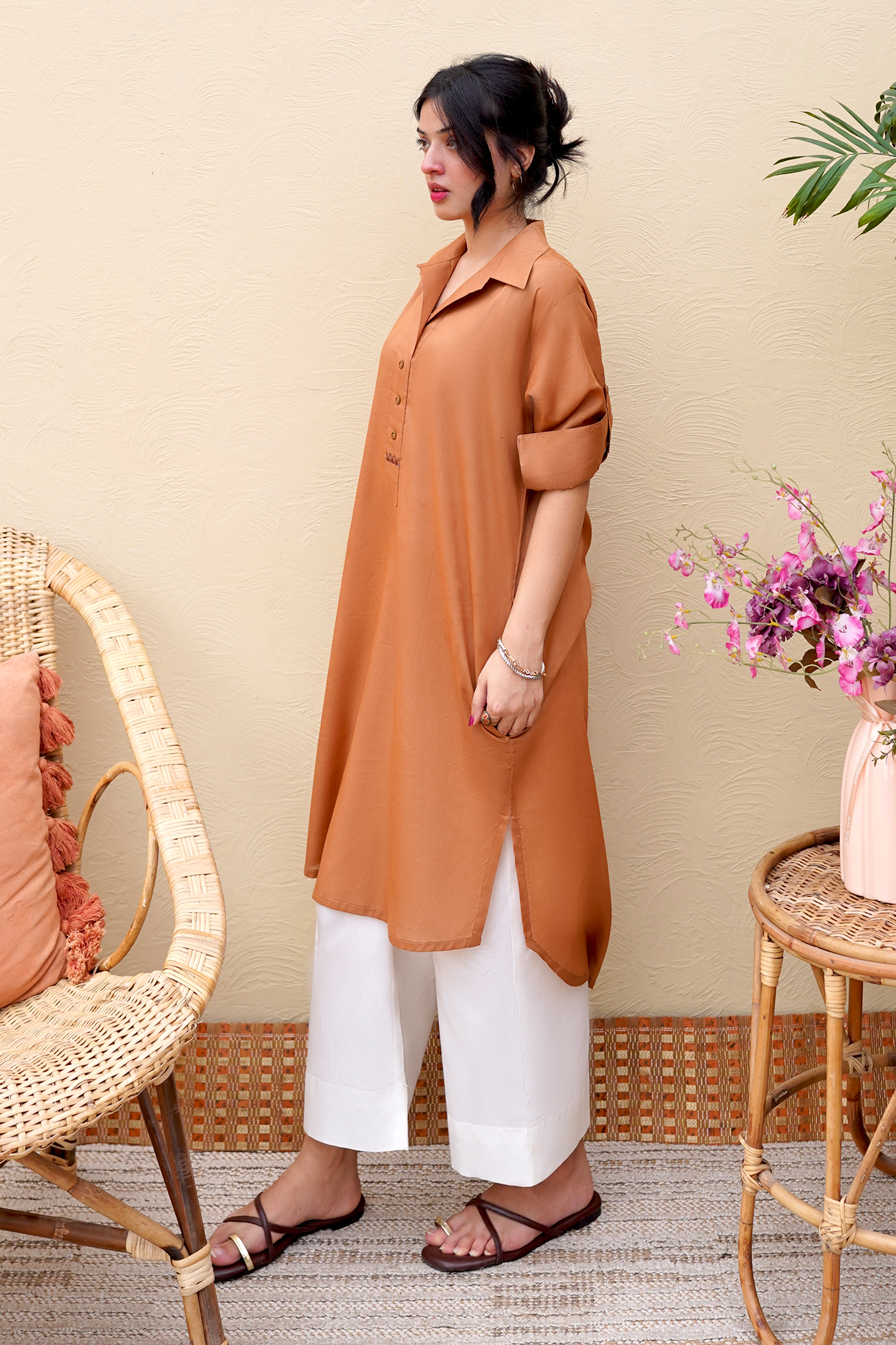Pecan brown collared kurta with loosely sitted sillehoute, a soft fall, buttoned neckline, rolled sleeves, and a tapered length, paired with white pants for an effortlessly breezy, staple look.