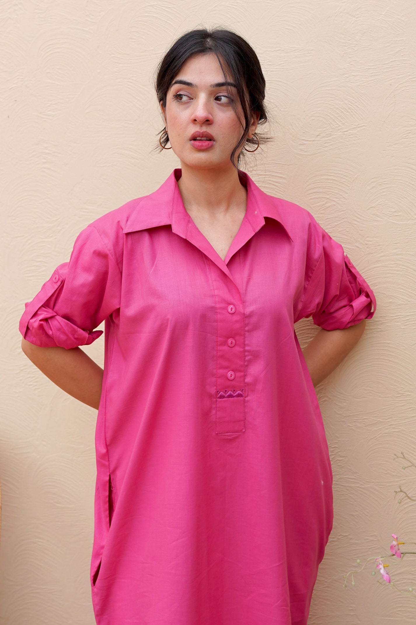 Rose-pink collared kurta with loosely sitted sillehoute, a soft fall, buttoned neckline, rolled sleeves, and a tapered length, paired with white pants for an effortlessly breezy, staple look.